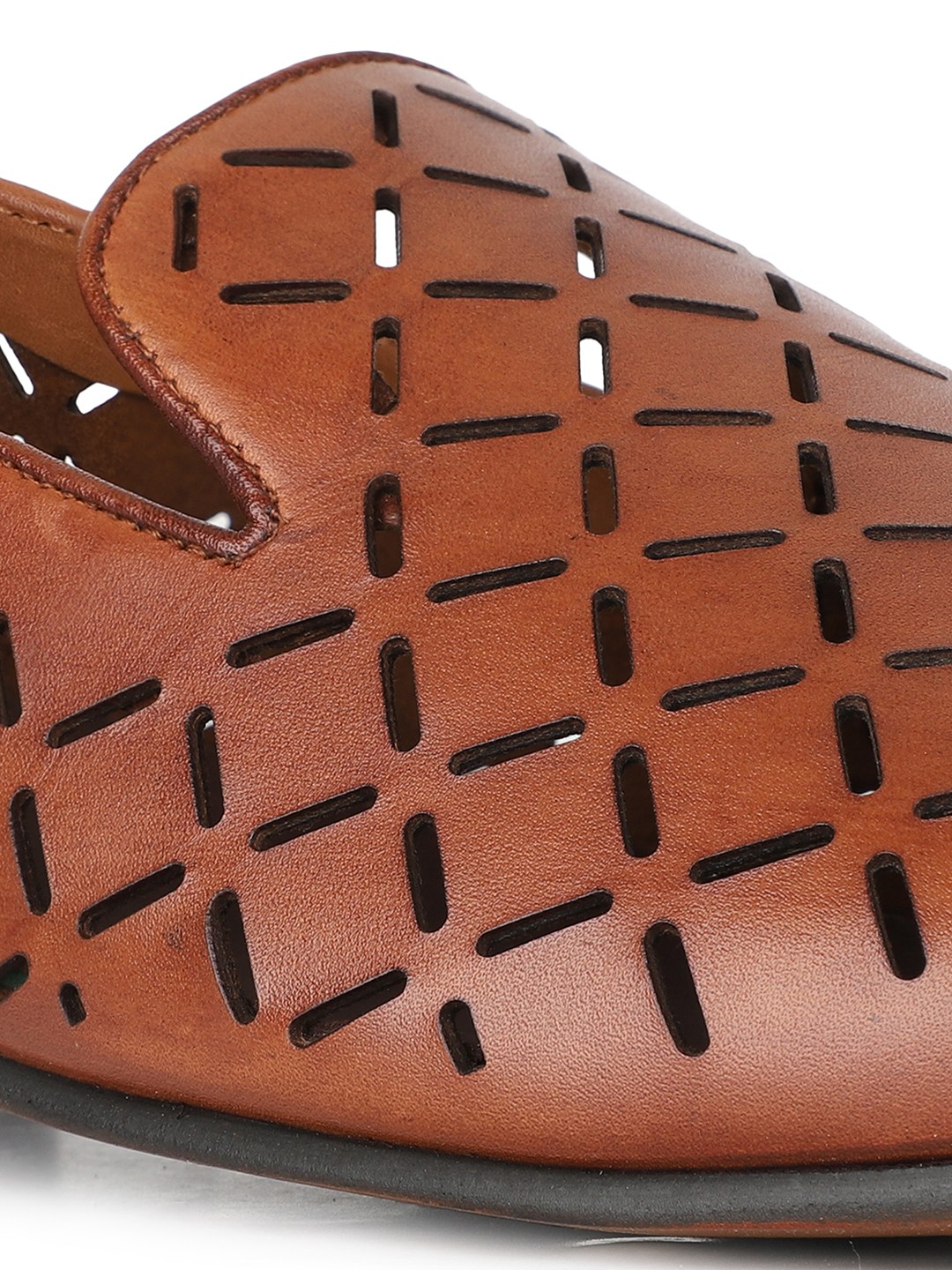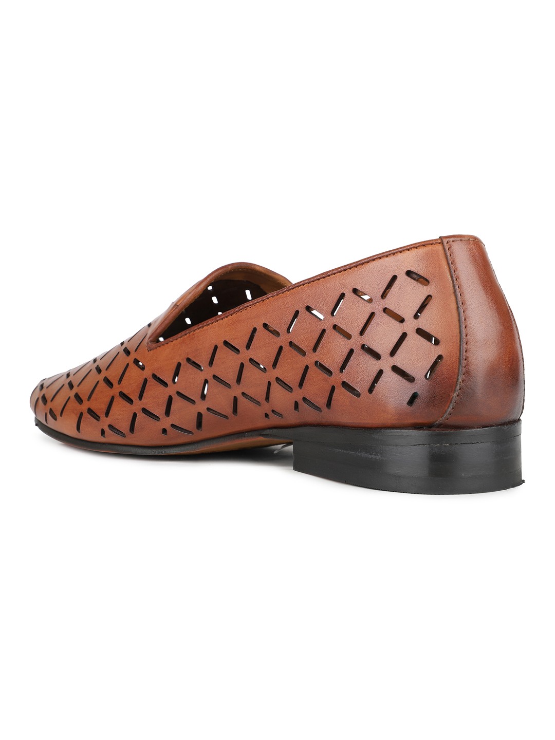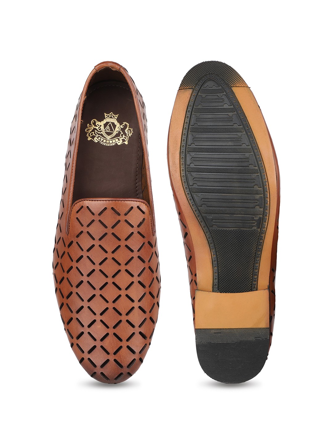 These men's tan casual round toe moccasins feature a modern geometric print. A stylish twist on tradition, they provide everyday comfort with a fresh edge.