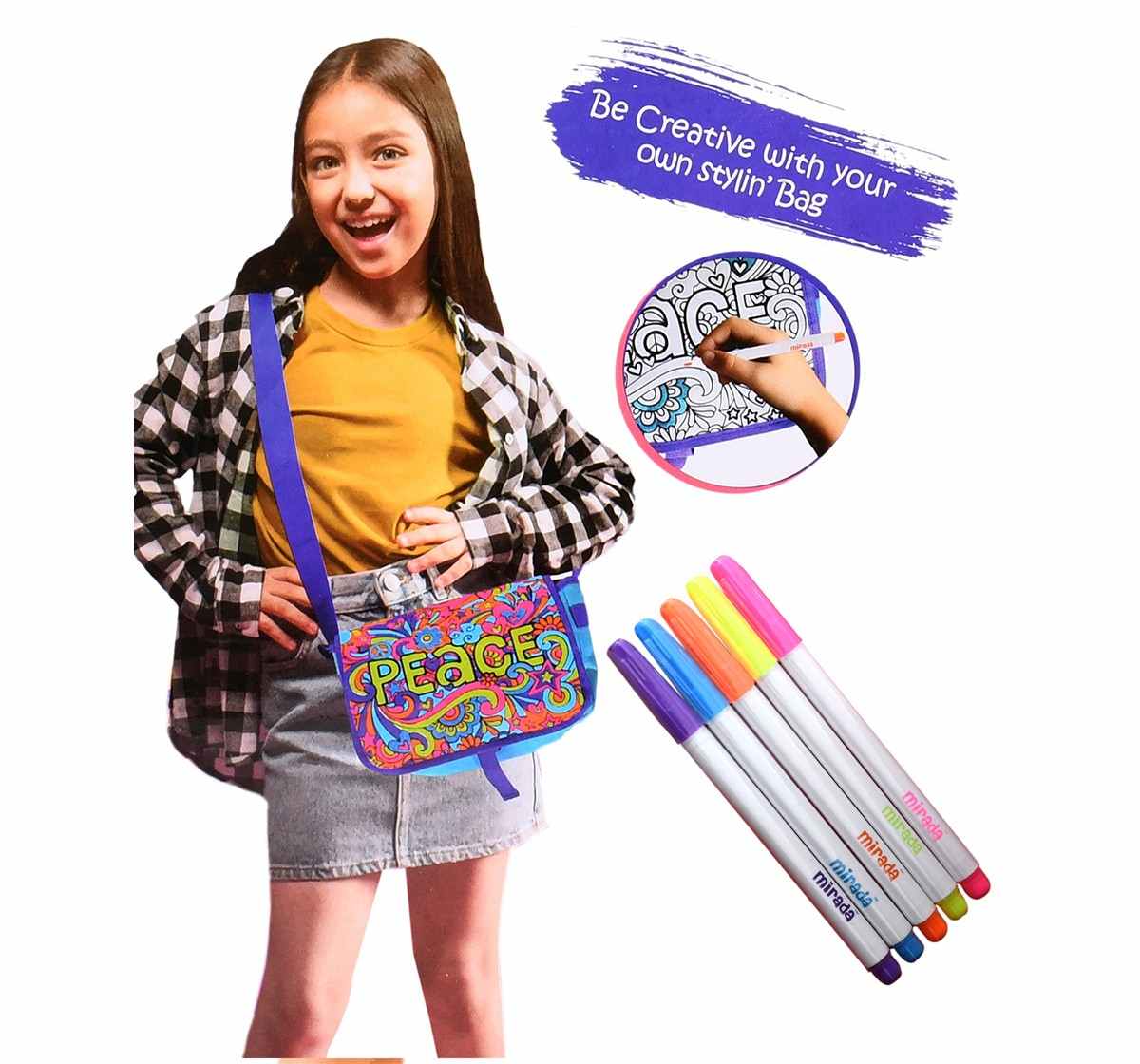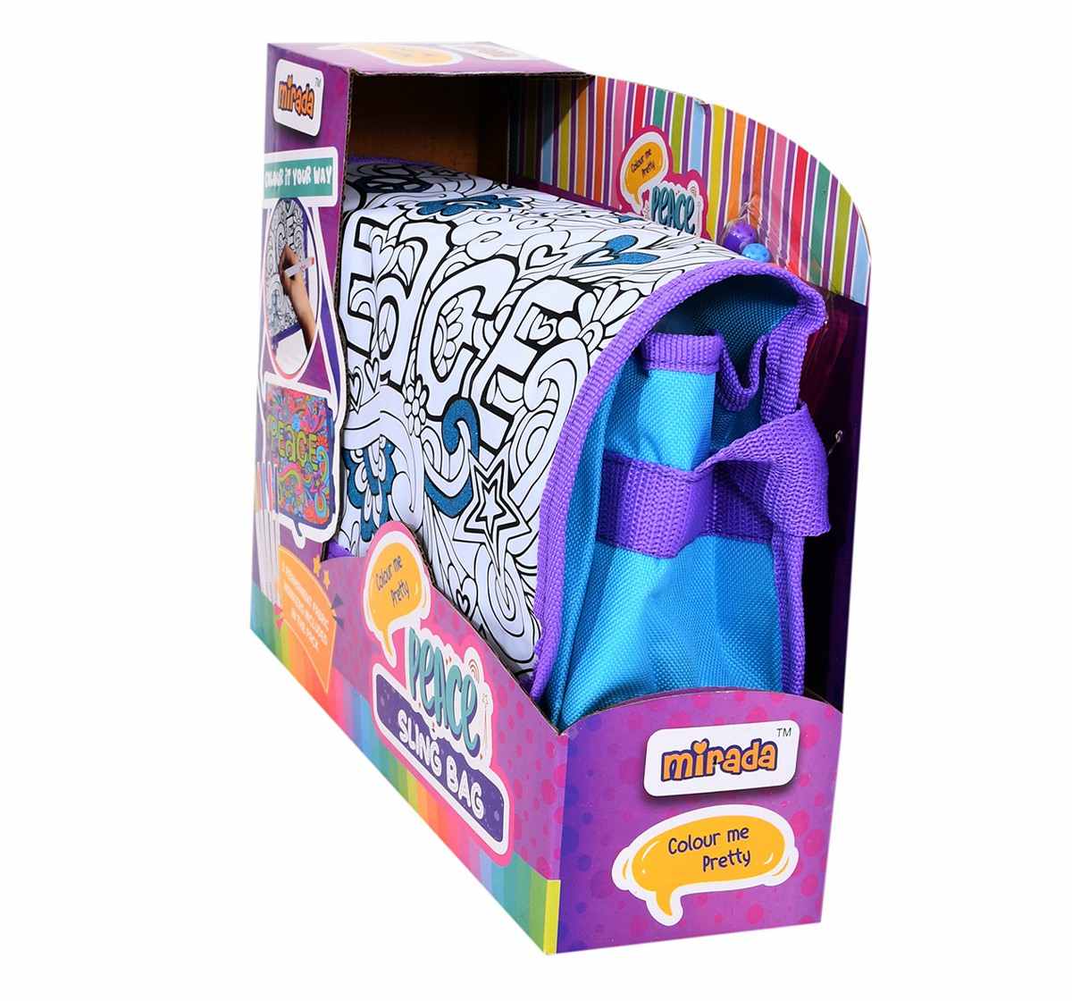 The Mirada Color Your Own Peace Sling Bag is a creative and engaging craft activity designed for children aged 3 and up. This kit includes a multicolored sling bag with a peace-themed design, providing an opportunity for young artists to unleash their creativity. The bag is crafted from 100% polyester, ensuring a wonderful, cuddly feel, making it perfect for hugging and snuggling.