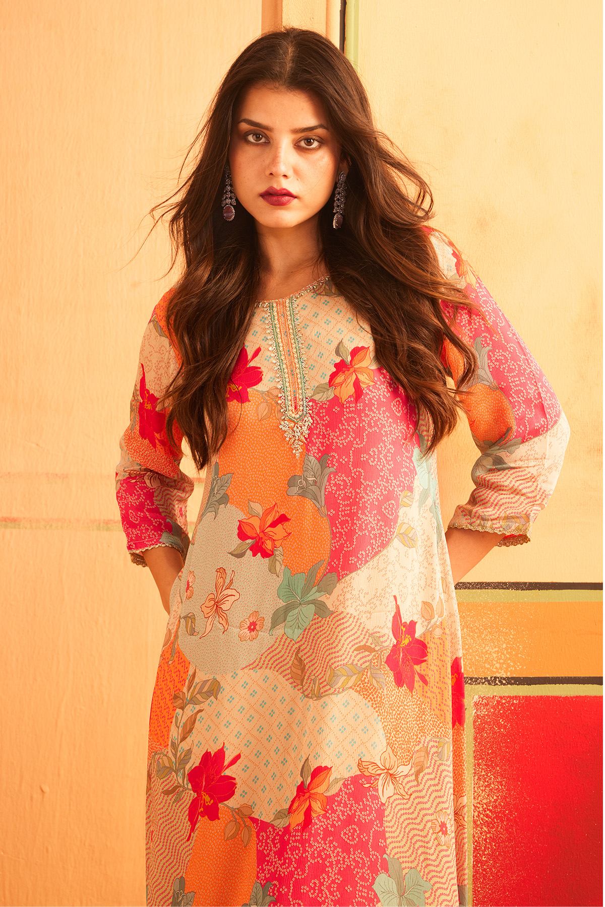 Elevate your wardrobe with our multi-printed yoke stone-work dress. featuring a round neck, three-quarter sleeves, and a graceful calf-length a-line hemline, this beautifully designed piece offers a flattering silhouette—perfect for effortlessly transitioning from casual outings to semi-formal occasions.