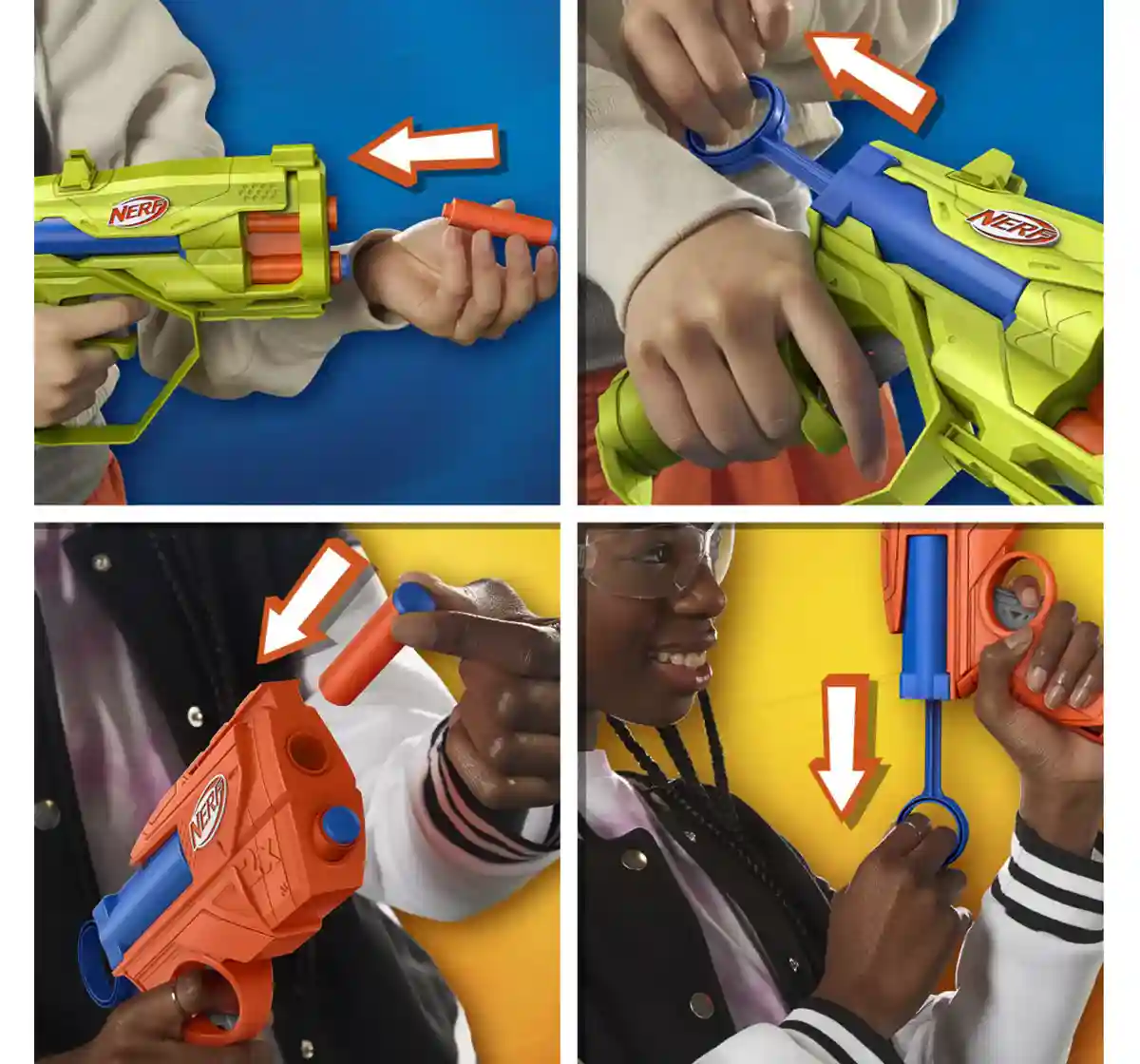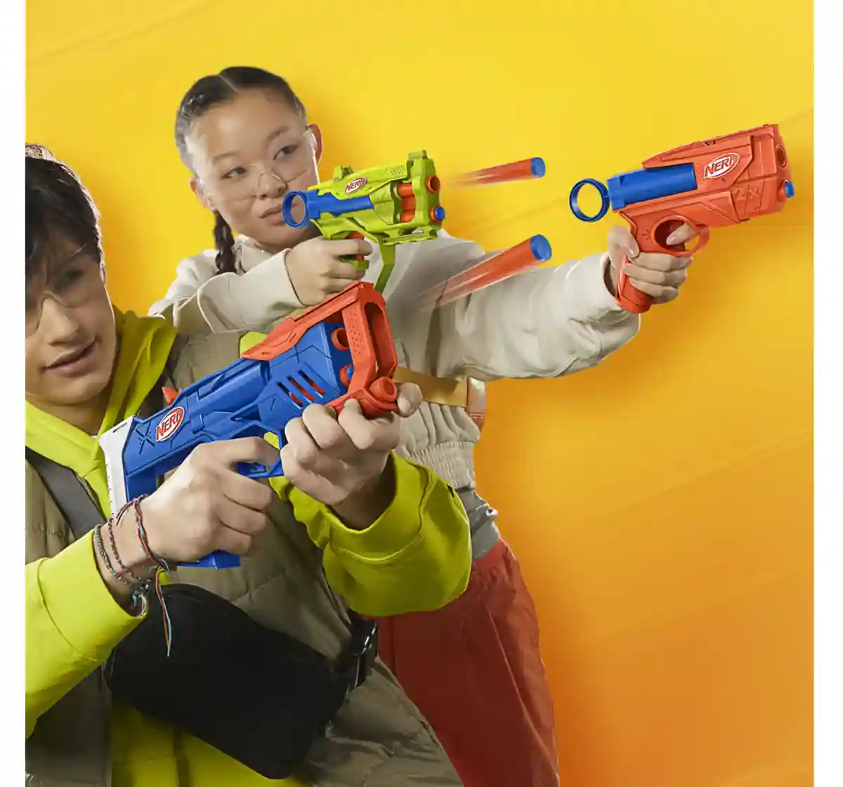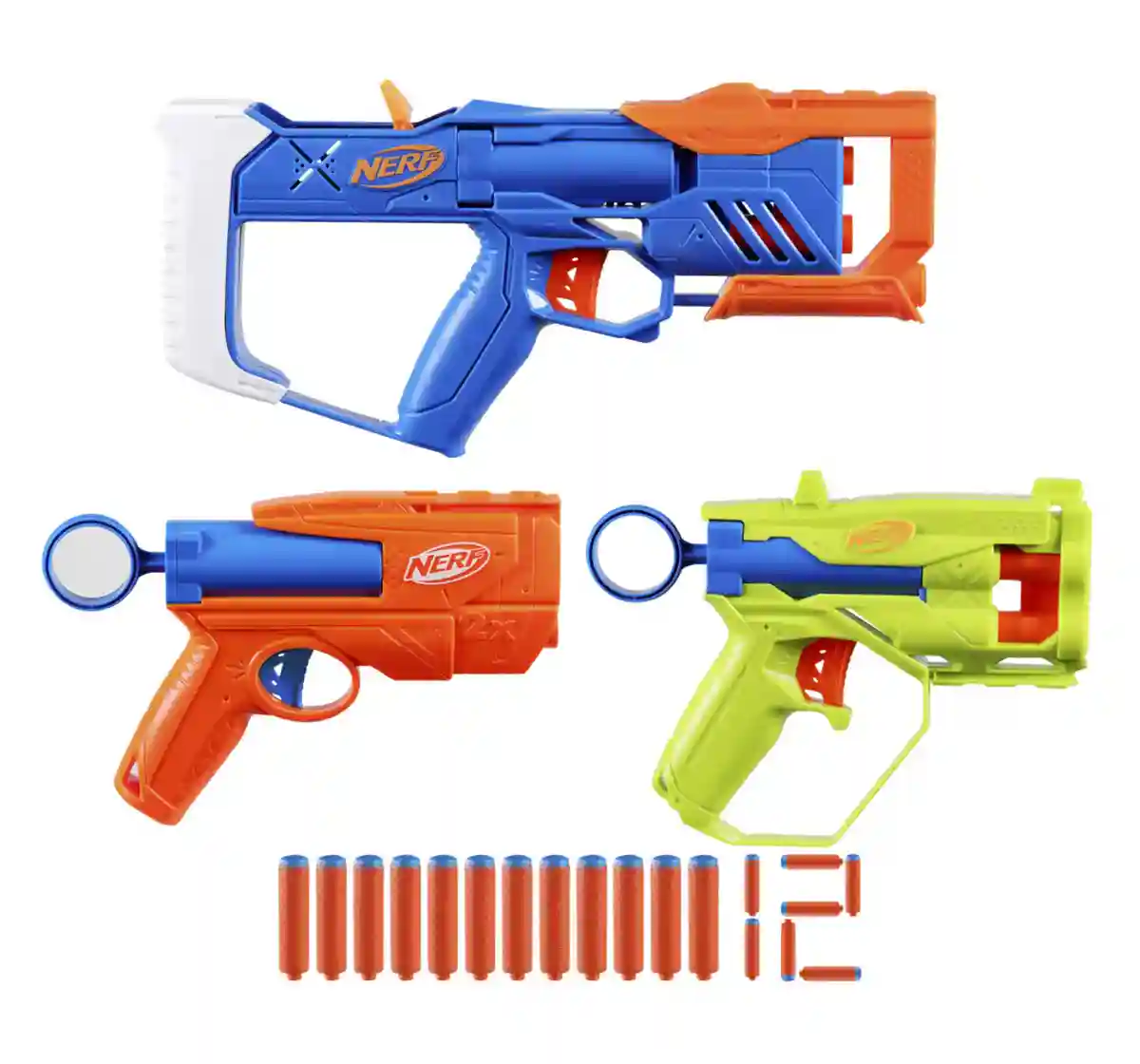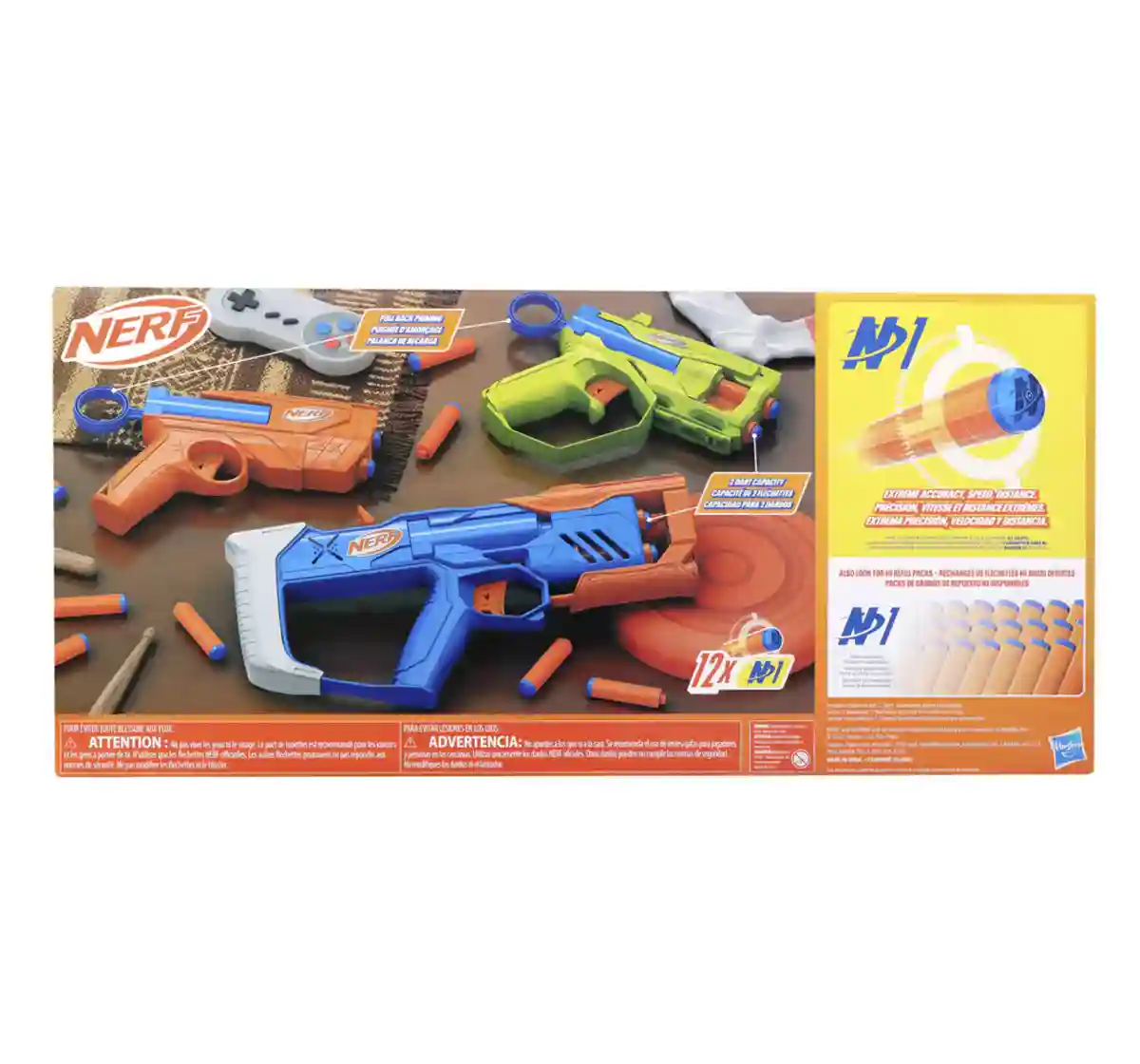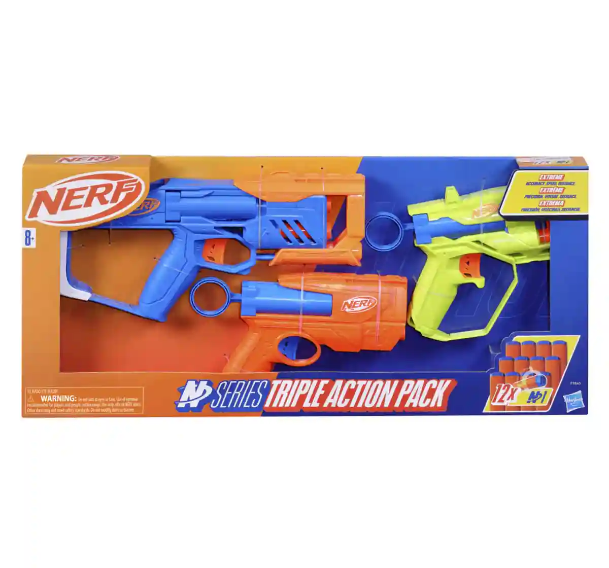 The Nerf brand levels up your game with high-performance Nerf N Series dart blasters and Nerf N1 darts! You have the skills as a Nerf battler, now you have the blasters and darts to gain a superior edge in indoor and outdoor play. From the creators of the foam dart, the Nerf brand unleashes the next evolution in foam dart blasting with Nerf N Series N1 darts, delivering EXTREME ACCURACY, SPEED, and DISTANCE! It’s triple the fun with the Nerf N Series Triple Action Pack! This set includes 3 different Nerf N Series blasters, each with its own cool style and colors, and comes with 12 Nerf N Series N1 foam darts. It’s an awesome pack to build your Nerf stockpile and have fun playing with different blasters every time you launch into Nerf games. Each blaster has easy pull-back priming, 2-dart capacity, and fires 1 dart at a time. Nerf N Series blasters are compatible only with Nerf N Series N1 darts. Eyewear recommended (not included). NERF and HASBRO and all related trademarks and logos are trademarks of Hasbro, Inc.