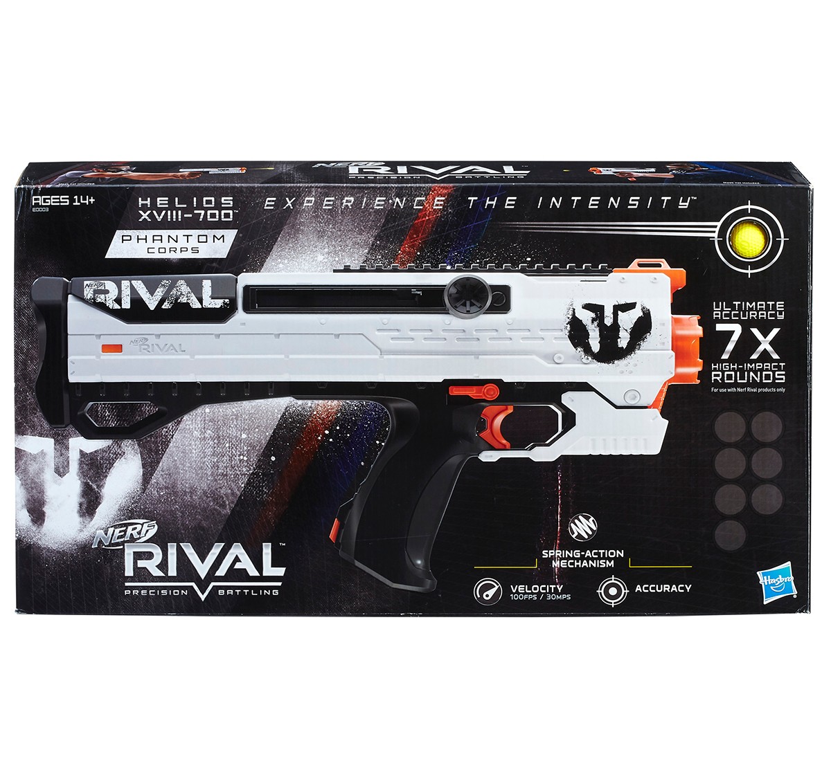 Phantom Corps is a group of rogue specialists who may join Team Red or Team Blue today, then challenge them tomorrow. NERF Rival battles will never be the same! | Slide the bolt to cock the Helios XVIII-700 blaster and unleash rounds at 100 feet per second (30 meters per second) at the opposing team! The blaster includes an easy-loading, 7-round magazine and 7 high-impact rounds | This NERF Rival blaster also has a trigger lock and tactical rail. It comes with red and blue flags that players can wear whenever they choose to join Team Red or Team Blue | Experience the intensity of NERF Rival with the NERF Rival Phantom Corps Helios XVIII-7500 blaster | Includes blaster, one 7-round magazine, 7 rounds, 2 flags, and instructions.