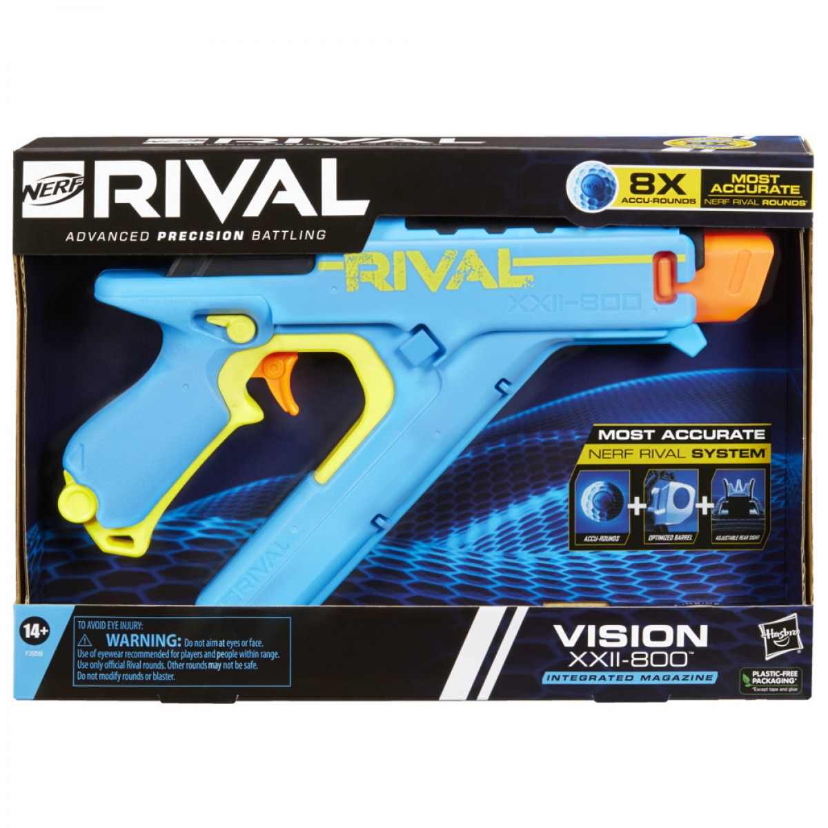 They're the most accurate Nerf Rival blasters and the most accurate Nerf Rival rounds ever*! The blasters have an adjustable rear sight to customize the configuration for improved aim. The barrel is optimized with a streamlined design engineered for enhanced performance. The blasters include Nerf Rival Accu-Rounds, which have an improved aerodynamic design and dimple patten to provide more consistent flight. The Nerf Rival Vision XXII-800 blaster has an 8-round integrated magazine, pull-back priming bar, and fires 8 rounds in a row at a velocity of 90 feet per second. The blaster has an edge-glow front sight and an adjustable rear sight which slides backward and forward and from side to side to improve the accuracy of your aim. Includes 8 high-impact Nerf Rival Accu-Rounds that are compatible with all Nerf Rival blasters. Includes trigger lock. Eyewear recommended (not included). No batteries required. Nerf and all related properties are trademarks of Hasbro.