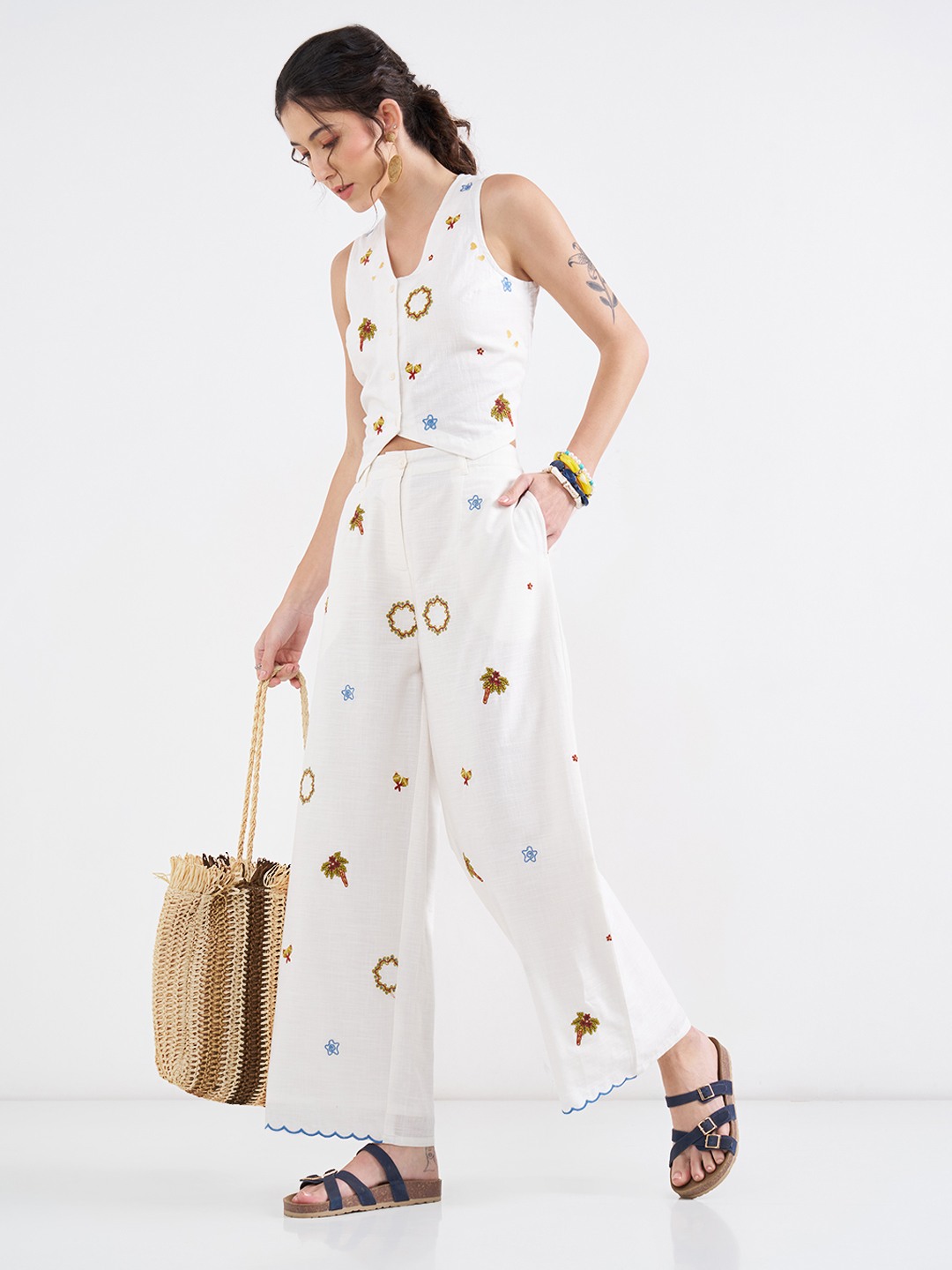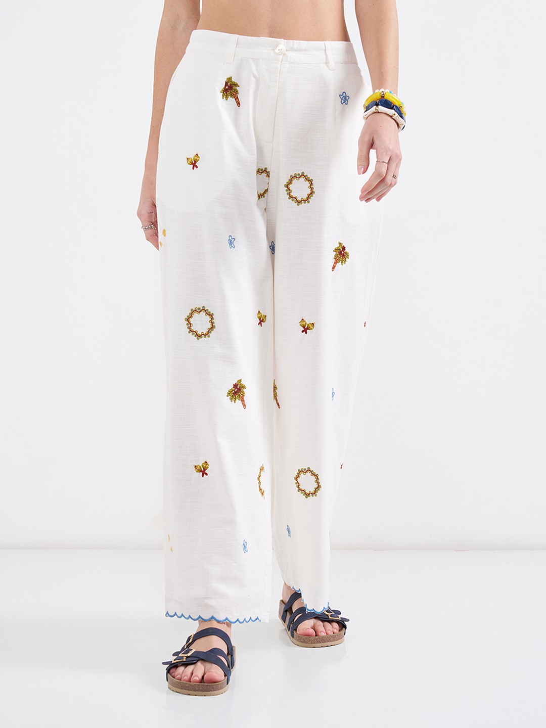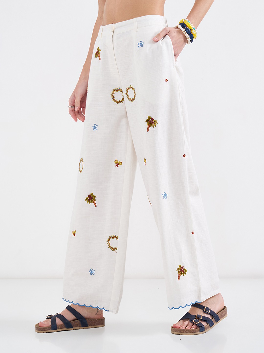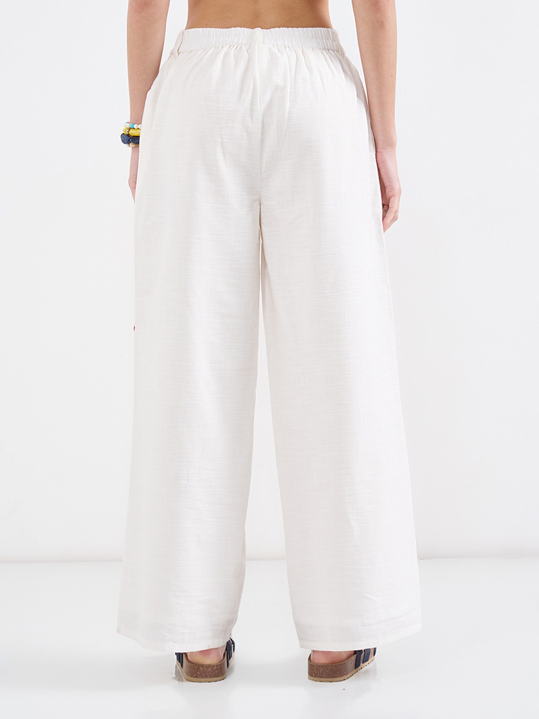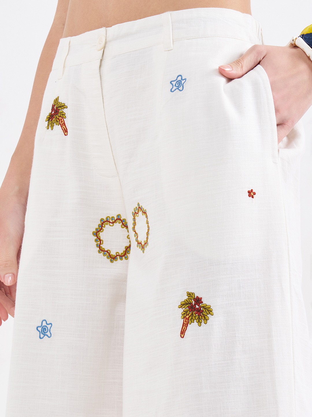 Look exceptionally chic wearing this pair! They feature an elasticated waistband with a front opening, pockets and vibrant motif embroidery. Stitched in the best quality fabric, it offers enhanced comfort and breathability.