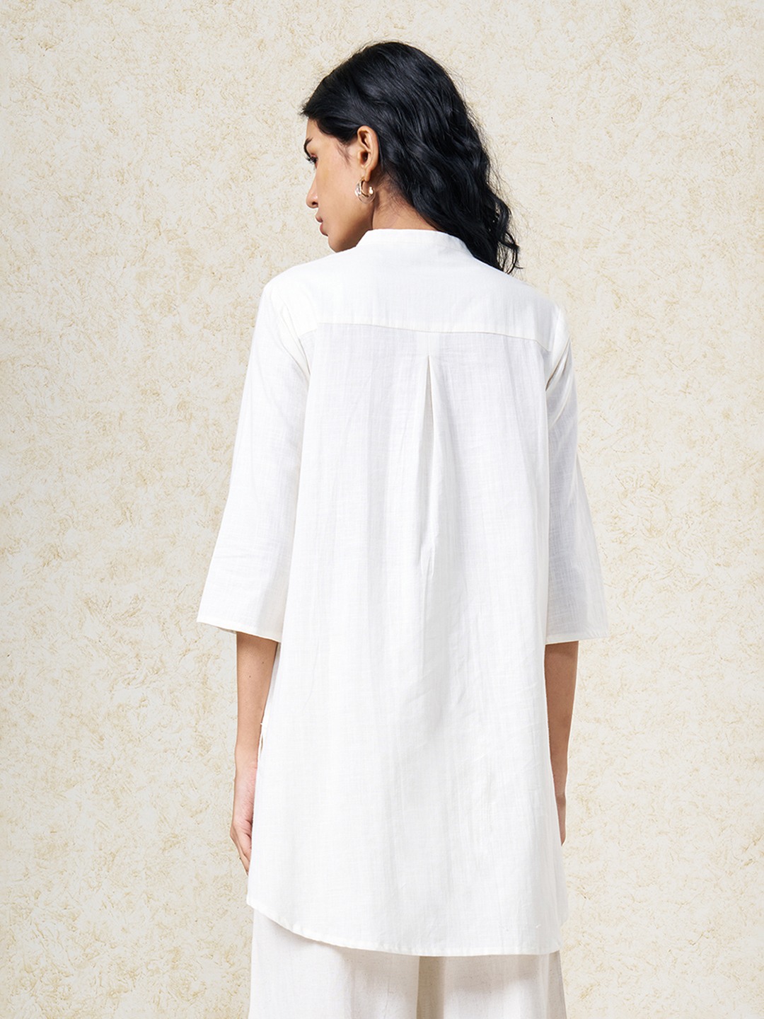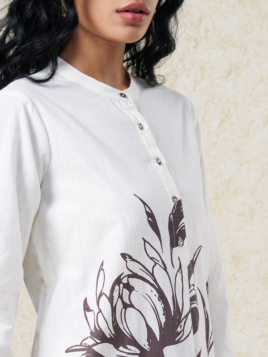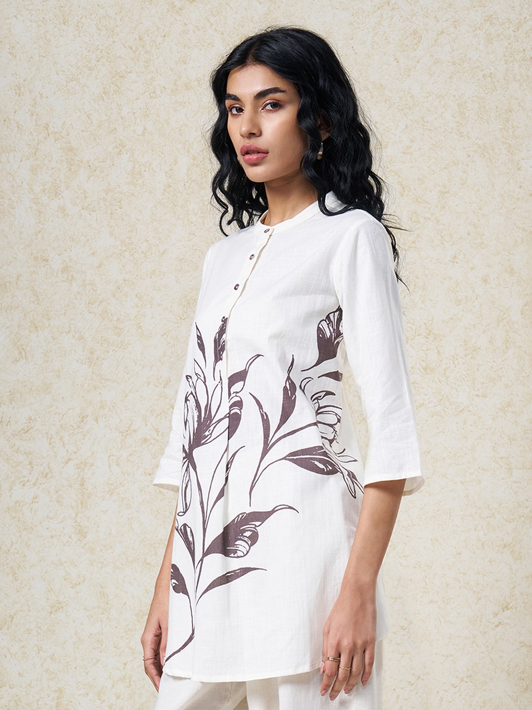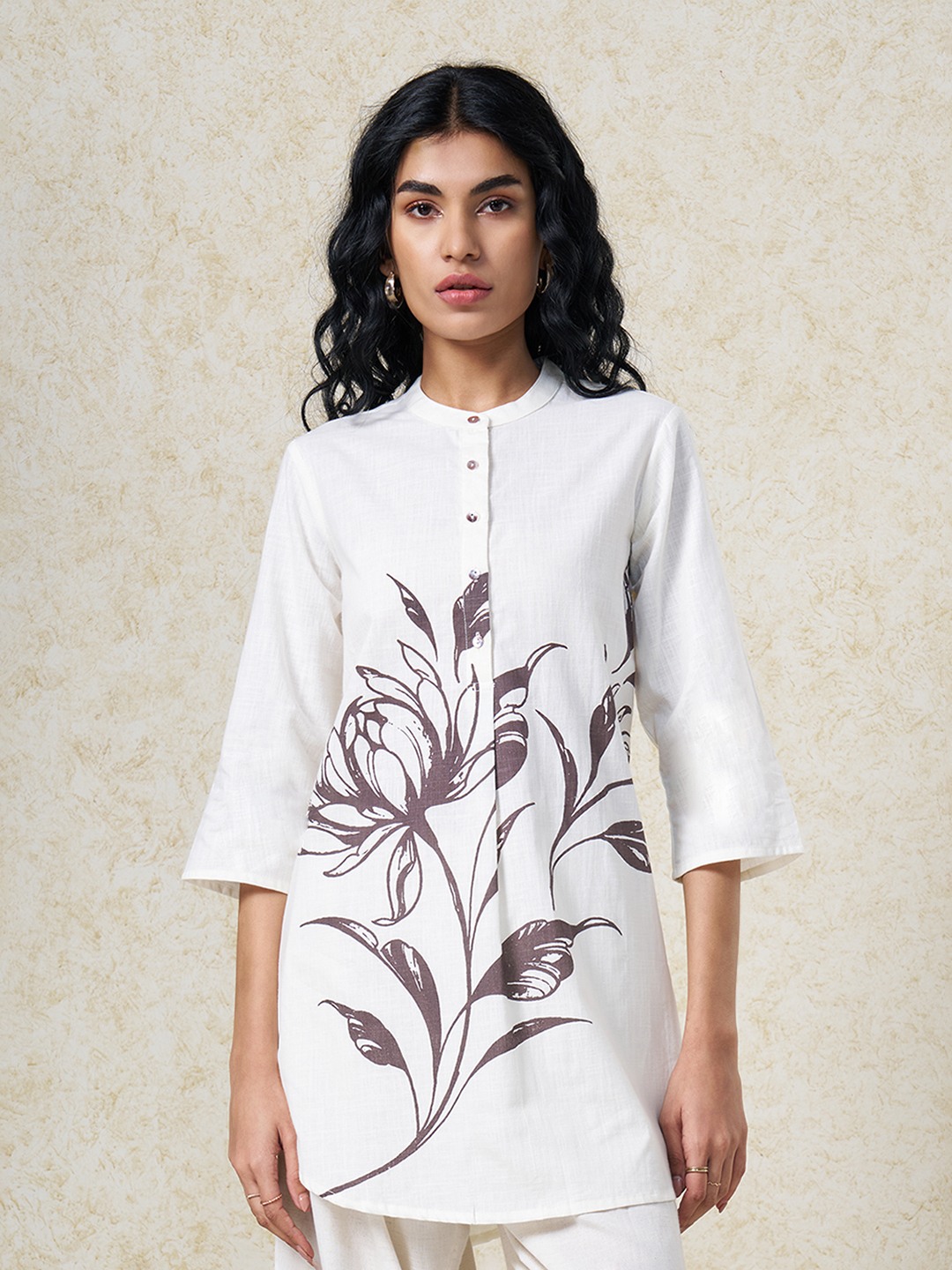 Soft tailoring meets intricate artistry in a refined silhouette. Designed with a mandarin collar, front button placket, and 3/4 sleeves, featuring statement floral placement that adds artistic focus. Lightweight woven construction offers a breathable hand feel with a smooth, graceful drape.