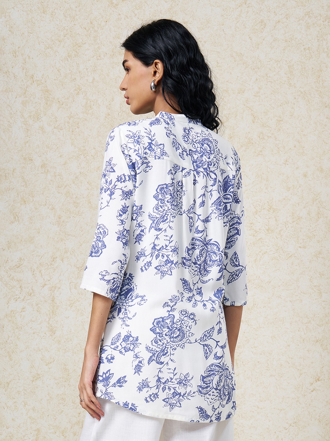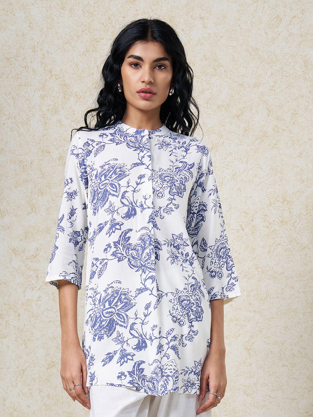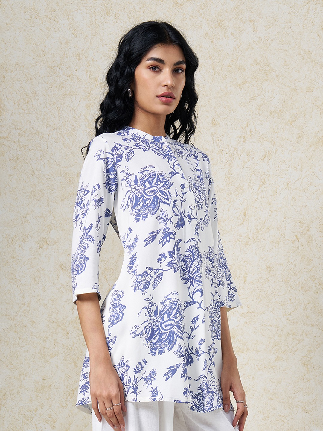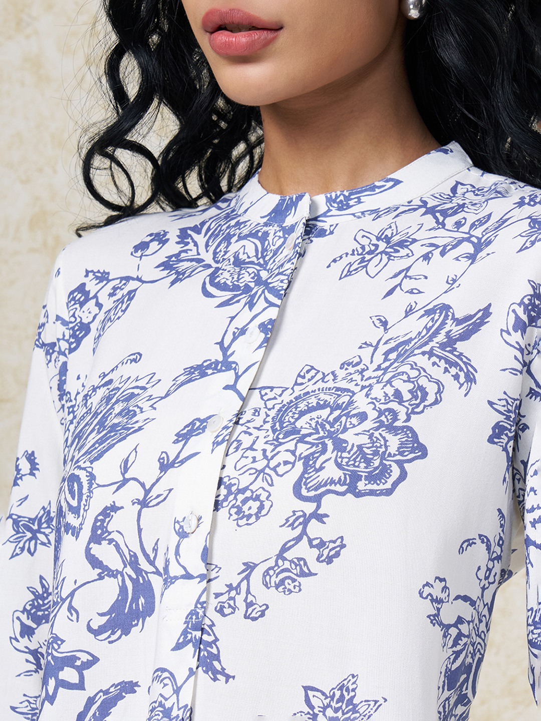 Crisp structure meets classic botanical detailing in a clean contemporary silhouette. Designed with a mandarin collar and concealed placket, finished with 3/4 sleeves and featuring an all-over floral print. Lightweight woven construction offers a breathable hand feel with a smooth, easy drape.