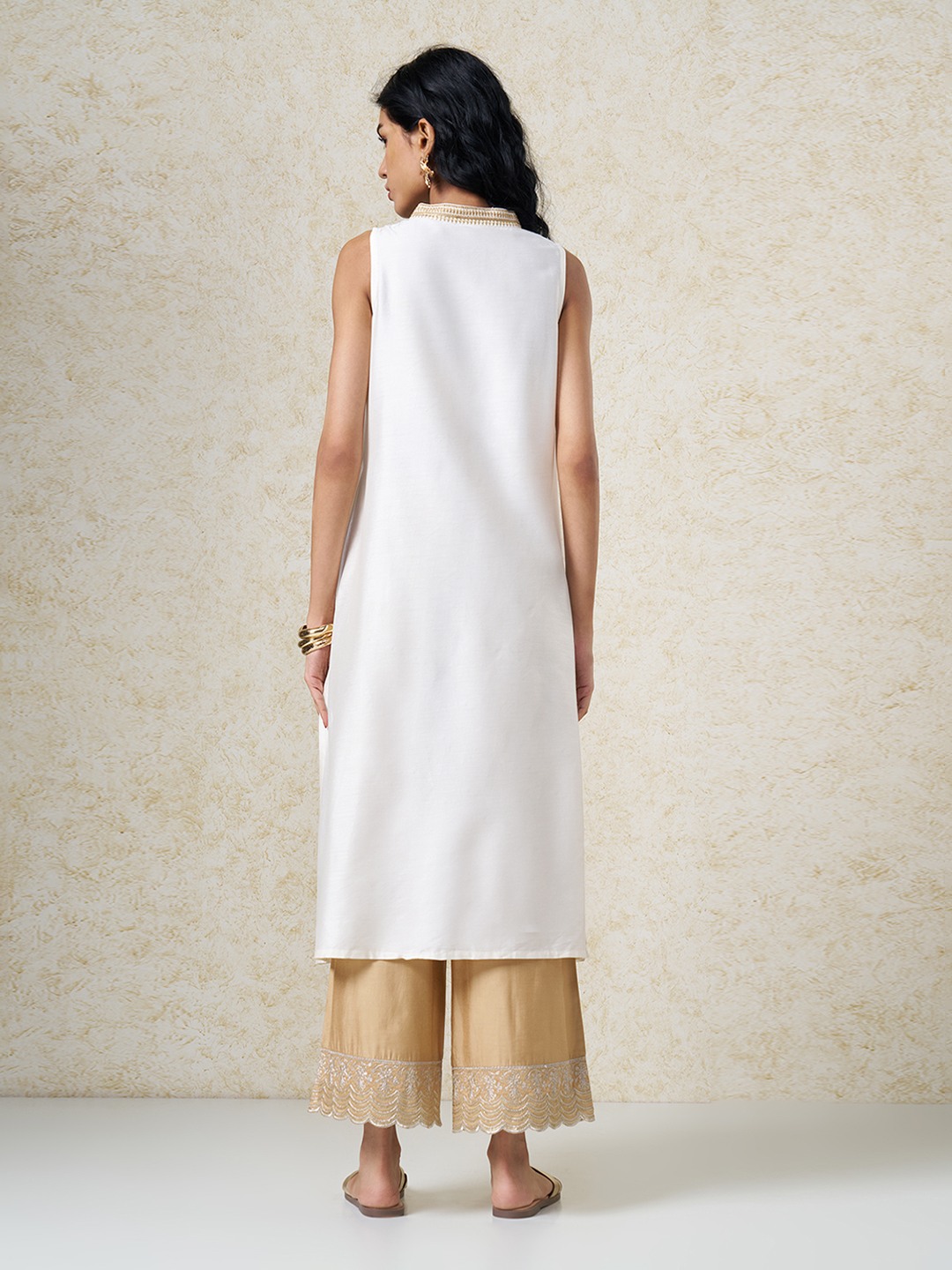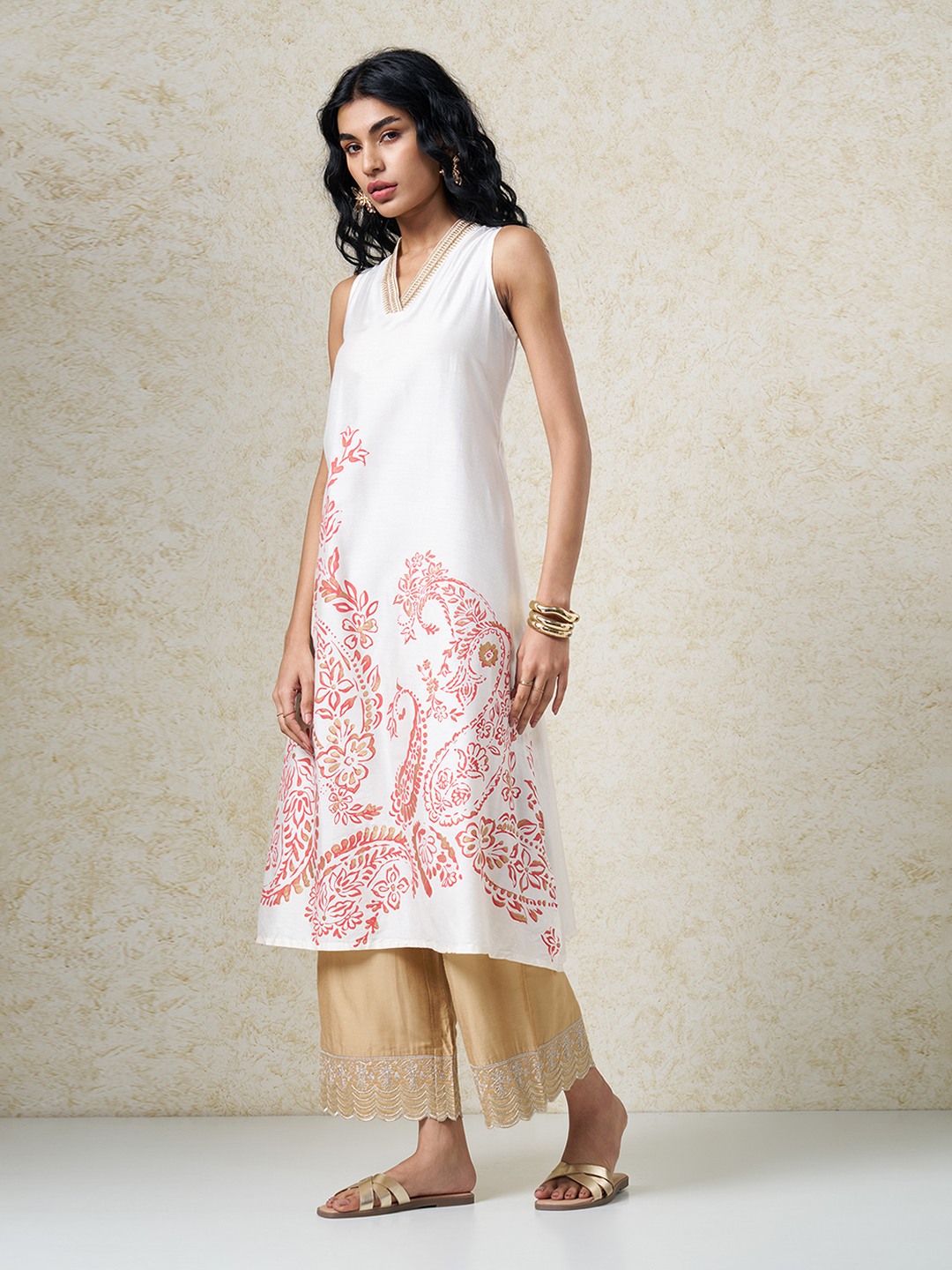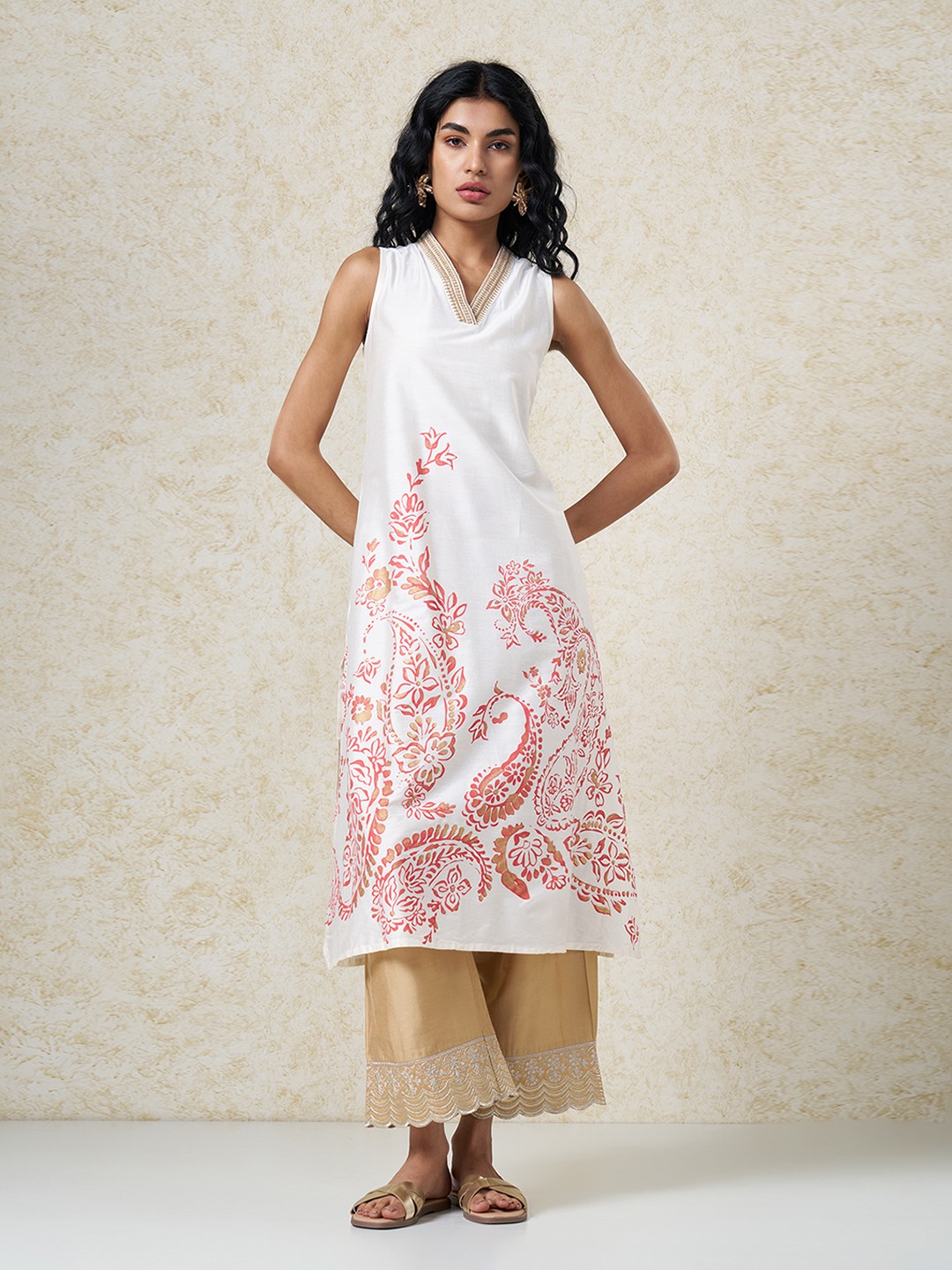 Fluid elegance meets ornate detailing in a softly elongated silhouette. Designed with a V-neckline finished with embellished trim and a sleeveless cut, highlighted by intricate paisley and floral placement print concentrated along the hem. Lightweight woven construction offers a smooth, breathable hand feel with an easy, graceful drape.