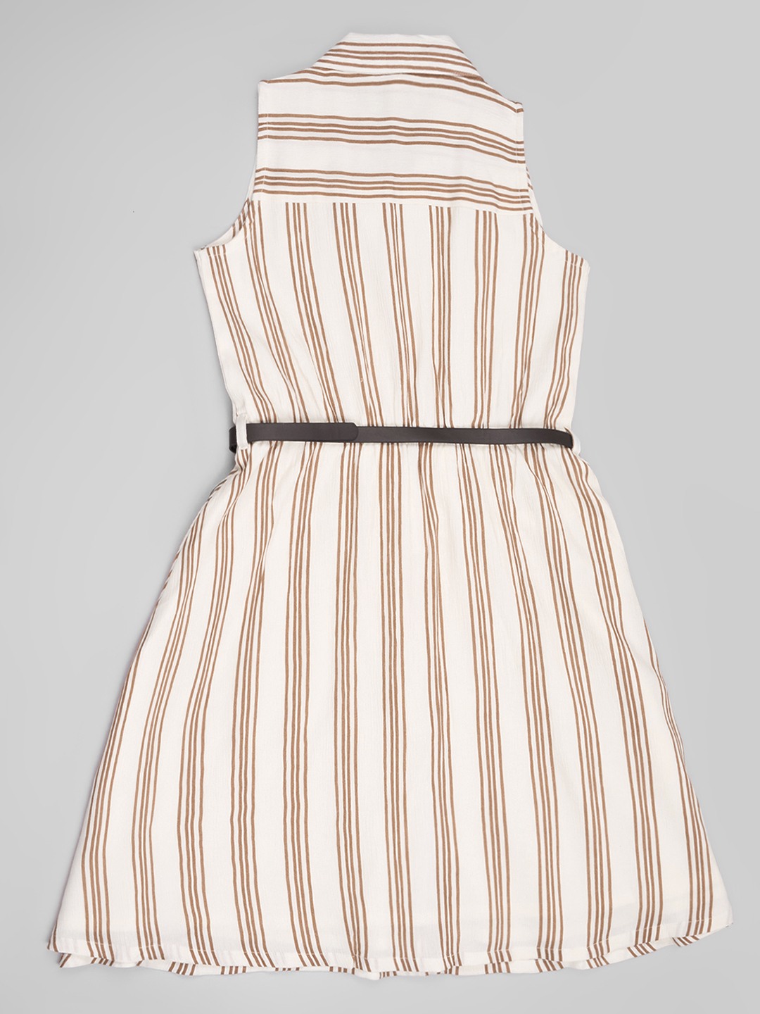 Easy summer elegance defines this sleeveless shirt dress with a clean, structured silhouette. Designed with a collared V-neckline and a button-up front, it features vertical stripe detailing and a slim belt at the waist to gently shape the fit. The lightweight woven fabric keeps it breathable while maintaining a polished drape.