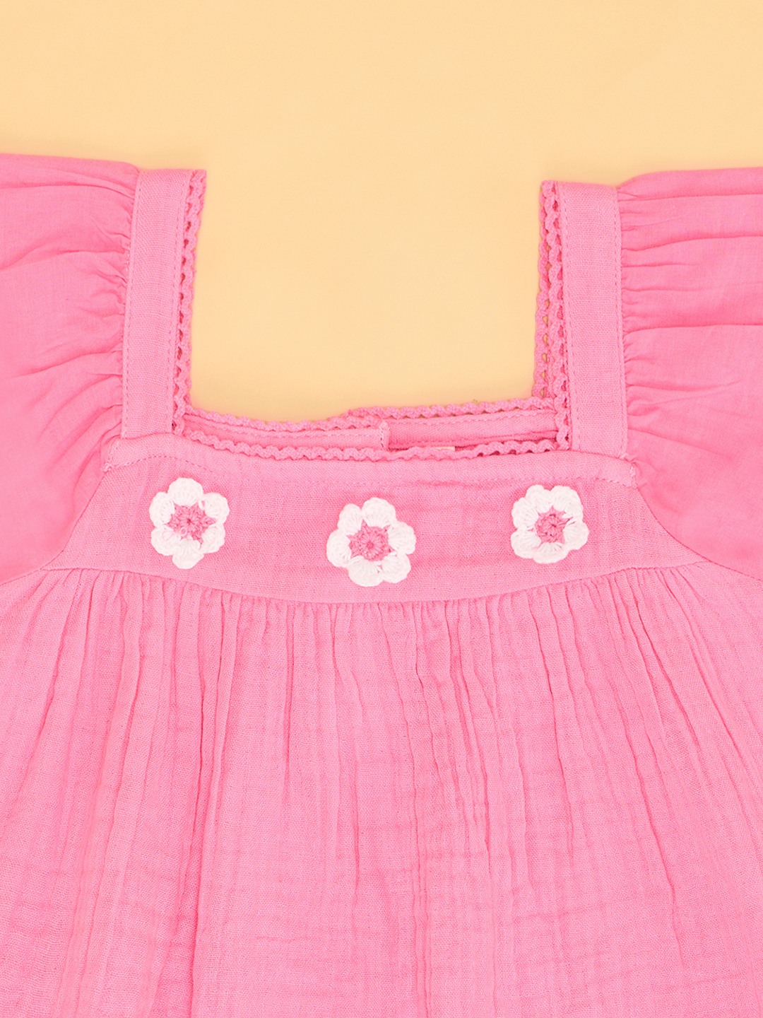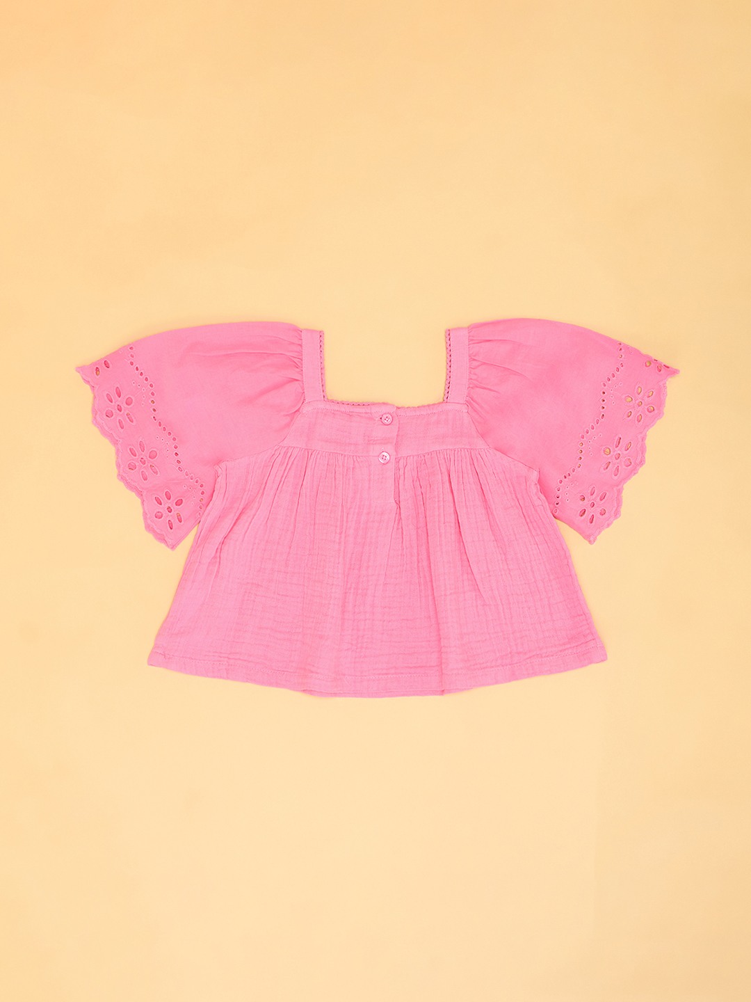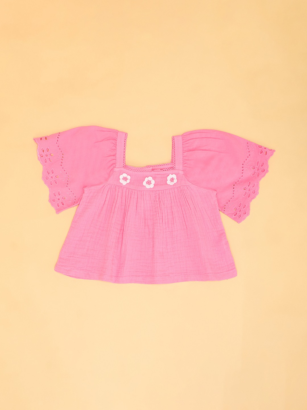 This top is perfect for all your kid's outings. The design deets are a square neckline with a button placket, cut-work detailed flared sleeves and floral appliques. Crafted from a textured fabric that lends utmost comfort and a fantastic look.