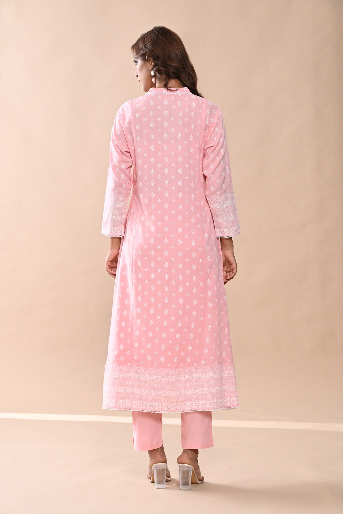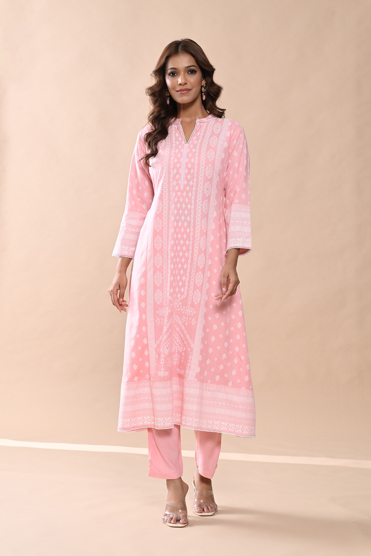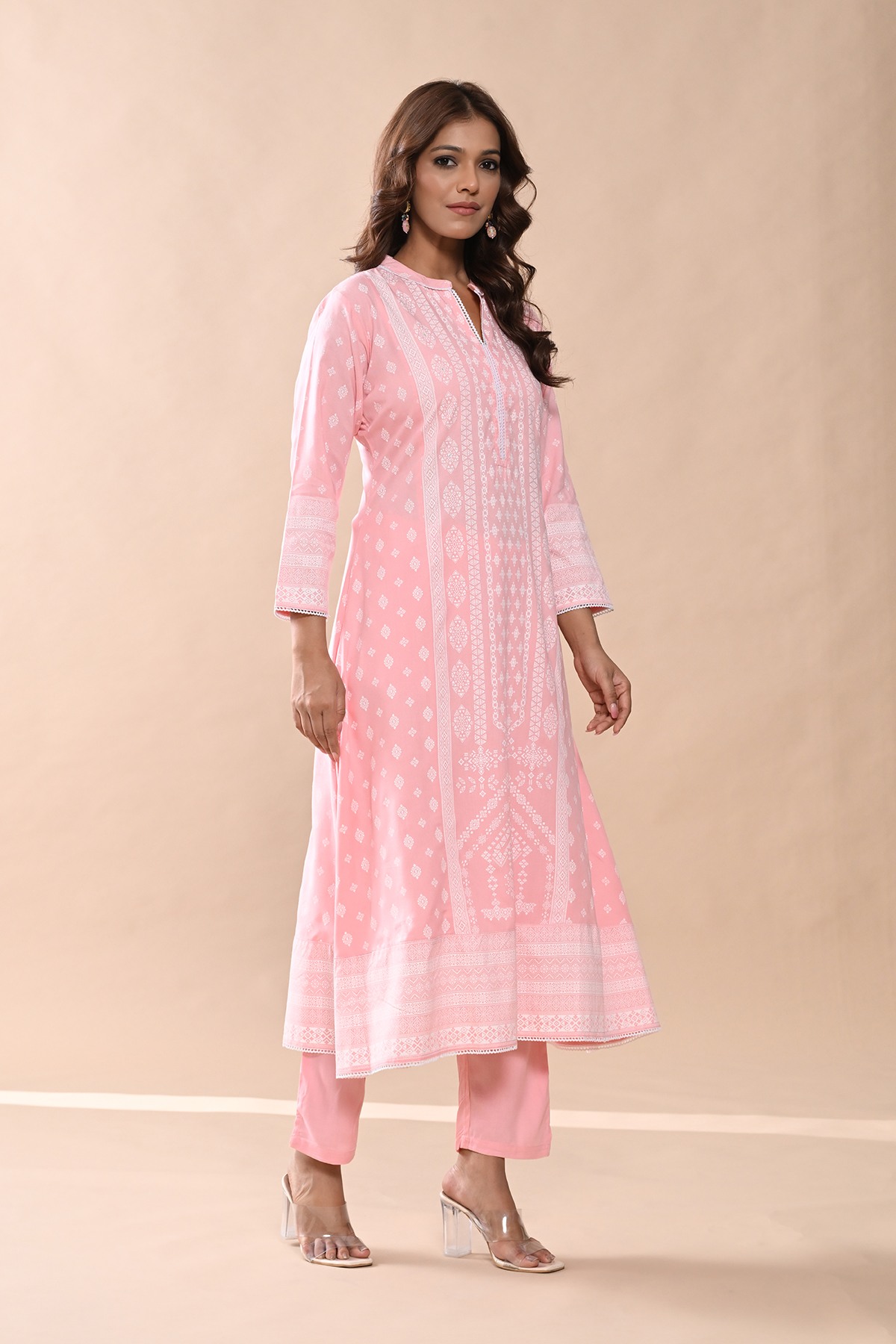 Elegant and stylish, this peach printed kurta set features a mandarin neck, three-quarter sleeves, a a-line hemline, and side slits. paired with matching pants, it offers a comfortable yet sophisticated look, perfect for casual and semi-formal occasions.