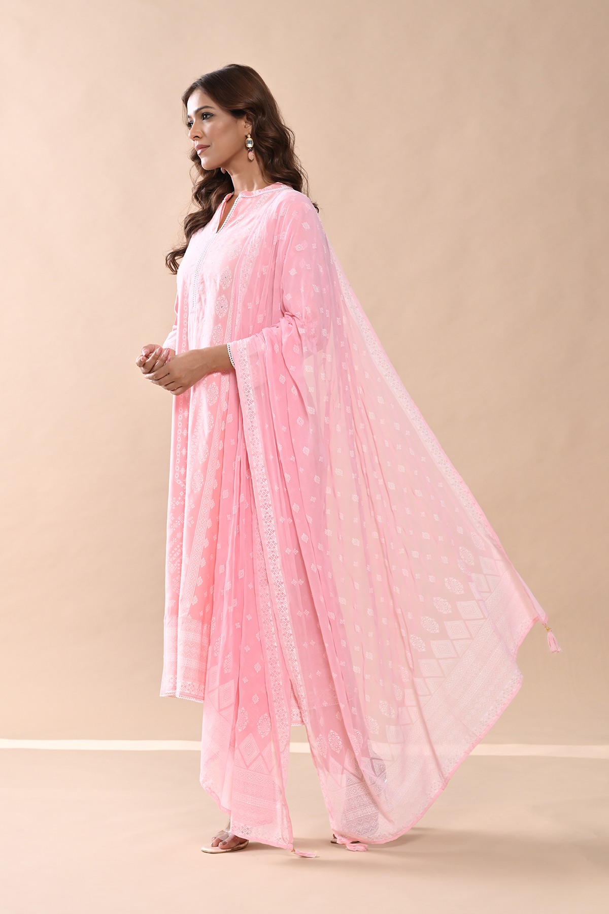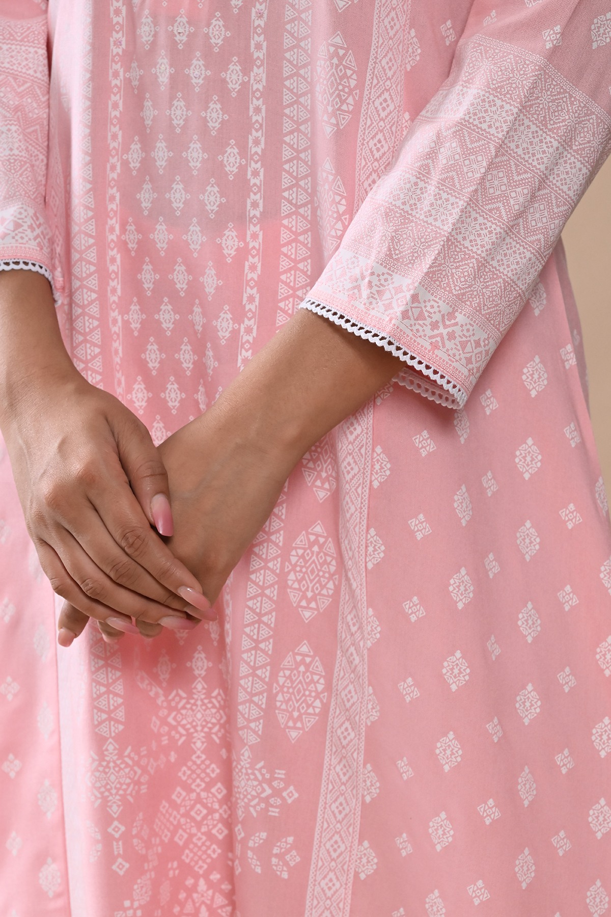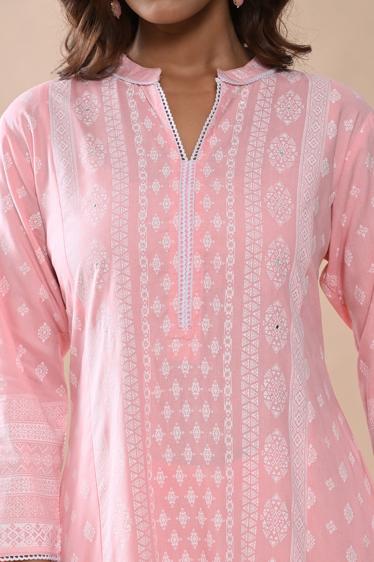 Elegant and stylish, this peach printed kurta set features a mandarin neck, three-quarter sleeves, a a-line hemline, and side slits. paired with matching pants, it offers a comfortable yet sophisticated look, perfect for casual and semi-formal occasions.