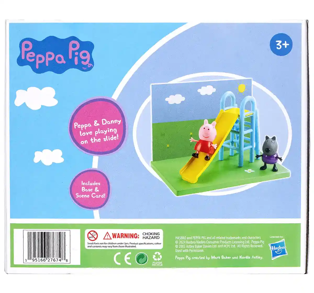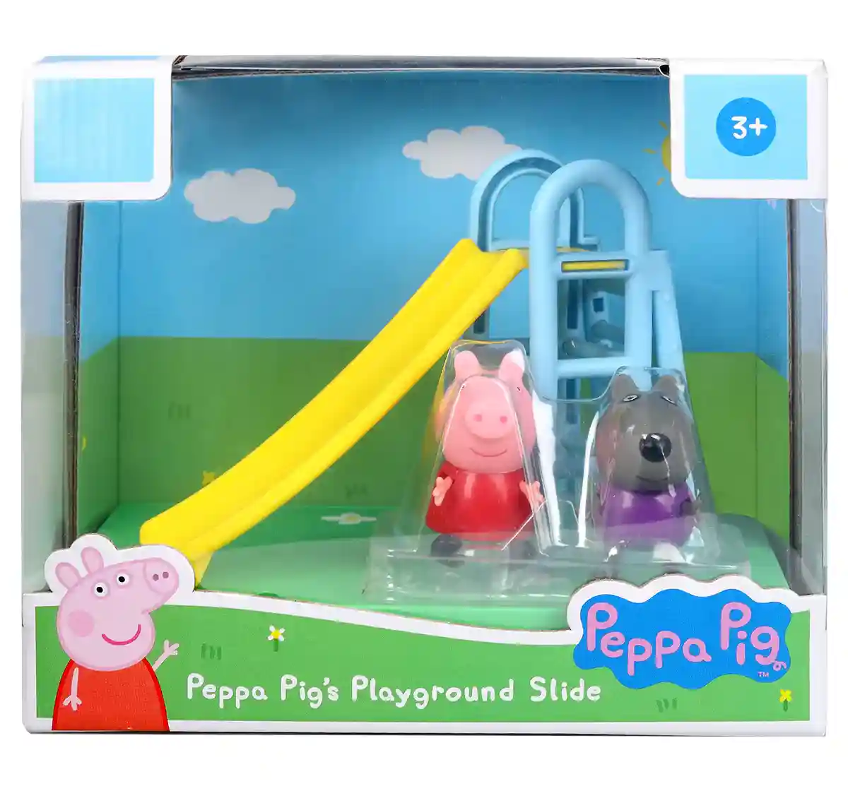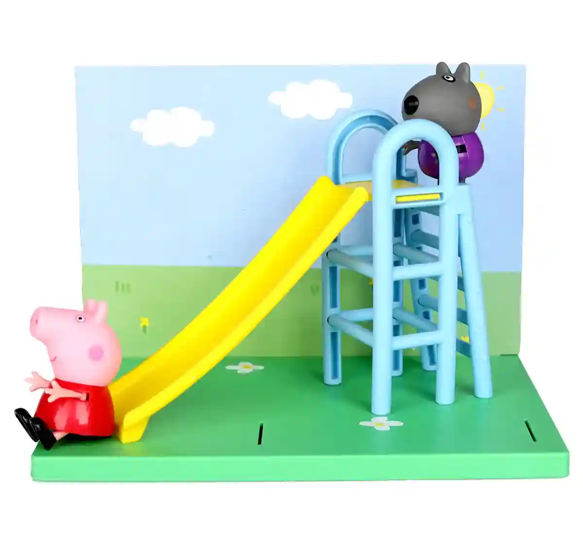 The oinktastic Peppa Pig's Playground Slide themed playset with Peppa Pig and Danny Dog figures, includes 2 figures and playground slide accessory created on a 3-inch scale! Includes poseable Peppa Pig and Danny Dog figures, playground slide and background scene card inspired by the show as seen on TV. Kids ages 3 and up will love imagining great outdoor fun with their little hands!