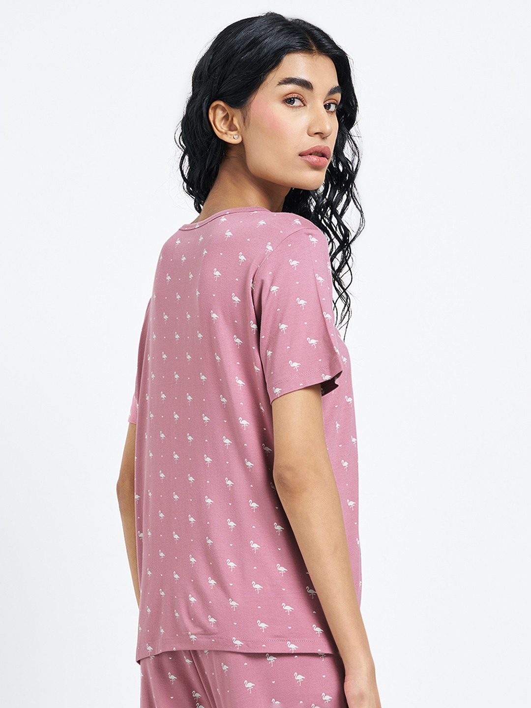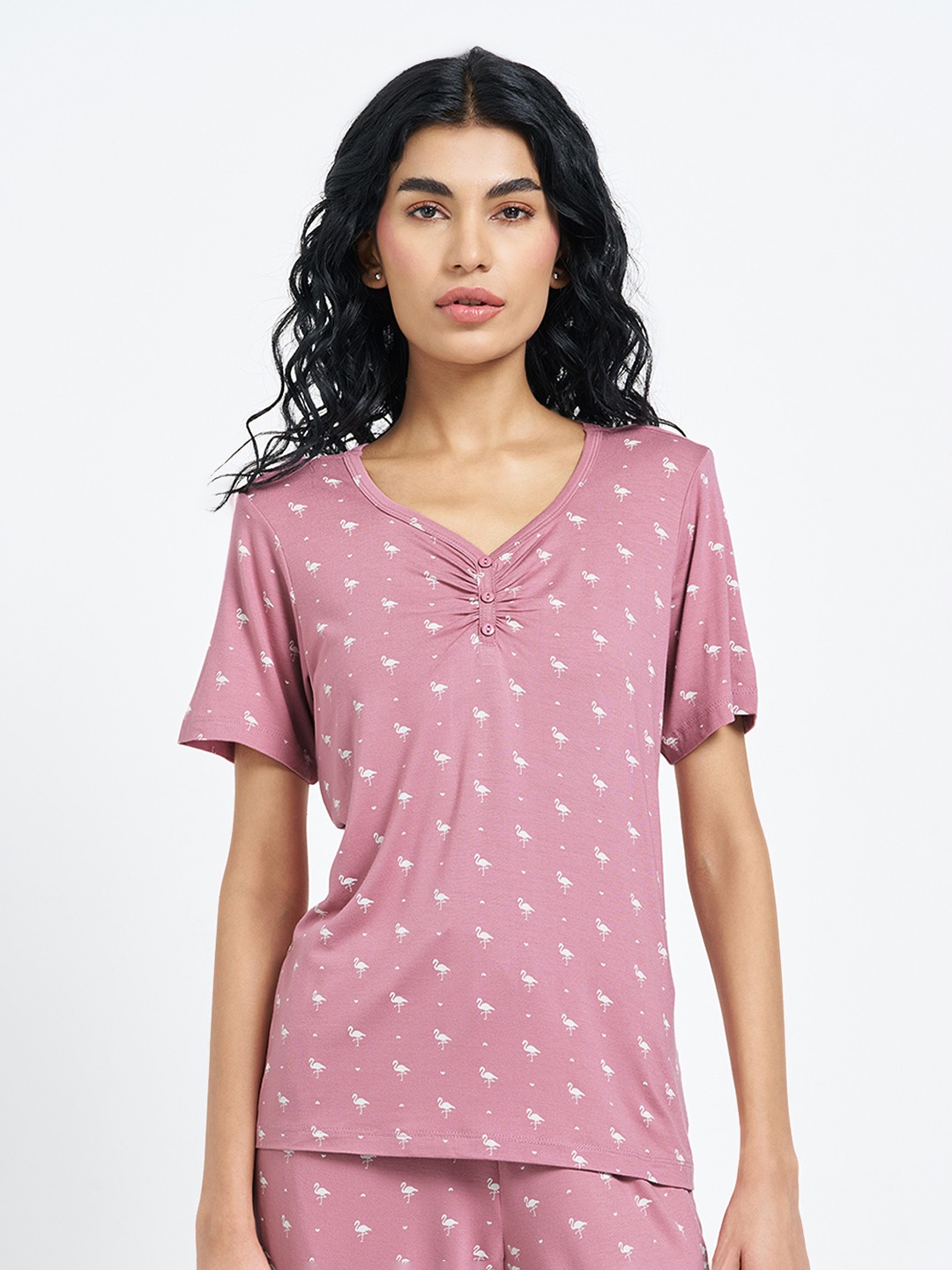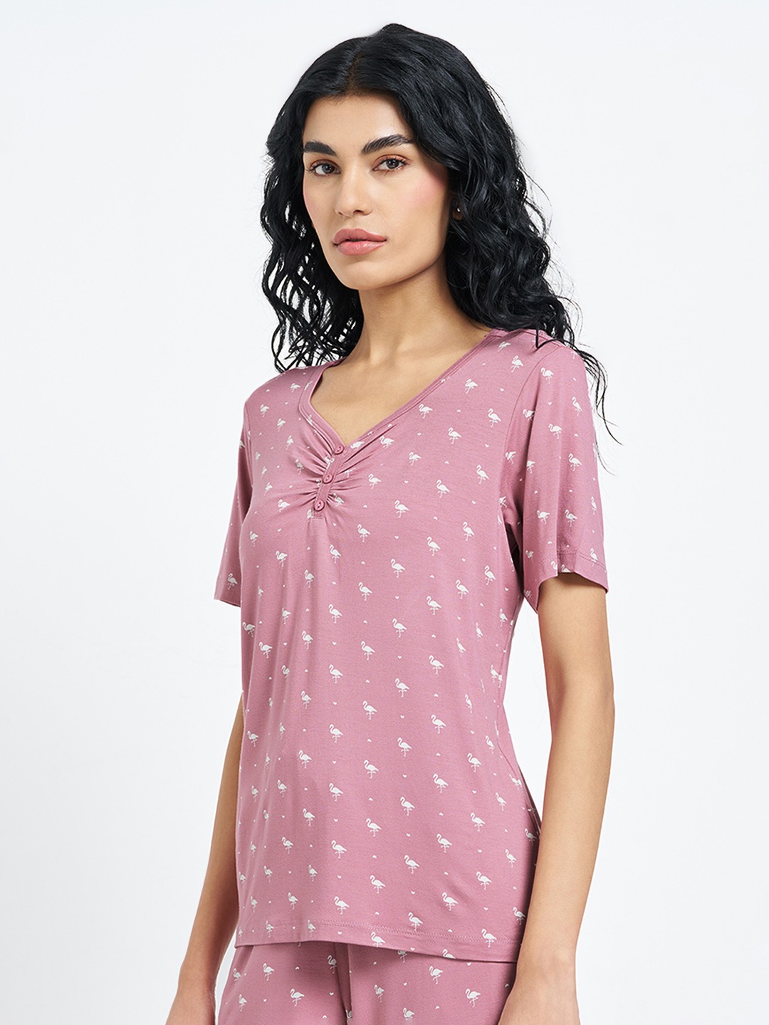 Playful prints lend this sleepwear essential a relaxed charm. Designed with a V-neckline and short buttoned Henley placket, it features half sleeves and delicate flamingo motifs throughout. Soft knit construction keeps the feel breathable and comfortable for restful sleep.