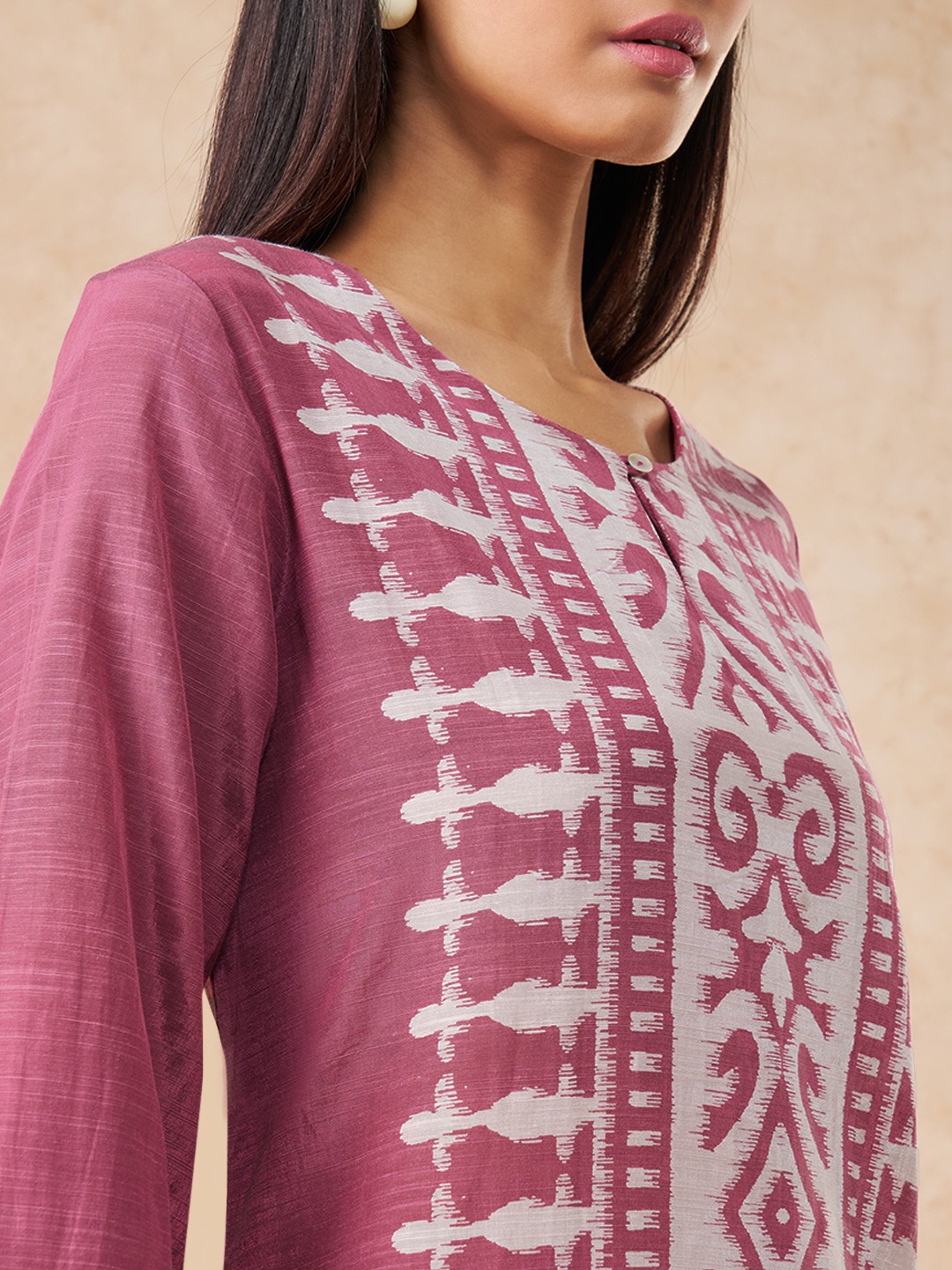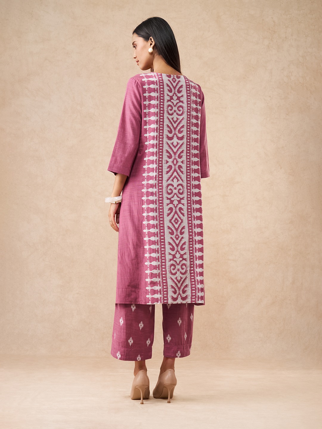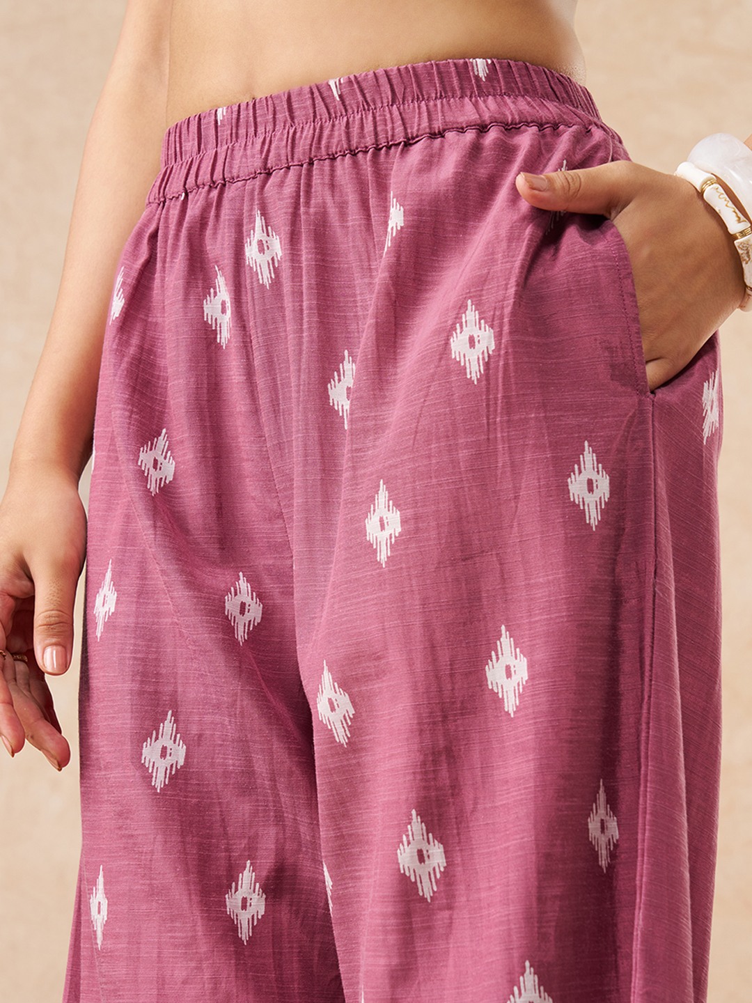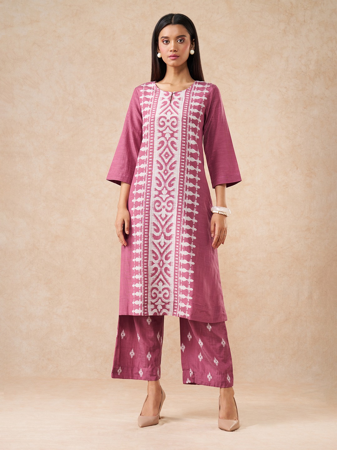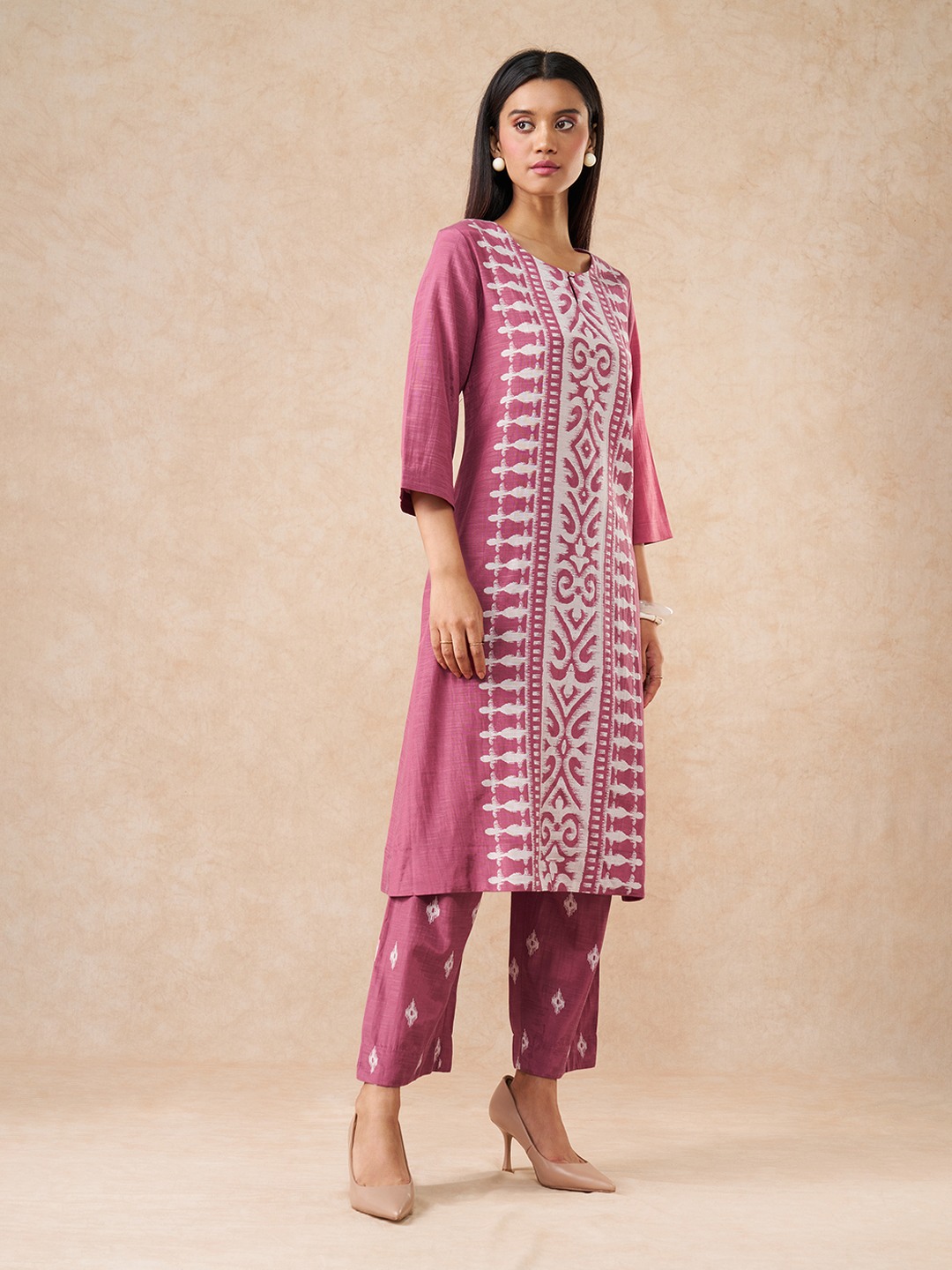 This wholesome, printed kurta set is from our Elevated collection. Featuring styles thoughtfully reimagined for the contemporary woman in the most exquisite fabrics, enriched with refined surface ornamentation, this collection offers versatile pieces that transition effortlessly from day to night. This set comprises a contemporary kurta and a pair of elasticated pants, both featuring a unique all-over print. The comforting character of the cotton-viscose fabric keeps you pleased during your festive events.
