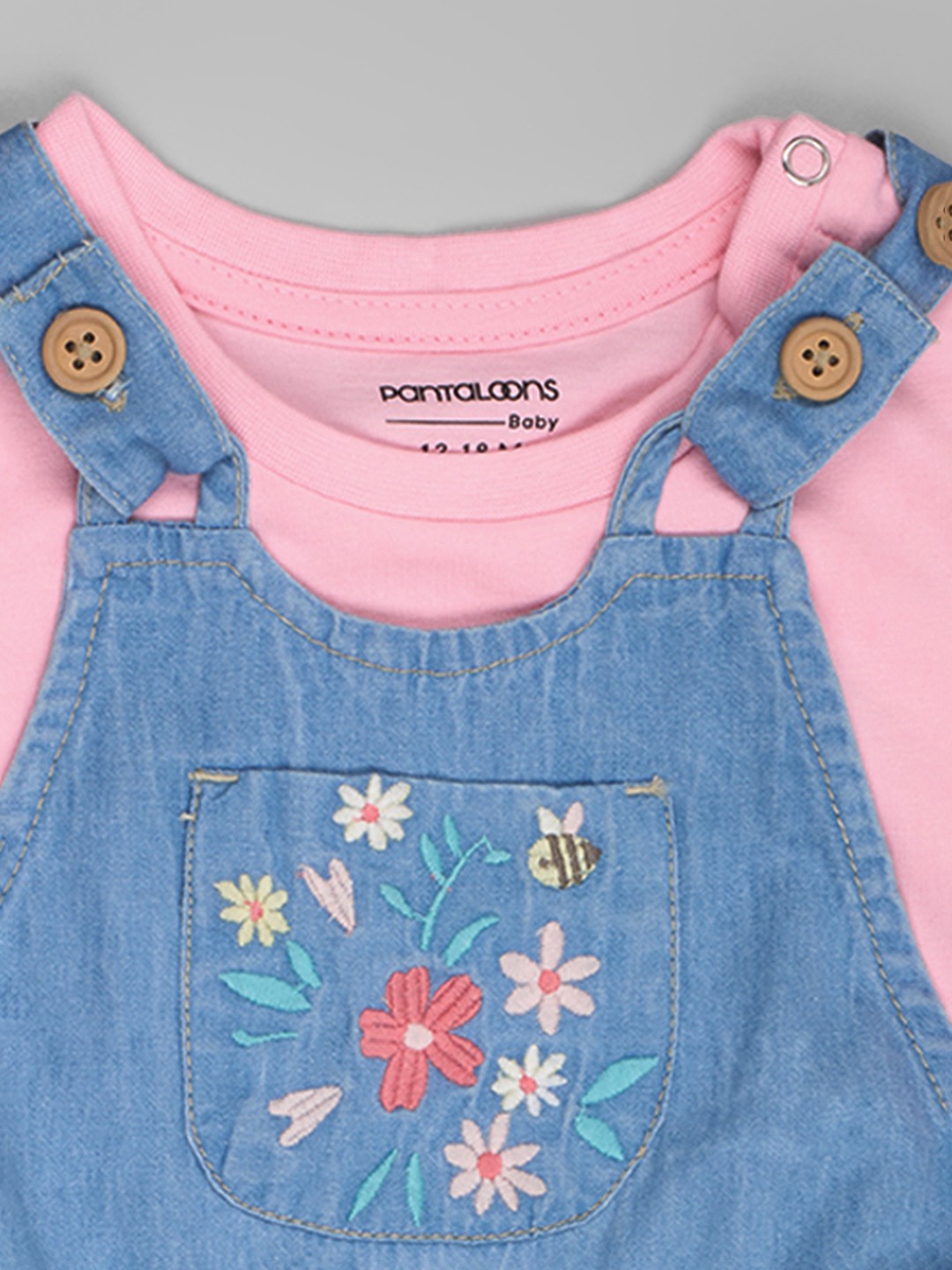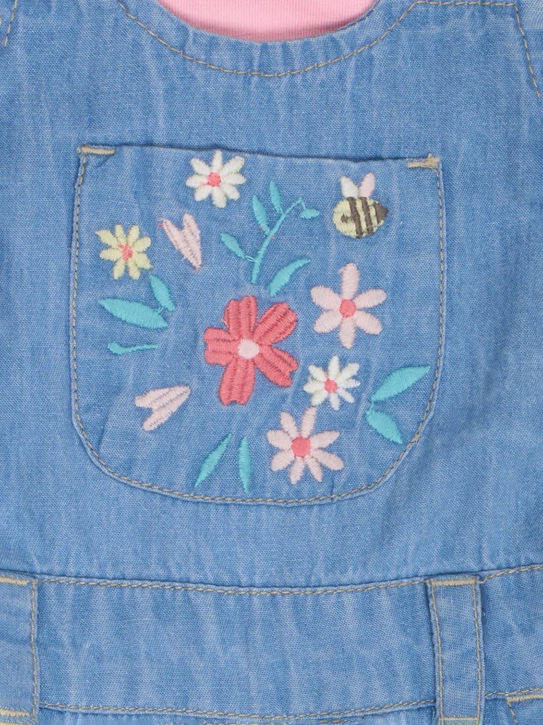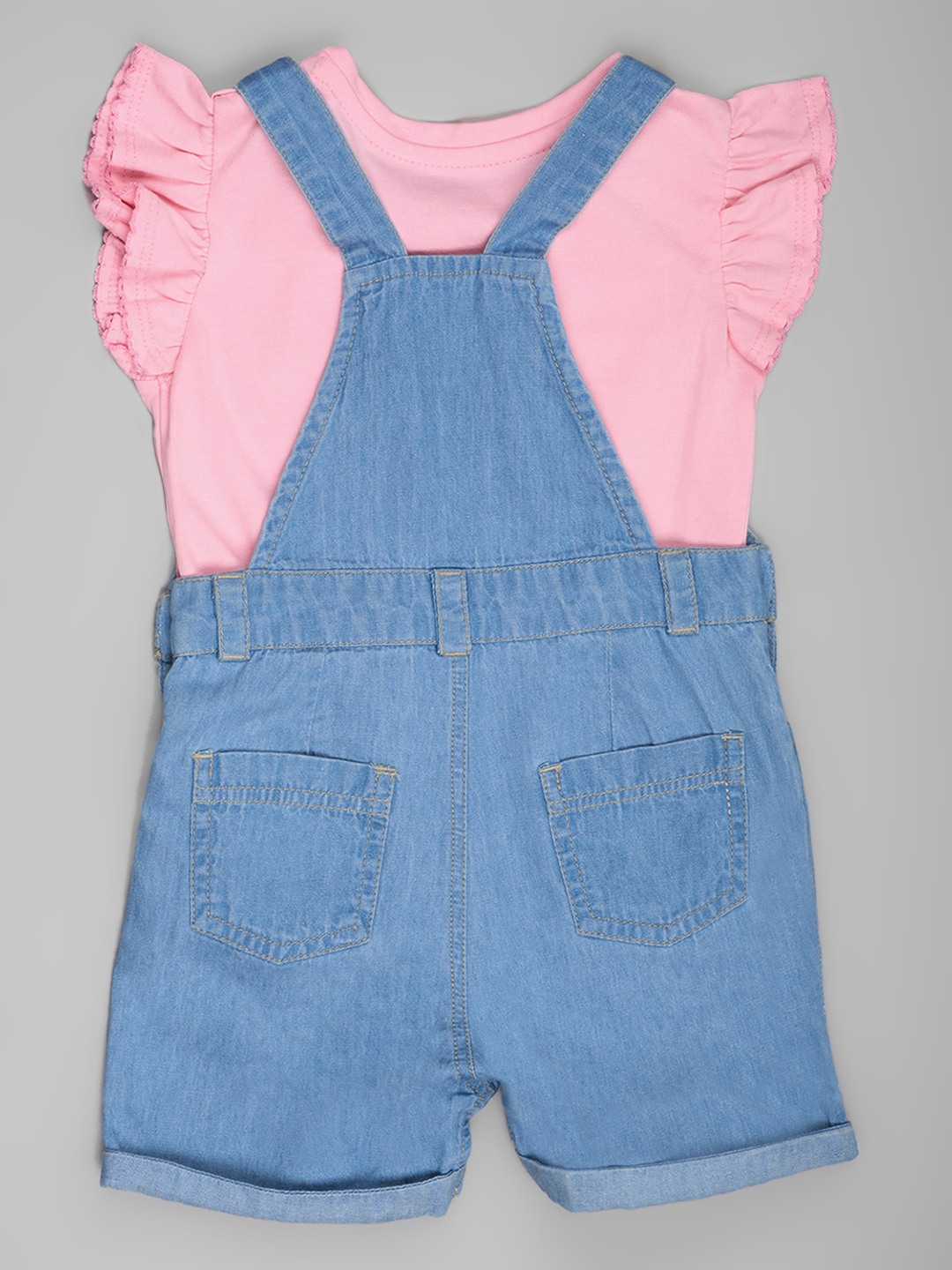 Sweet layering brings playful charm to this coordinated dungarees set. The soft top features ruffled shoulder detailing, paired with light-wash denim dungarees designed with adjustable button straps, a floral embroidered chest pocket, and matching embroidery along the shorts. Comfortable and breathable, the fabrics are ideal for easy movement and all-day wear.
