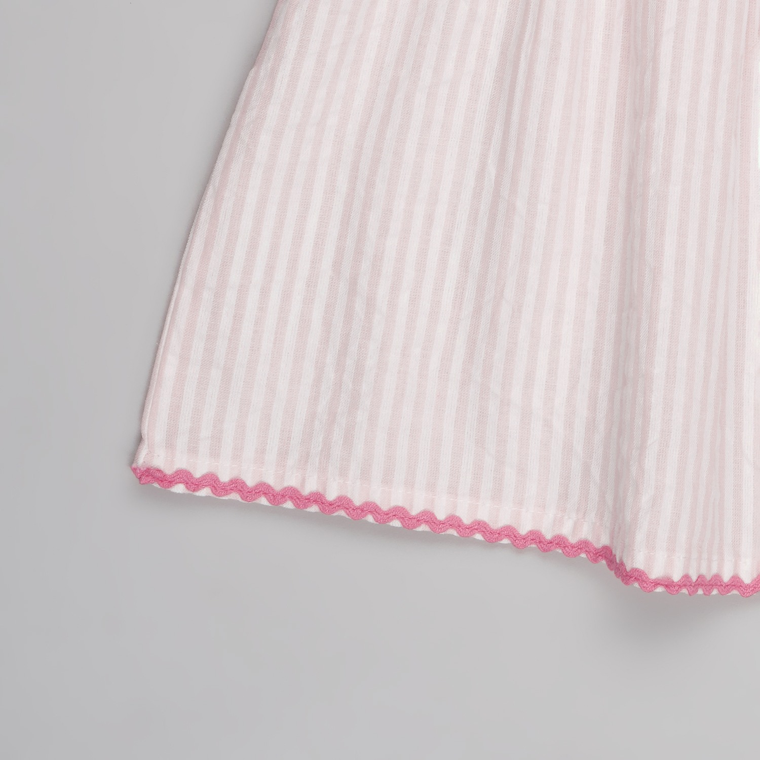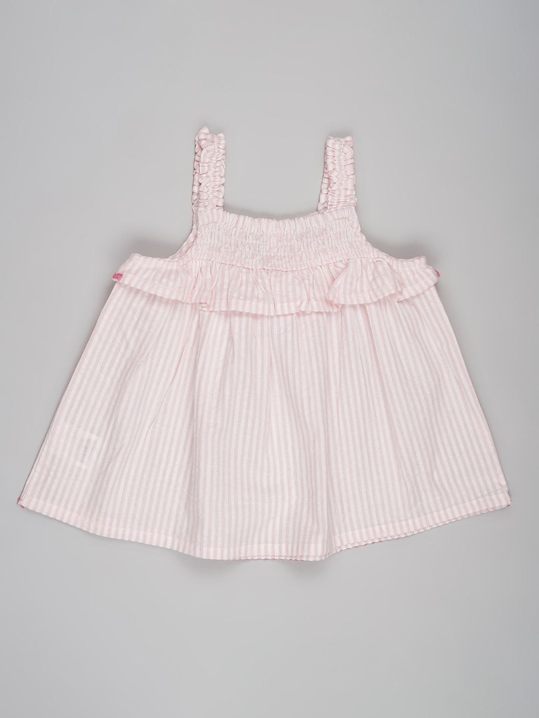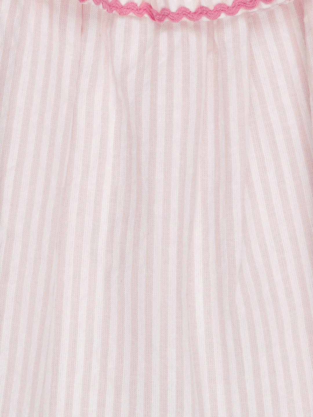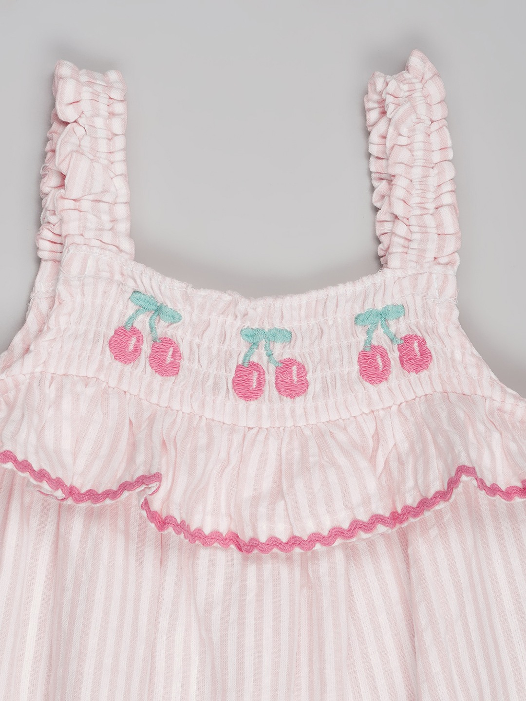 A breezy summer-ready top designed for easy wear. Detailed with a smocked yoke, delicate cherry embroidery at the front and scalloped contrast edging along the neckline and hem for a playful finish. Crafted in a lightweight striped fabric that feels airy and comfortable on the skin.
