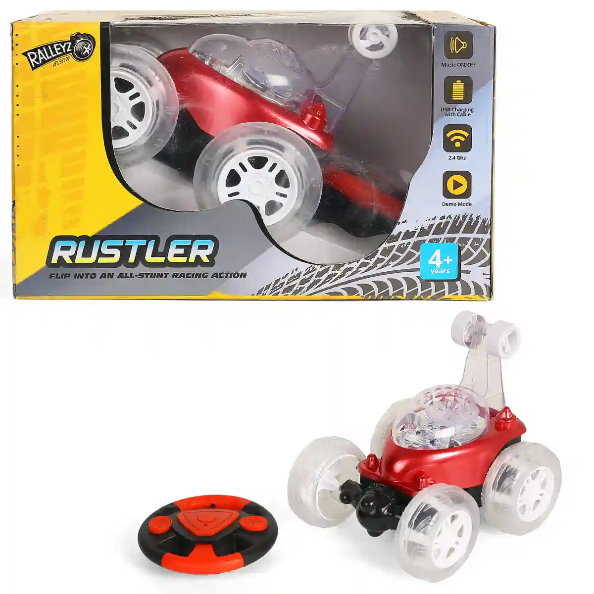 Experience thrilling stunts with the Ralleyz Rustler. This red remote control stunt car is perfect for kids aged 4 years and above, offering all-around stunt action. Flip, twist, and maneuver with ease as you navigate obstacles and conquer challenges. With its durable construction and responsive controls, it promises hours of exciting playtime adventures, fostering creativity and coordination in young drivers.