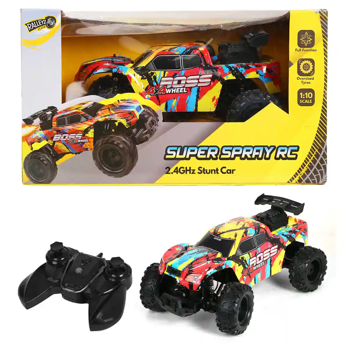 The Ralleyz Super Spray Remote Control Stunt Car is an exhilarating toy designed for children aged 3 years and above. This multicolored car, at a 1:10 scale, boasts impressive stunt capabilities and features a super spray function, adding a thrilling element to playtime. With its remote control functionality, kids can perform daring stunts and maneuvers, fostering creativity, coordination, and endless hours of entertainment.