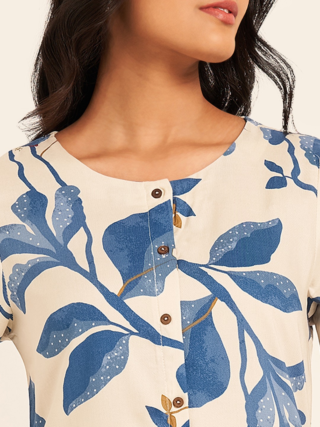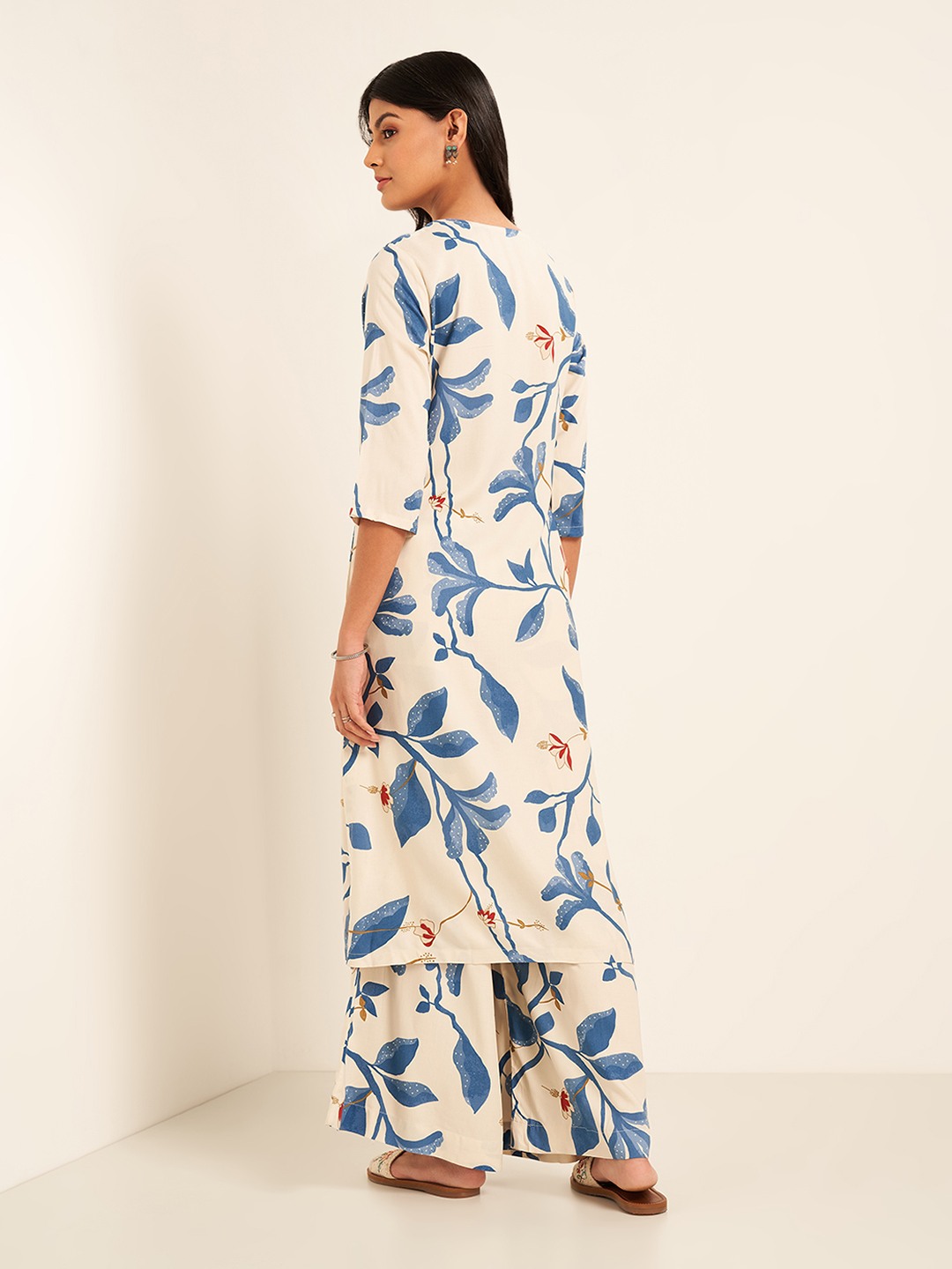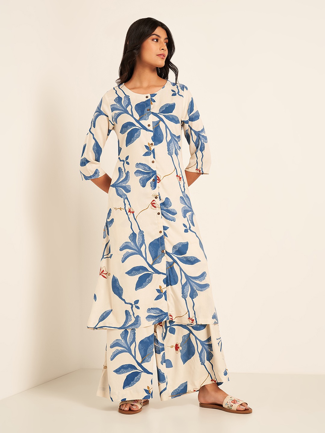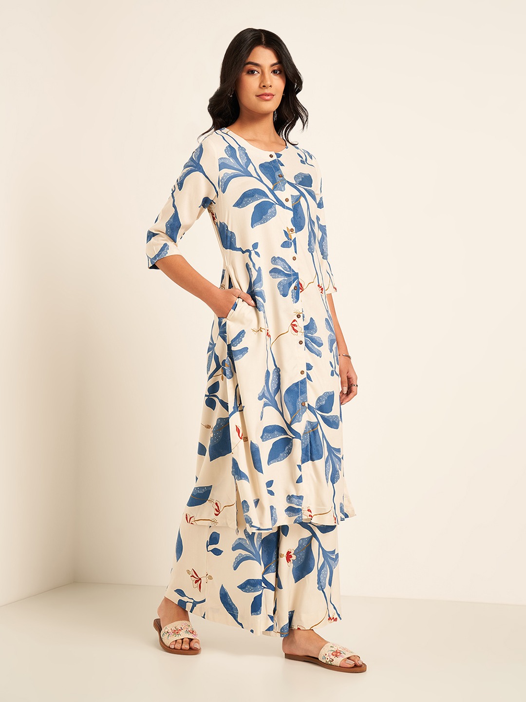 Let your style represent your ethnicity; represent you. The kurta features a round neckline with a button placket, 3/4 sleeves and a pocket. The pants have an elasticated waistband and a super wide silhouette. This set features a matching all-over print and is crafted from a top-notch fabric that finely balances panache and practicality.