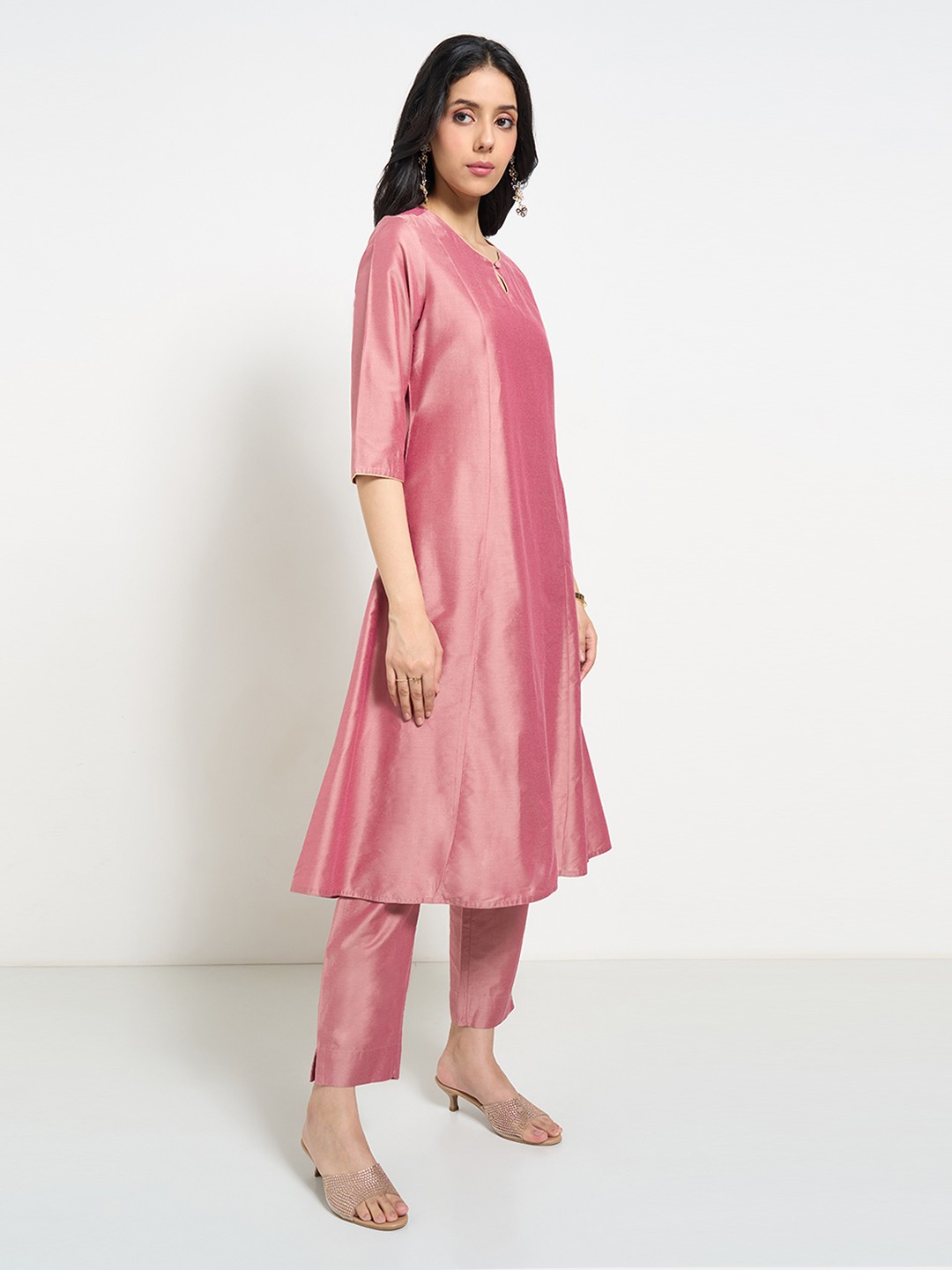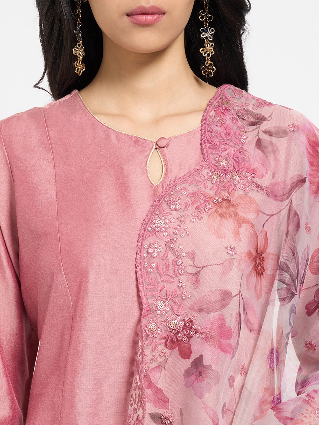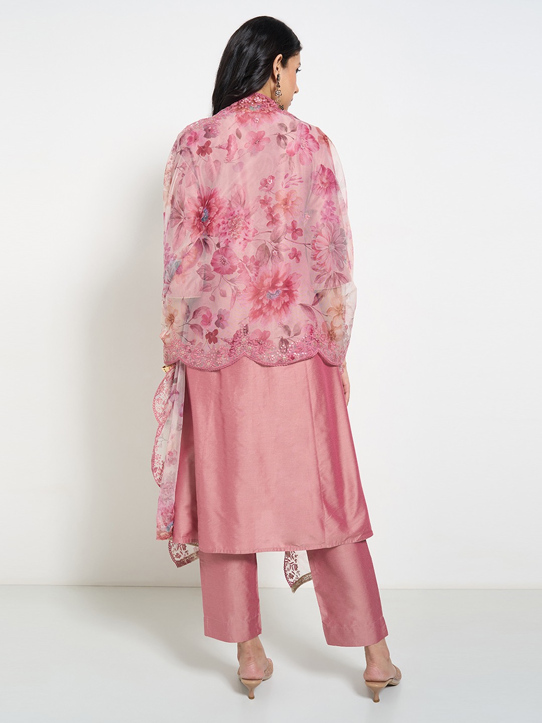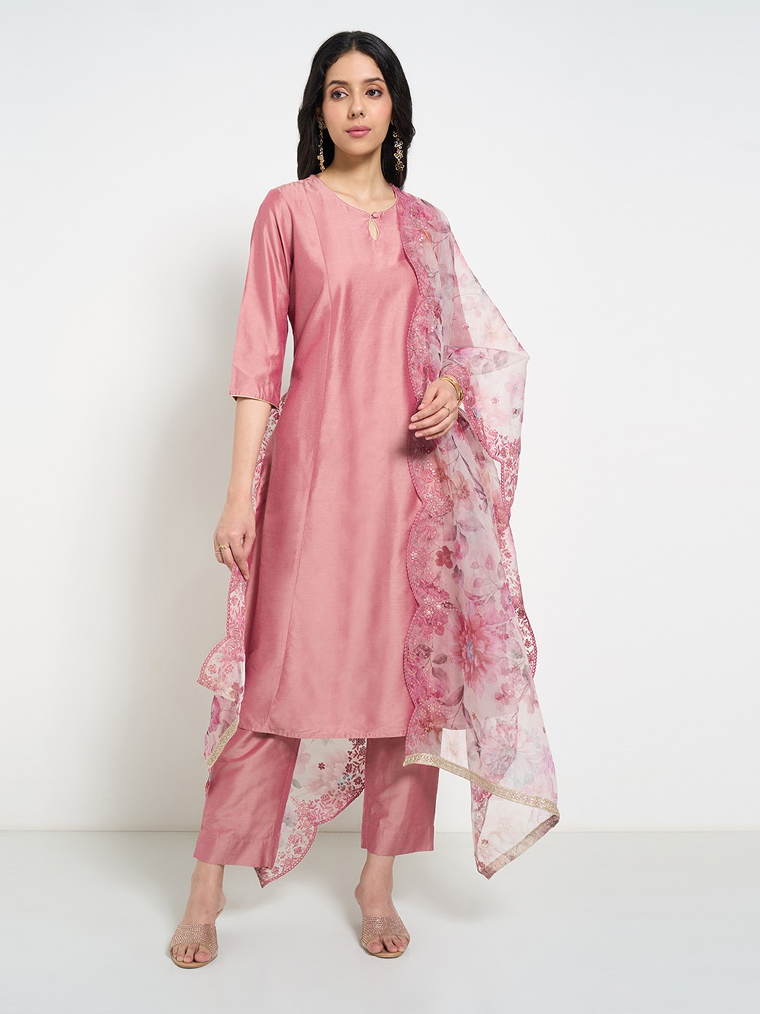 Let your style represent your ethnicity; represent you. The kurta features a round neckline with a front opening and a panelled A-line body with 3/4 sleeves. The pants have an elasticated and a trim silhouette. Also included is a lovely, printed dupatta with embroidered borders. This set is crafted from top-notch fabrics that finely balance panache and practicality.
