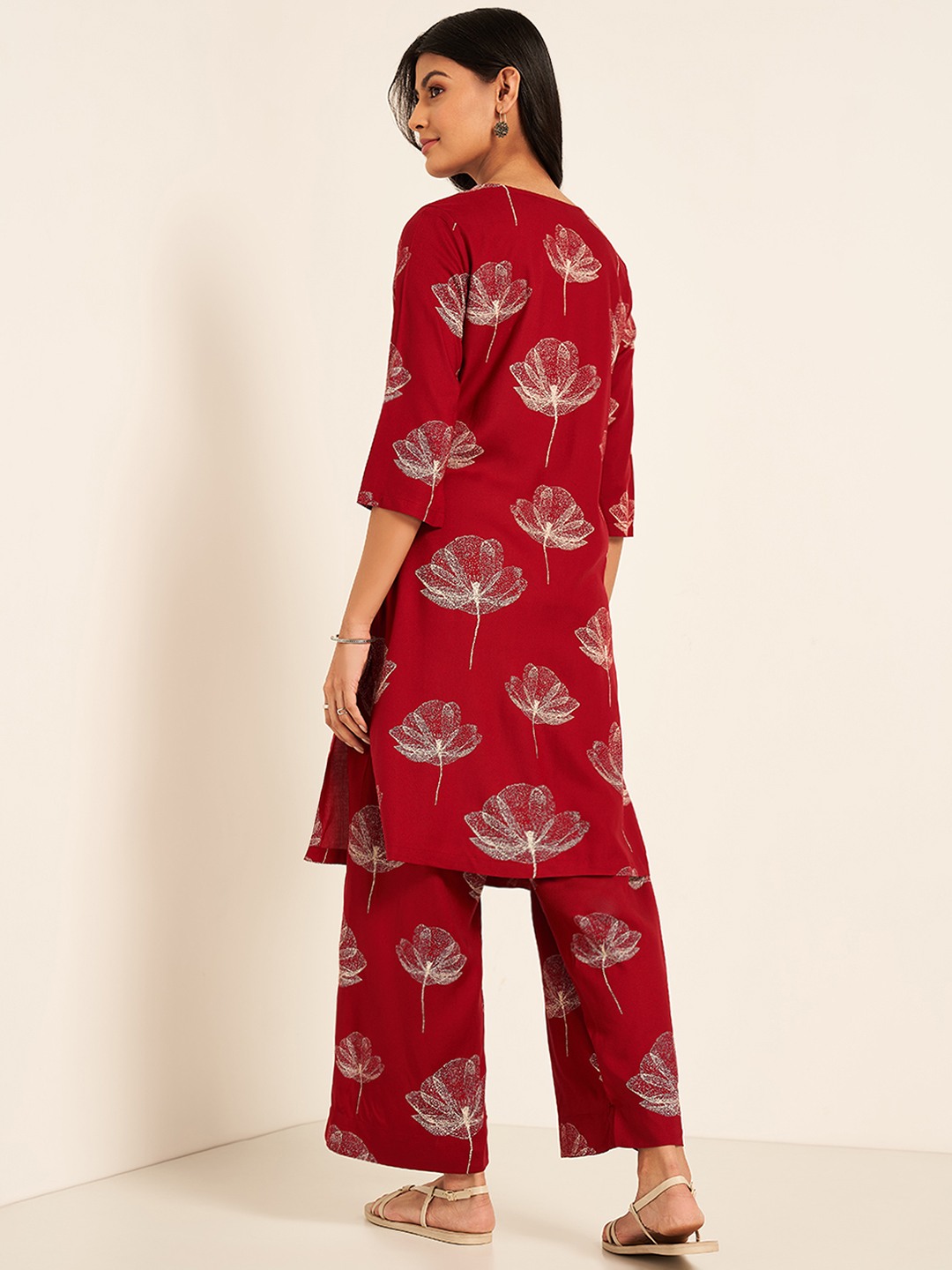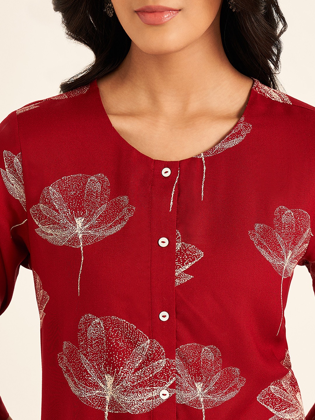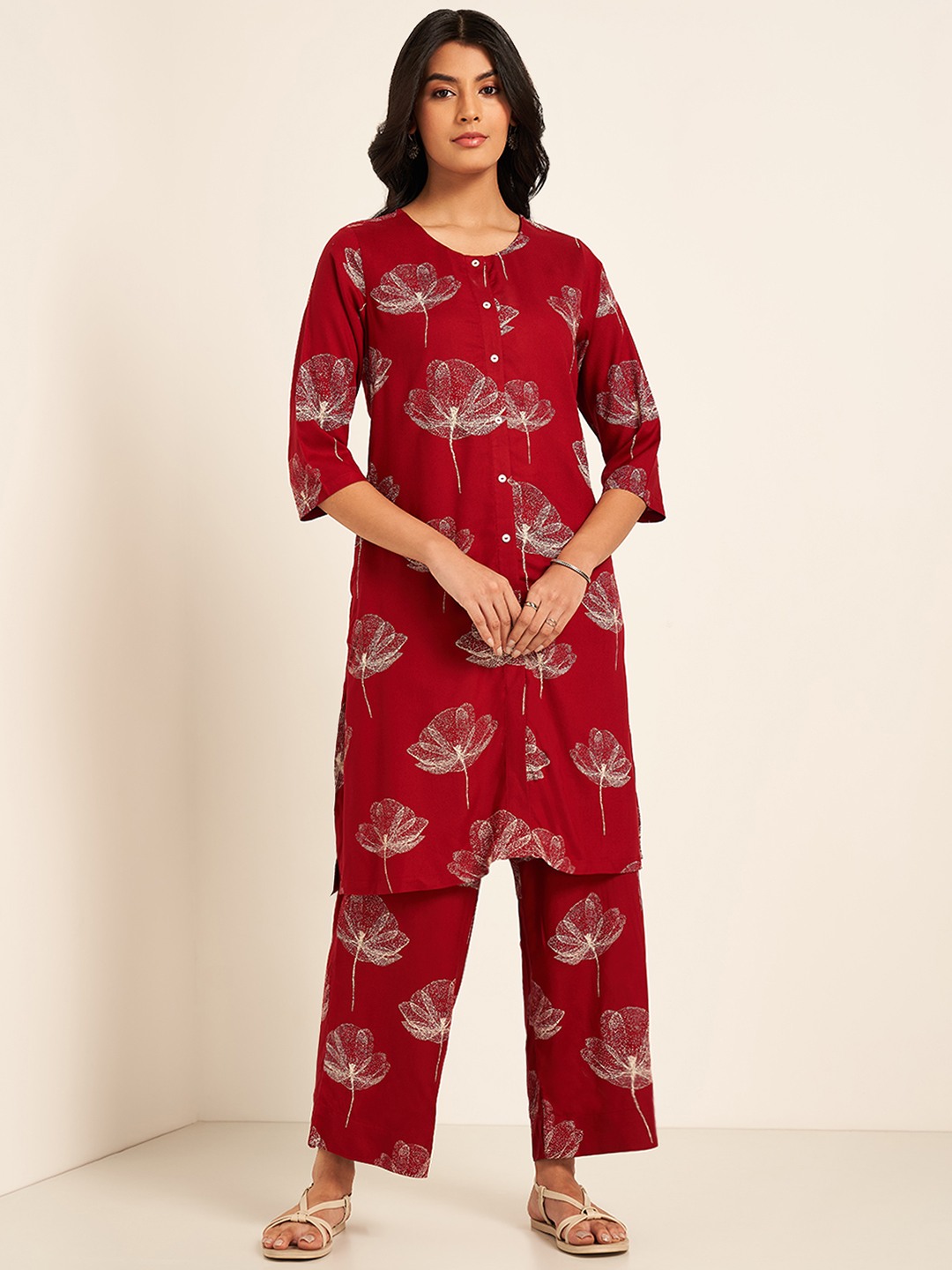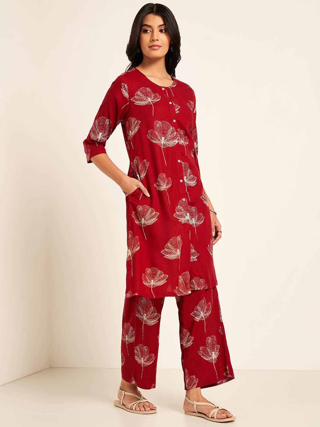 Charming look, check; Festive vibes, check. The kurta features a round neckline with a button placket, 3/4 sleeves, a pocket and a unique all-over print. Crafted in a woven fabric that takes care of your comfort and looks flattering.