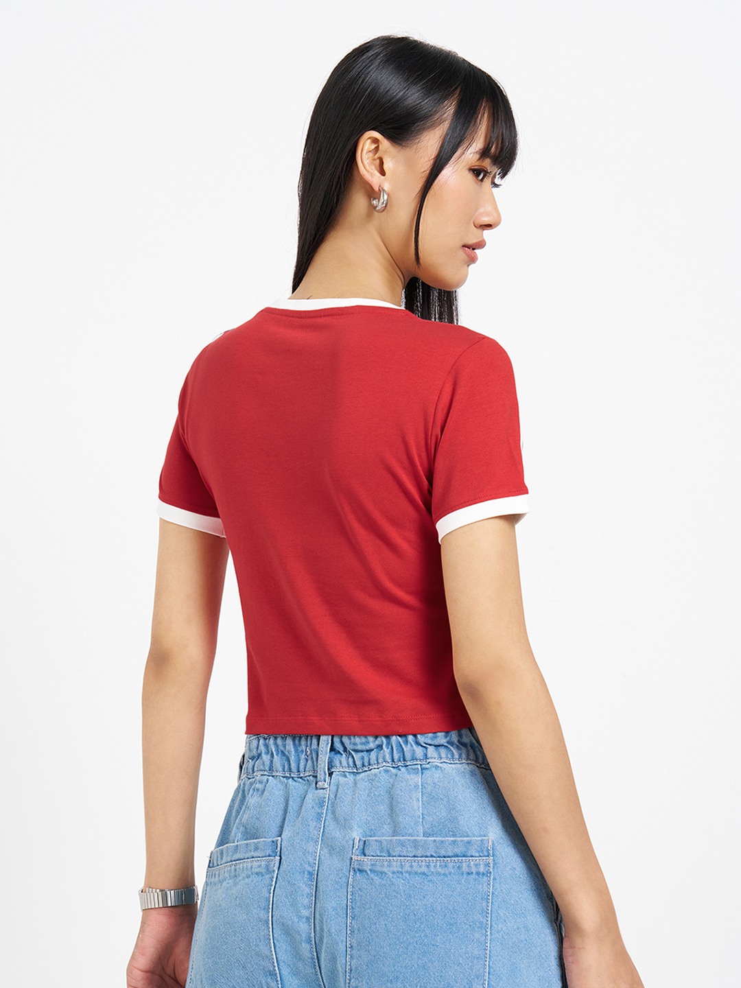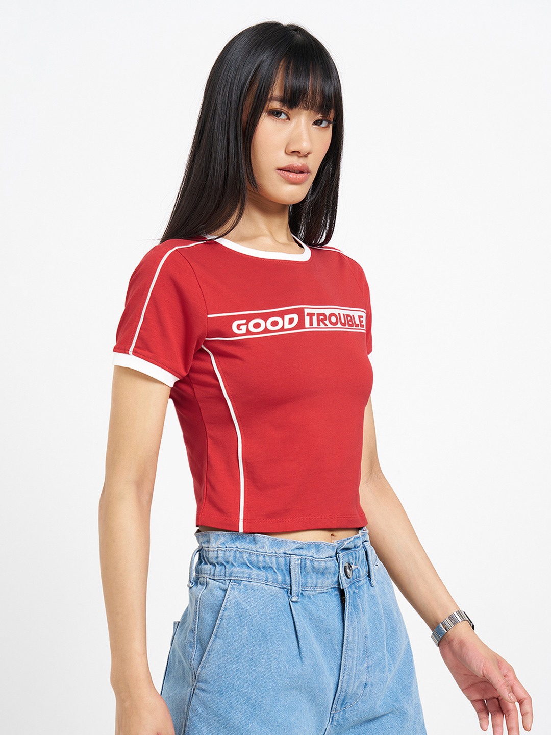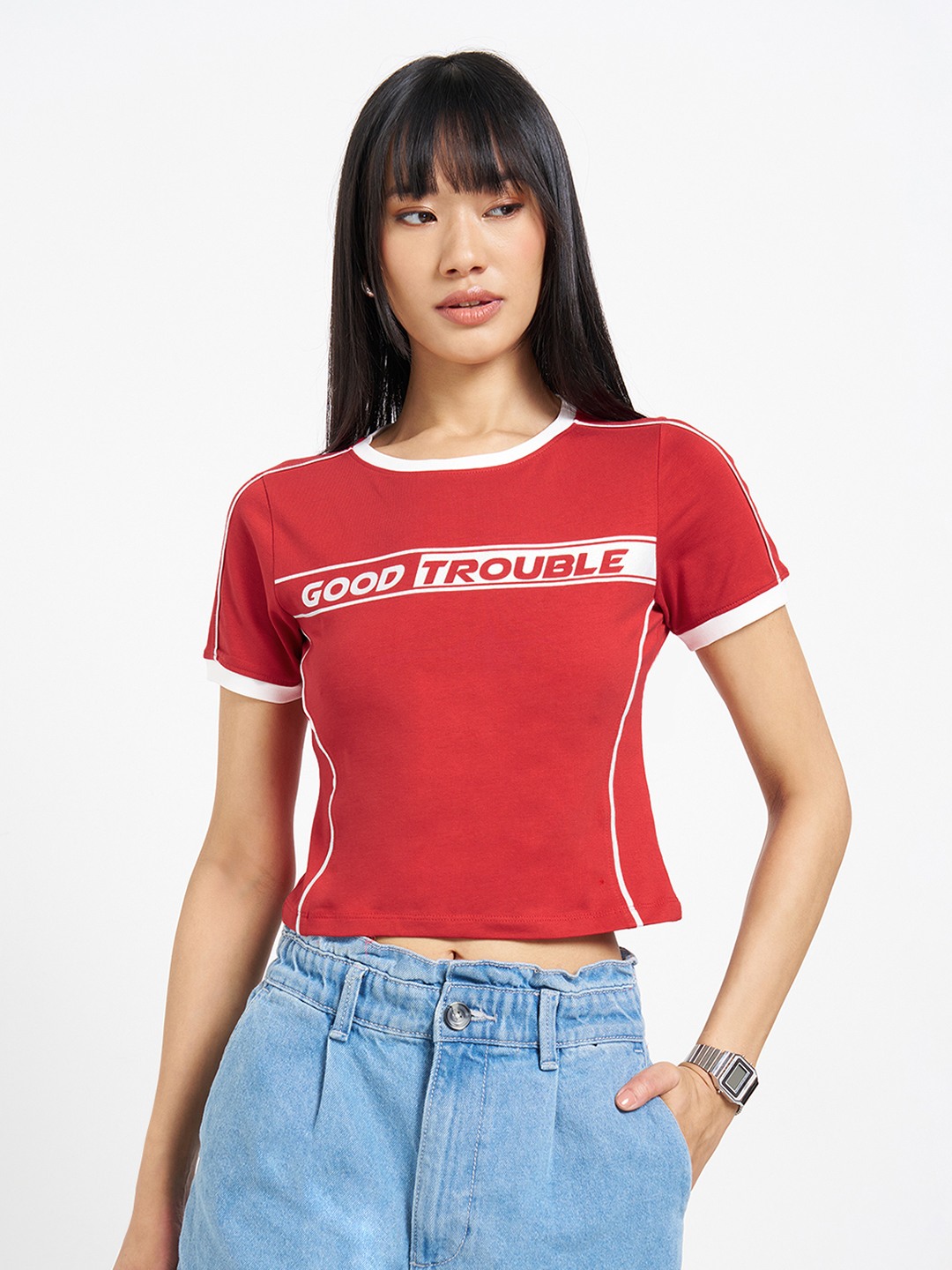 Sharp, graphic, and cut to contour. Designed with a crew neck and half sleeves, it features contrast binding at the neckline and sleeves, a slogan chest print, and panelled seams that shape the cropped silhouette. Stretch knit construction delivers a smooth, flexible feel.