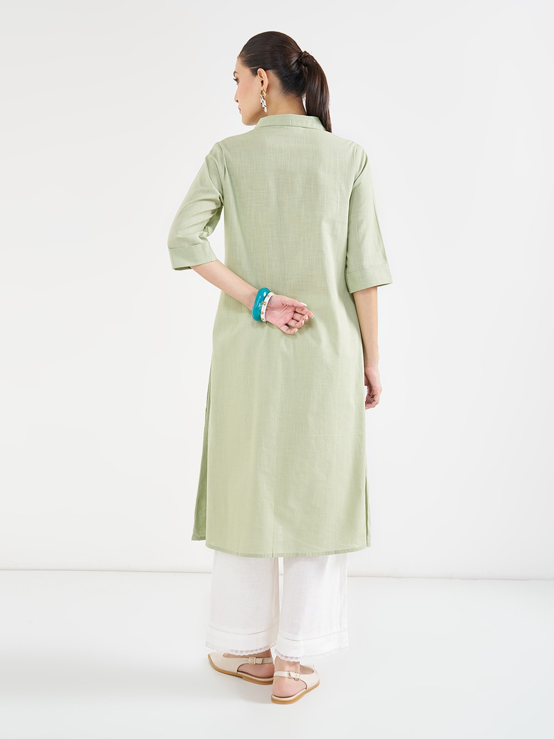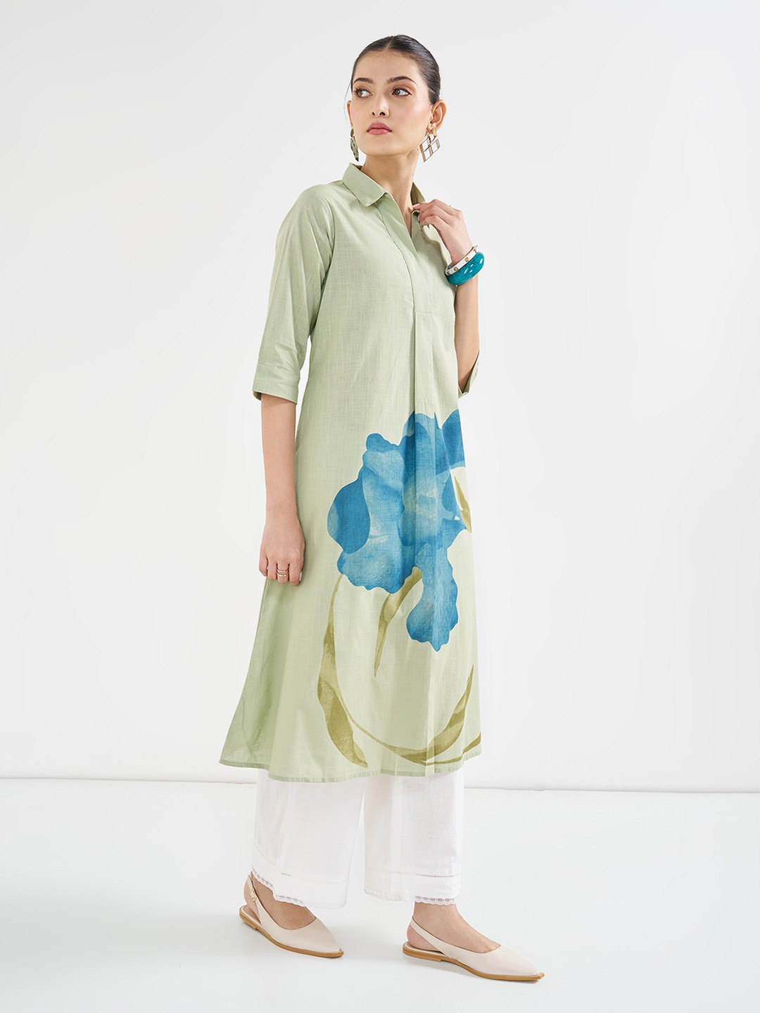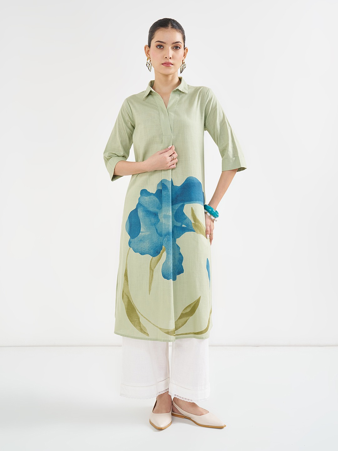 Channel the leading lady in you with this stunning silhouette. The kurta features a collared neck, cuffed 3/4 sleeves and a statement floral print. Crafted from a select fabric that will elegantly uplift your style.