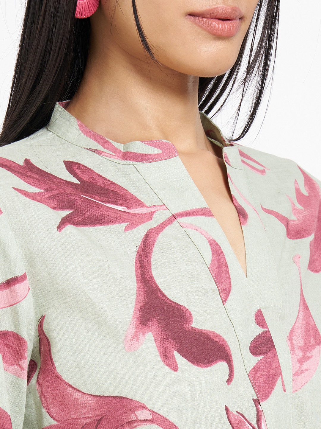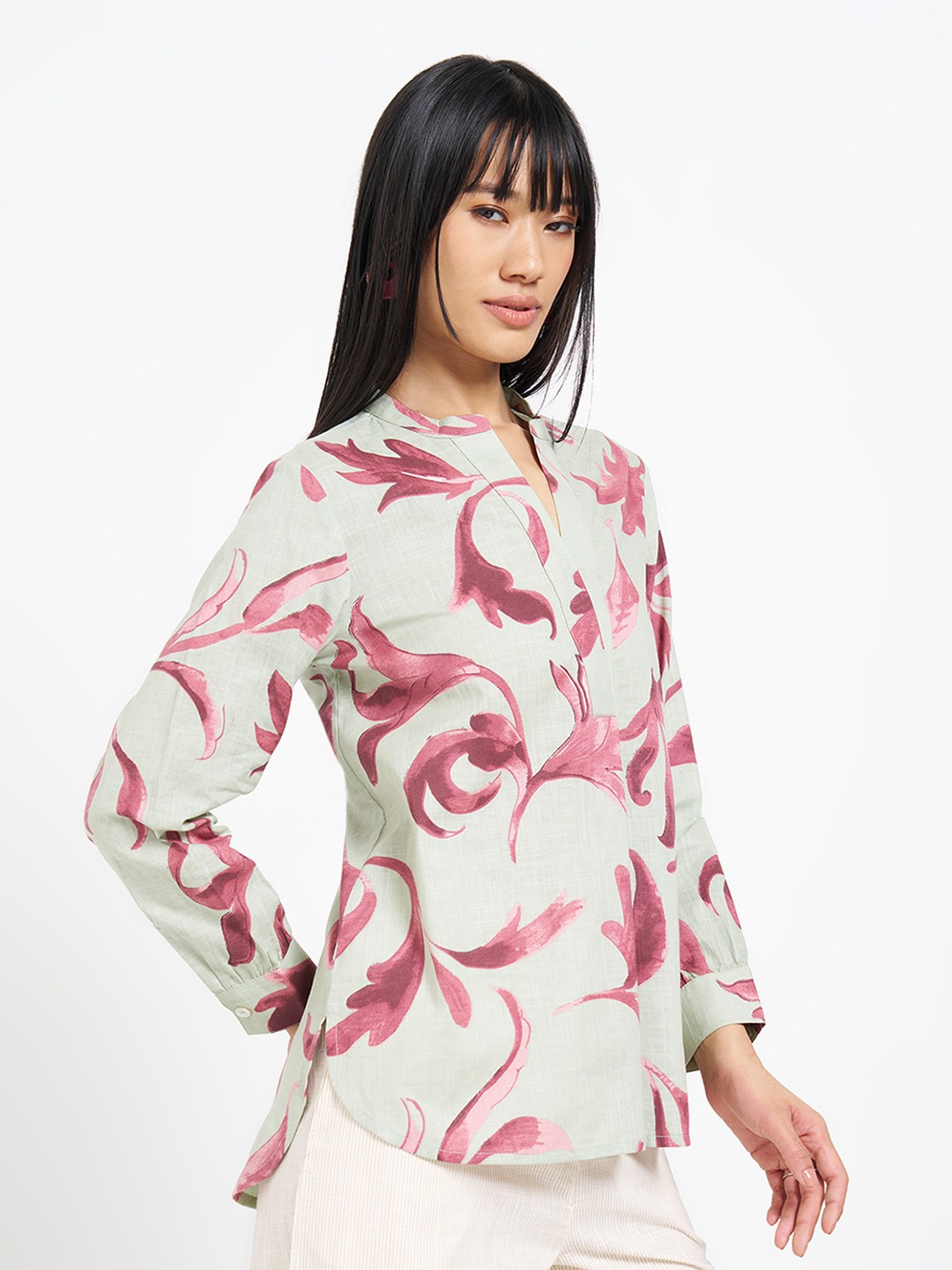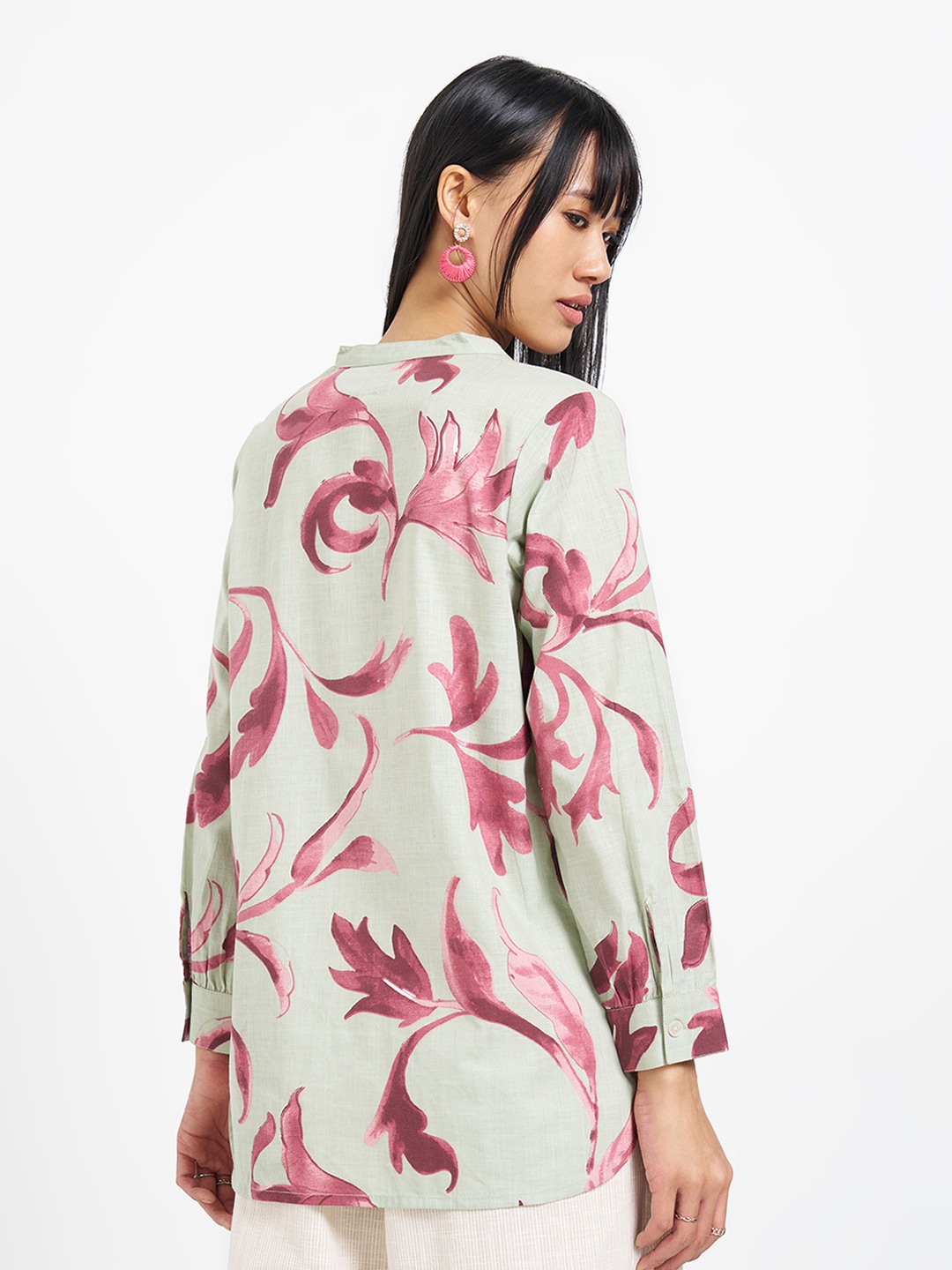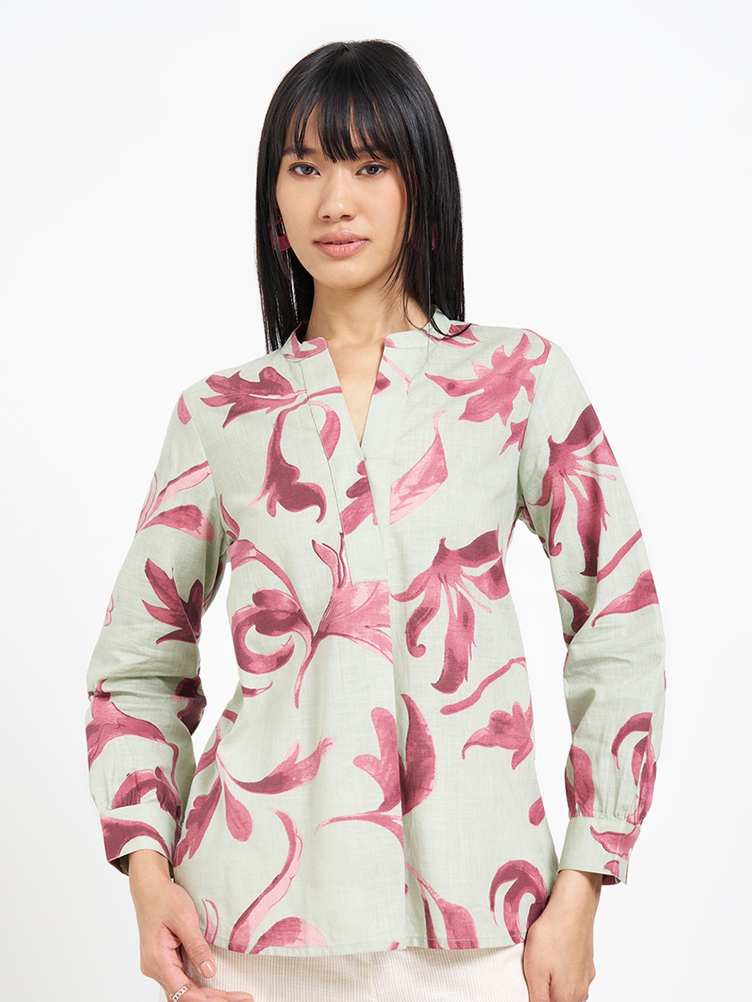 Fluid and expressive, this piece blends soft structure with painterly movement. Designed with a notched neckline and cuffed full sleeves, it features an all-over oversized floral print and a modern silhouette that falls with ease. Crafted in a woven fabric that offers breathability with a light, airy drape.