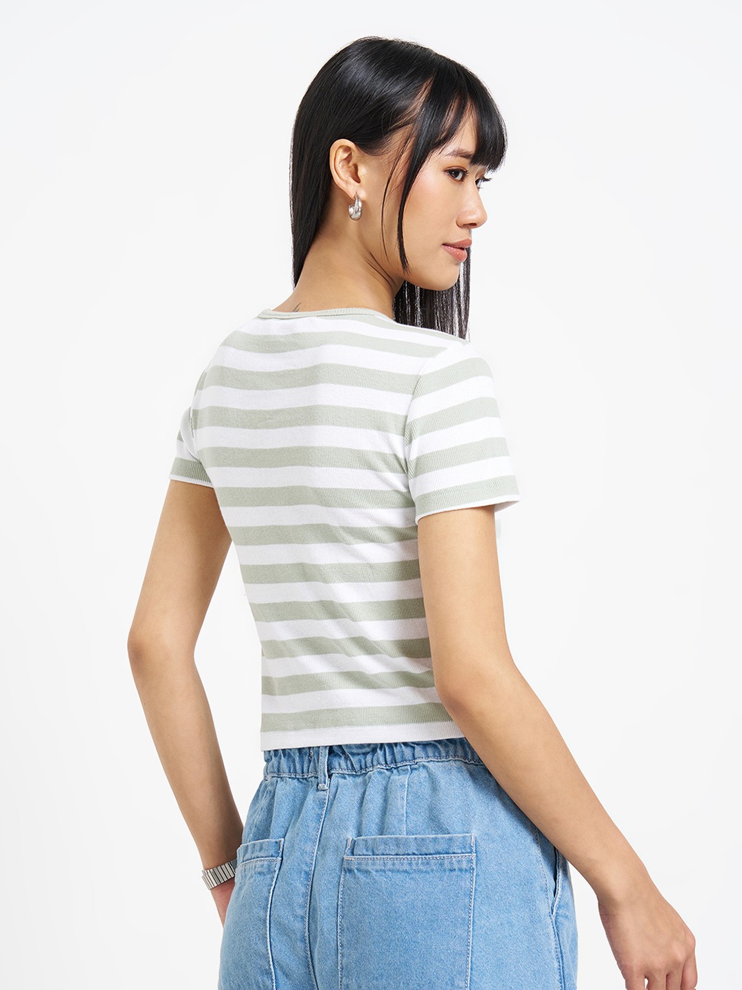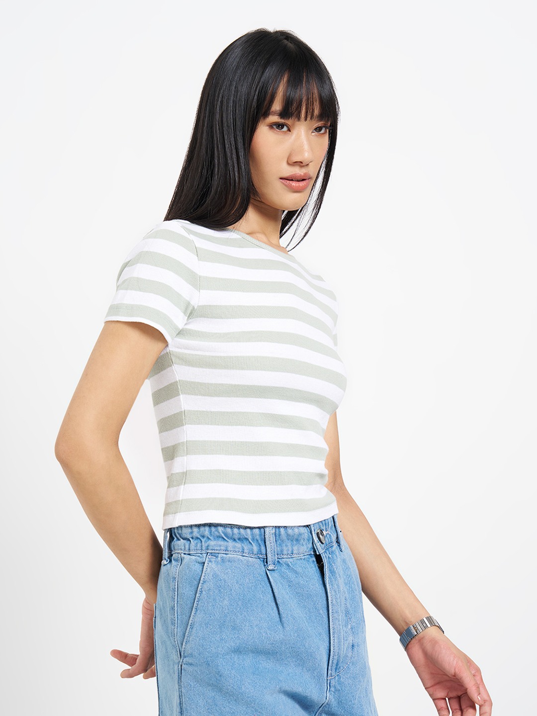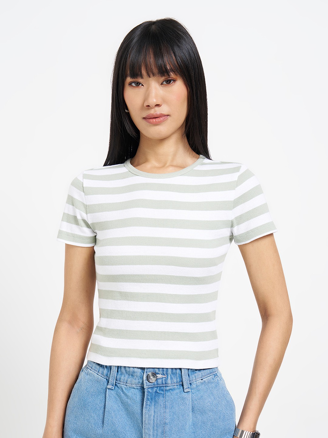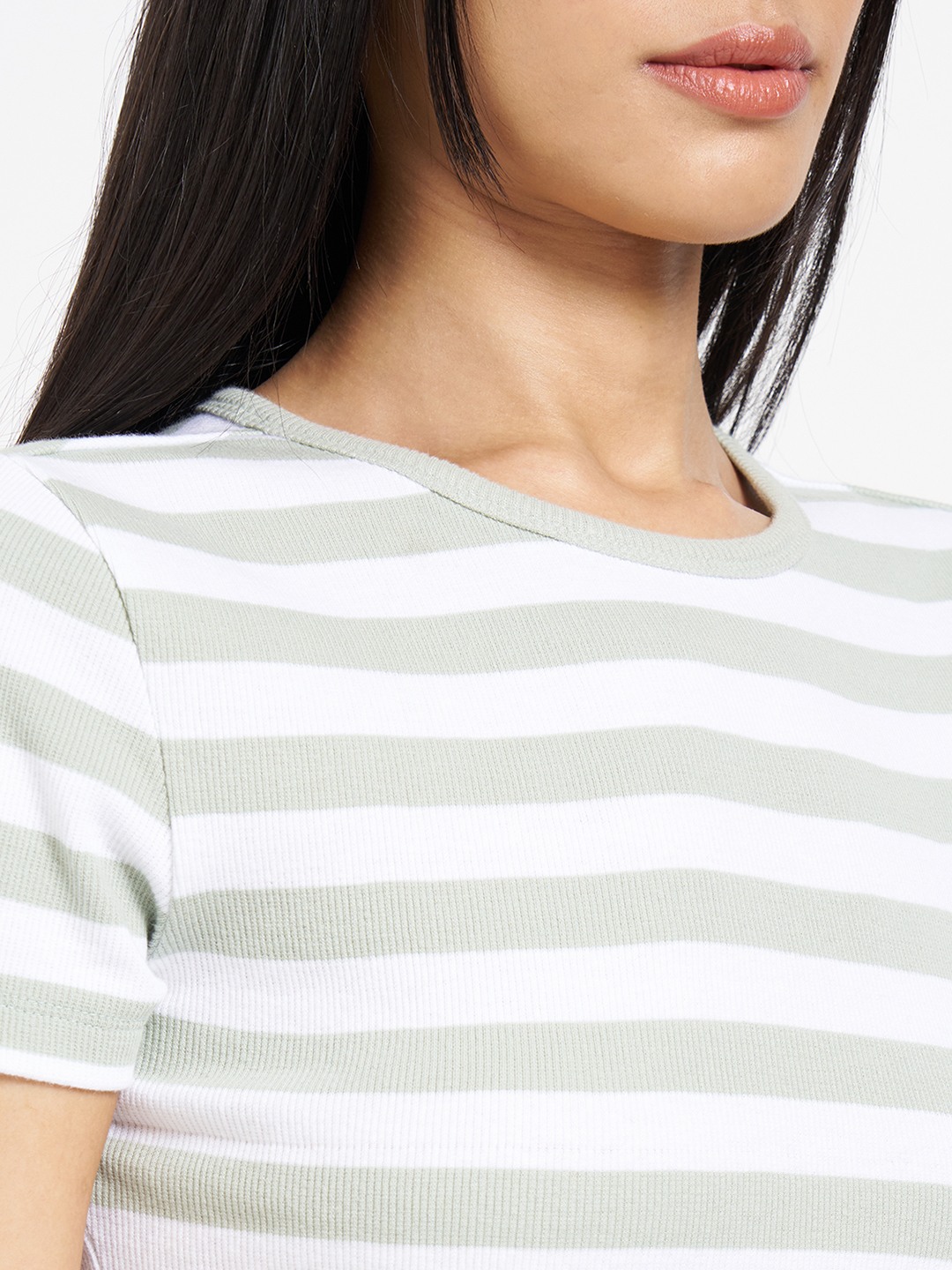 Clean lines with a close, body-skimming fit. Designed with a crew neckline and half sleeves, it features contrasting horizontal stripes and a cropped length. Soft stretch knit offers a smooth, breathable feel.