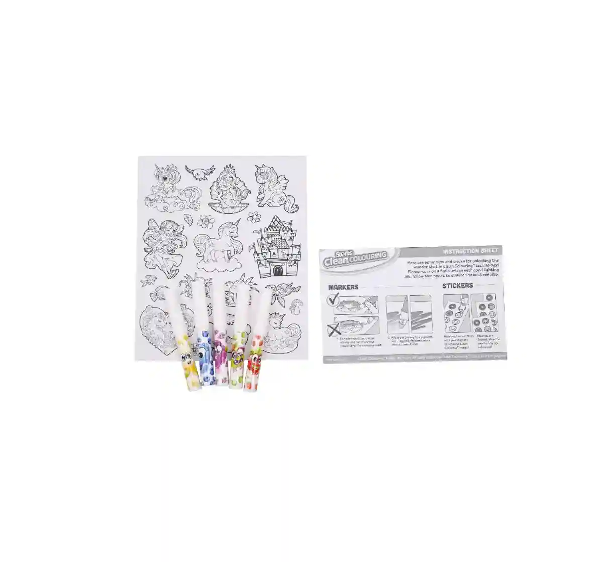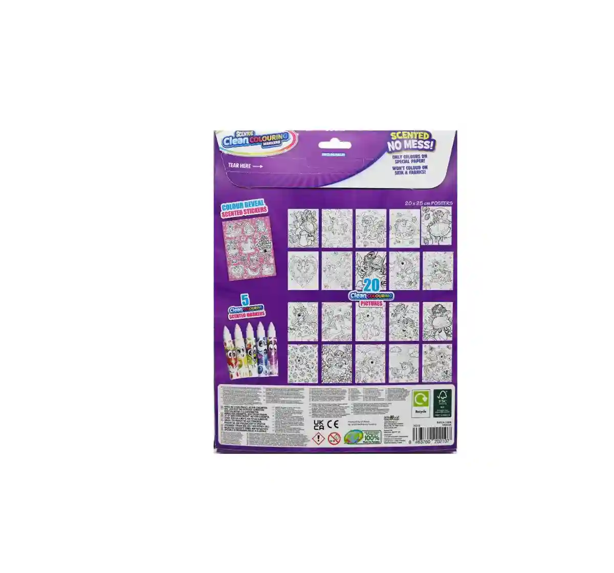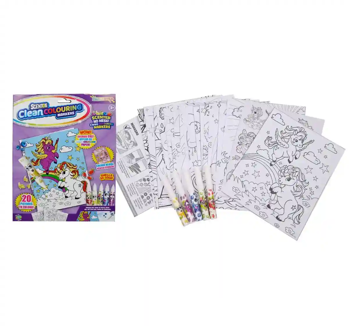 Let your child colour away to enchantment with the Scentos Clean Colouring Marker set - Enchanted! Discover a world of scented fun with these Scented no mess clean colouring markers that will not stain skin, fabrics or furnishing. The pack includes 5 scented markers, 20 clean colouring pictures as well as colour reveal stickers. Unleash your little one's creativity and boost their sensory skills with these colorful scented markers. Please note the Markers will only work on the special clean colouring pictures. Designed in the USA, the products are completely safe and non-toxic and easy to use for kids of ages 3+ years.
