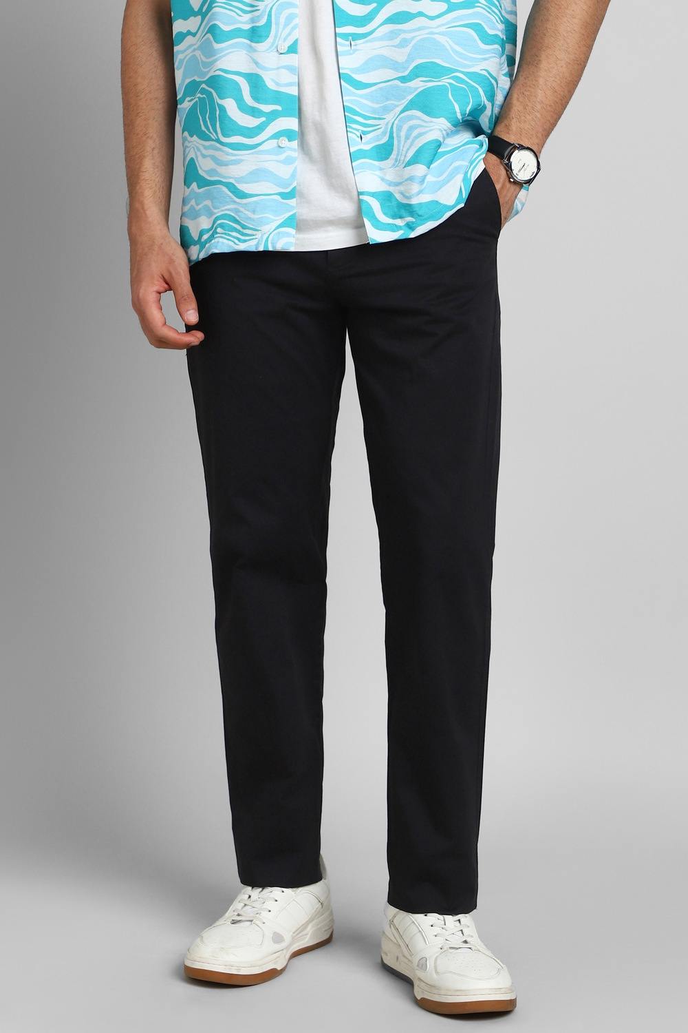Discover effortless style with the Simon Carter black trousers, crafted from a premium cotton and spandex blend for a comfortable, regular fit. These solid-patterned trousers exude versatility, making them perfect for casual occasions. With a stylish flat front design, they strike the ideal balance between relaxation and sophistication. Embrace this wardrobe essential that enhances your look and enjoy the confidence that comes with refined fashion.