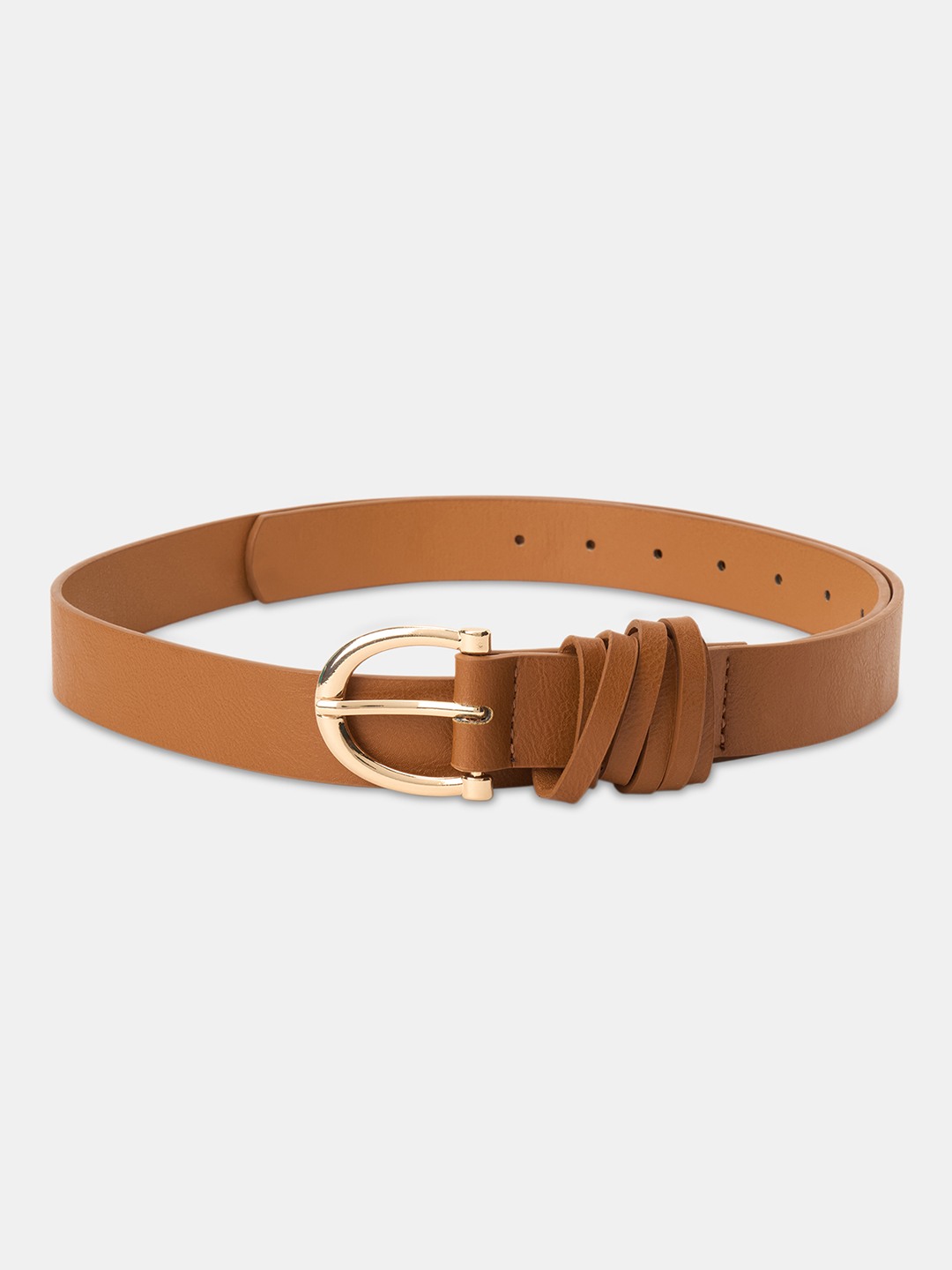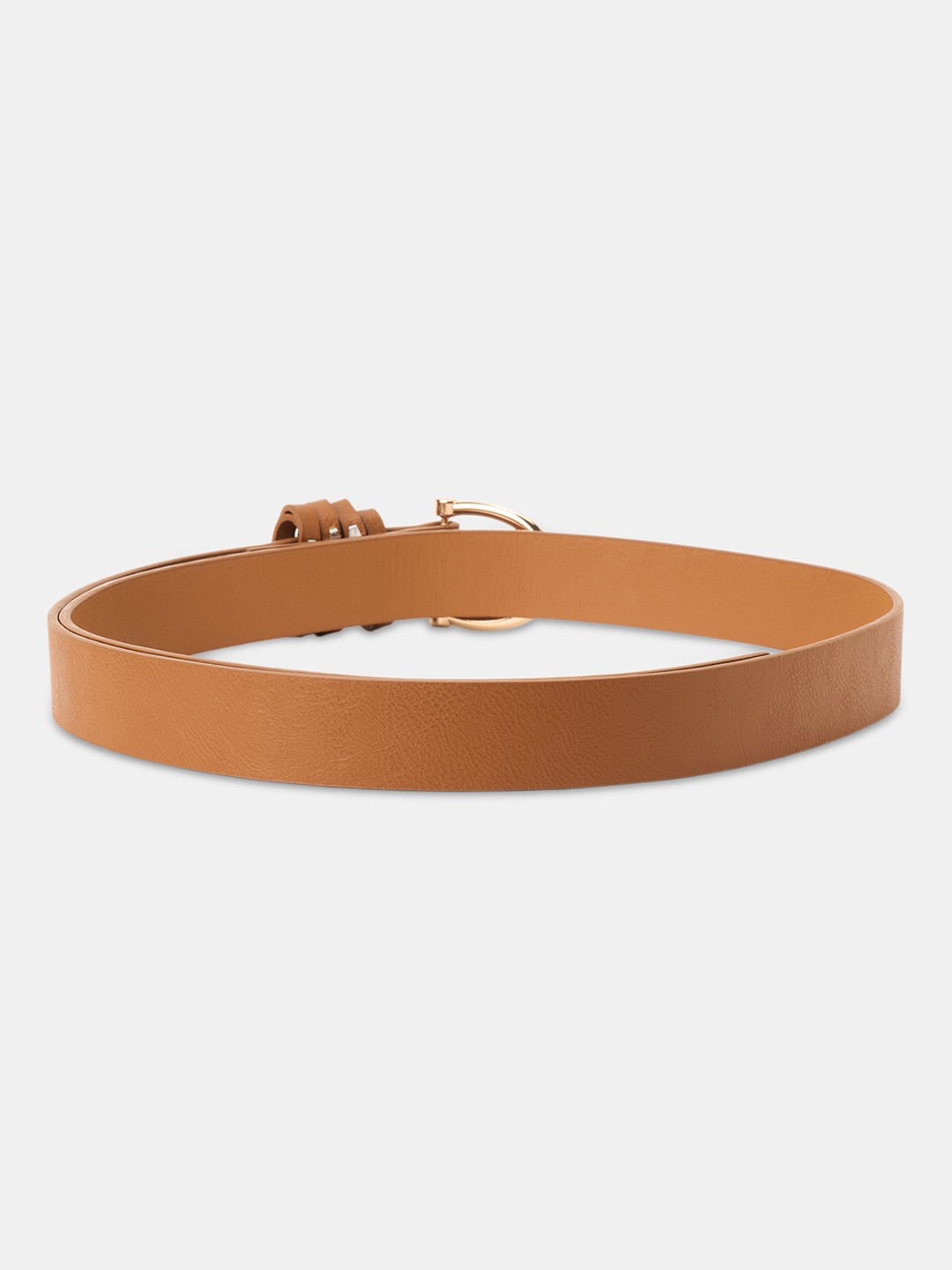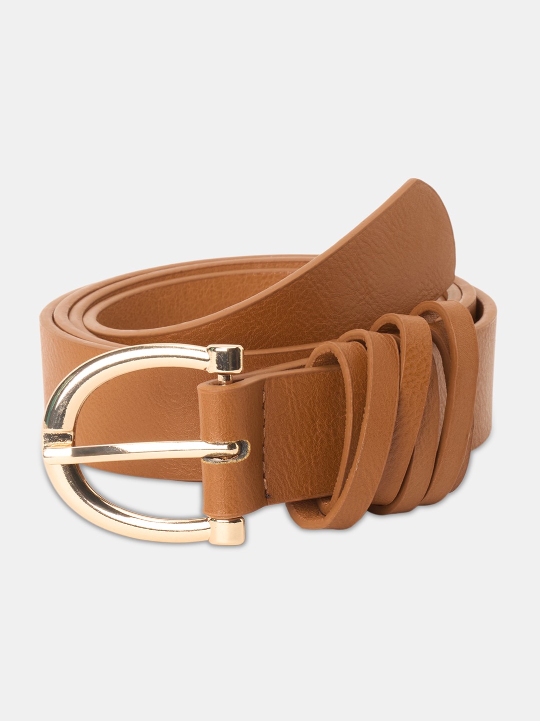 A clean, structured waist accent with a confident, feminine presence. Crafted with a smooth tan strap and finished with a softly rounded gold-tone buckle, it brings polish and balance without appearing delicate or oversized. The adjustable design sits comfortably at the waist and complements dresses, trousers, or skirts with ease.