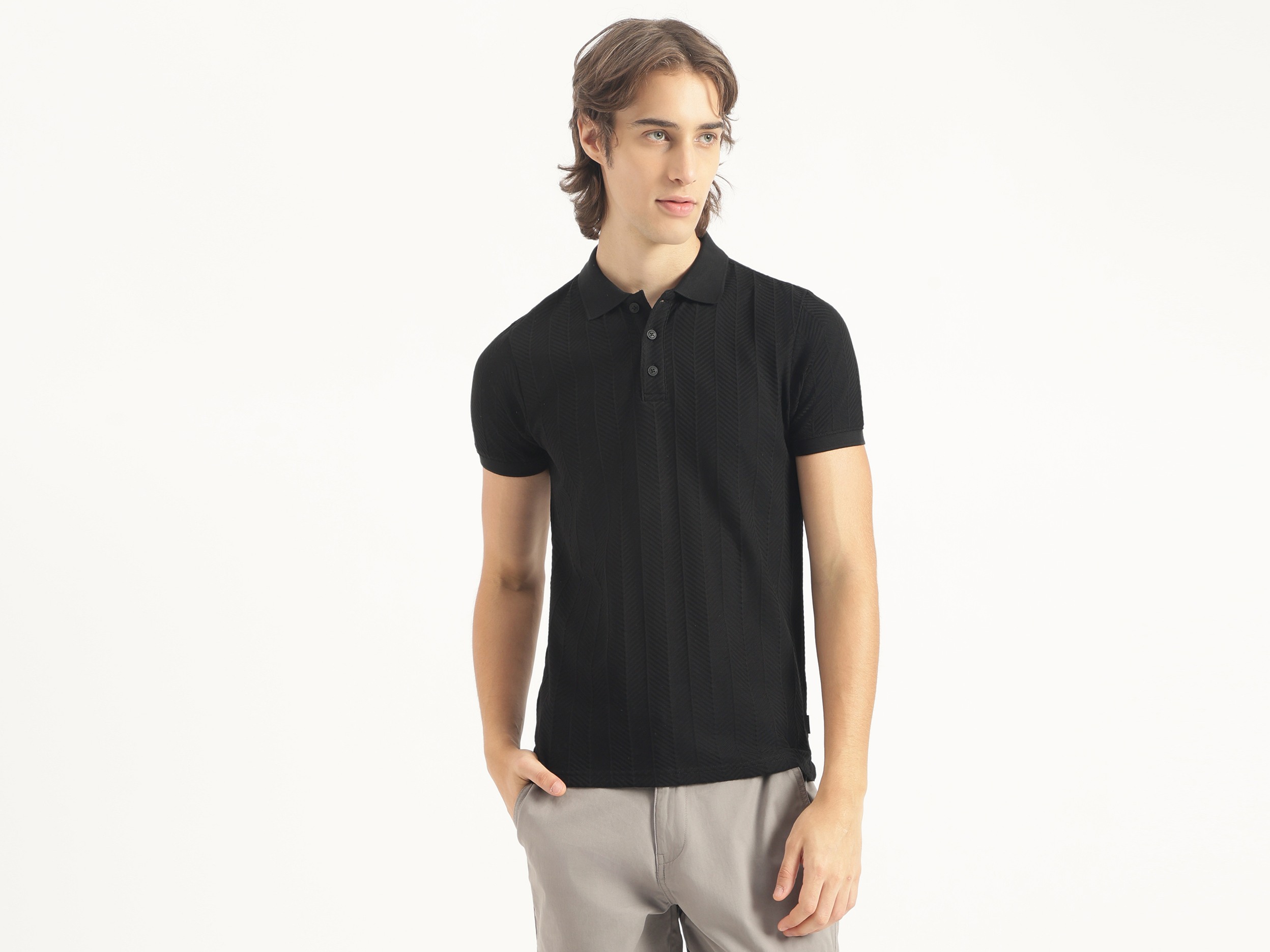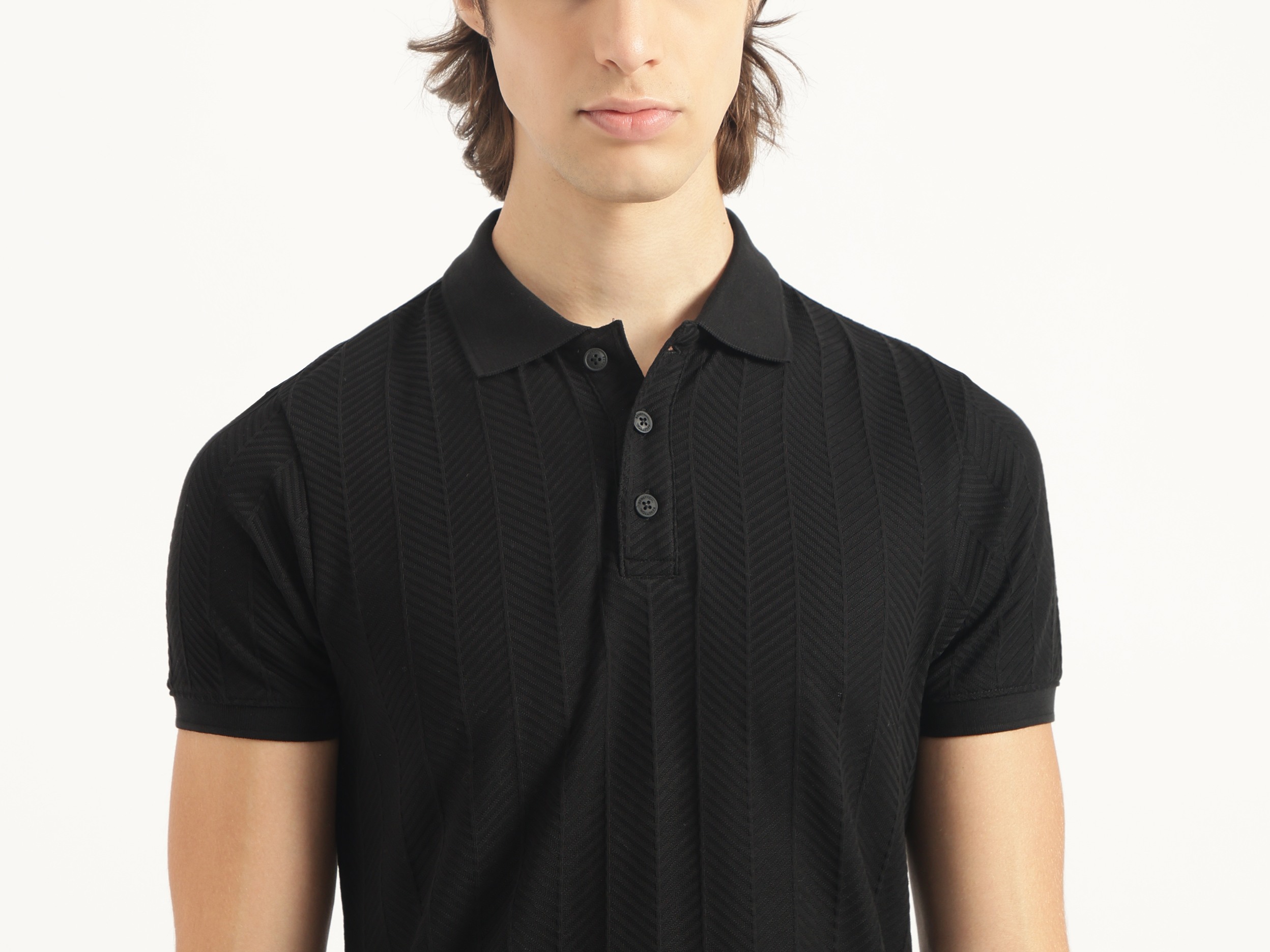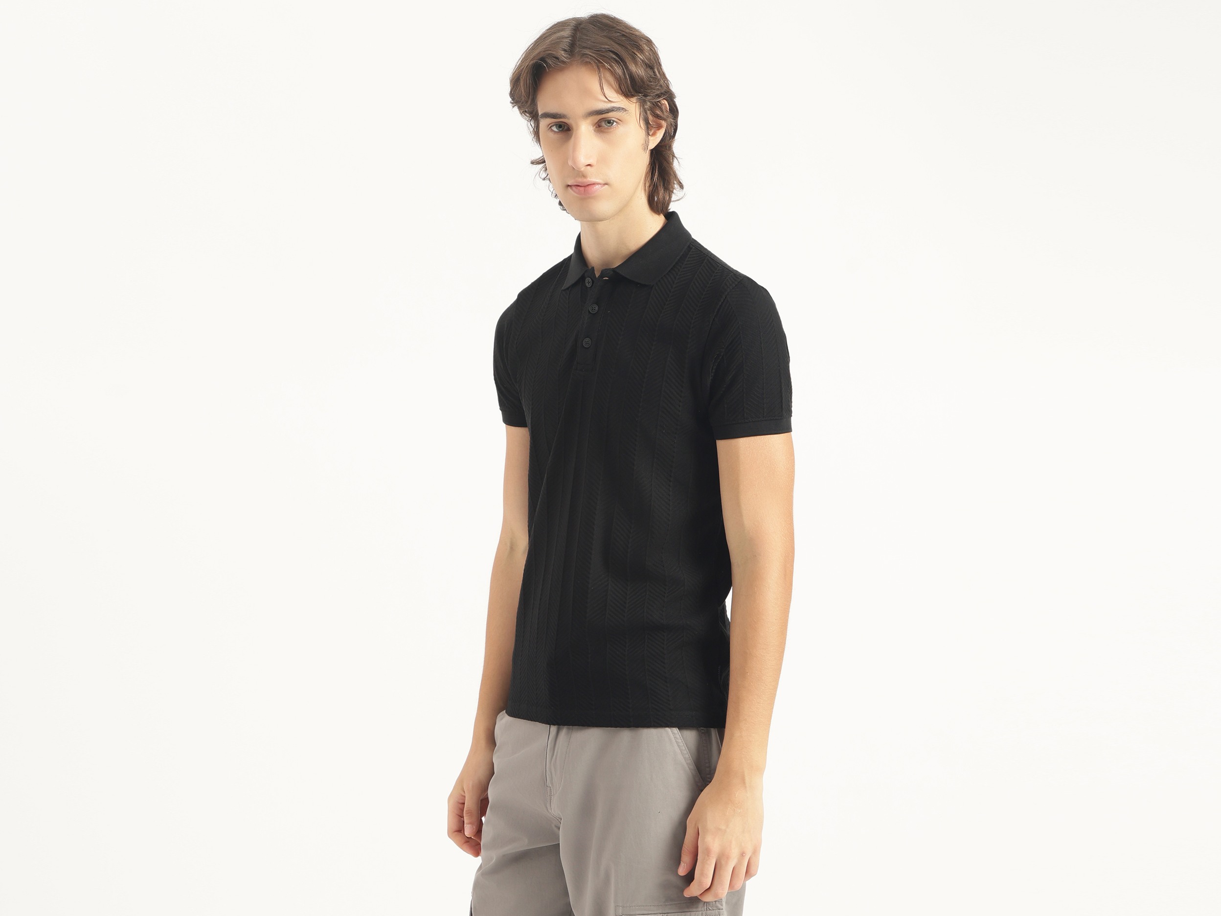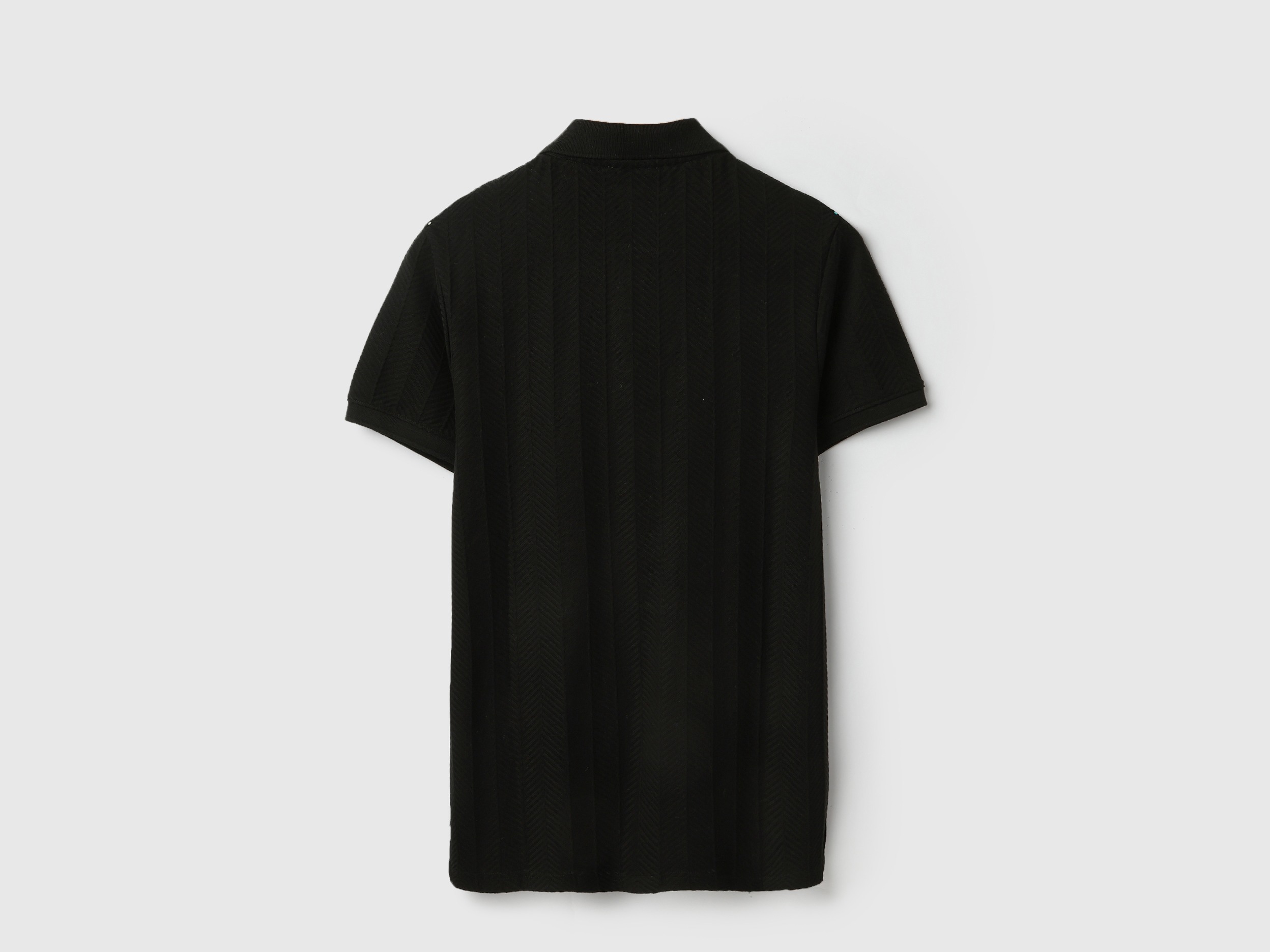 Discover timeless style with our black jacquard t-shirt for men. Featuring a regular fit and herringbone pattern, this short-sleeve polo neck shirt is crafted from pure cotton for ultimate comfort. The button closure adds a classic touch, making it perfect for both casual outings and smart occasions. Elevate your wardrobe today.