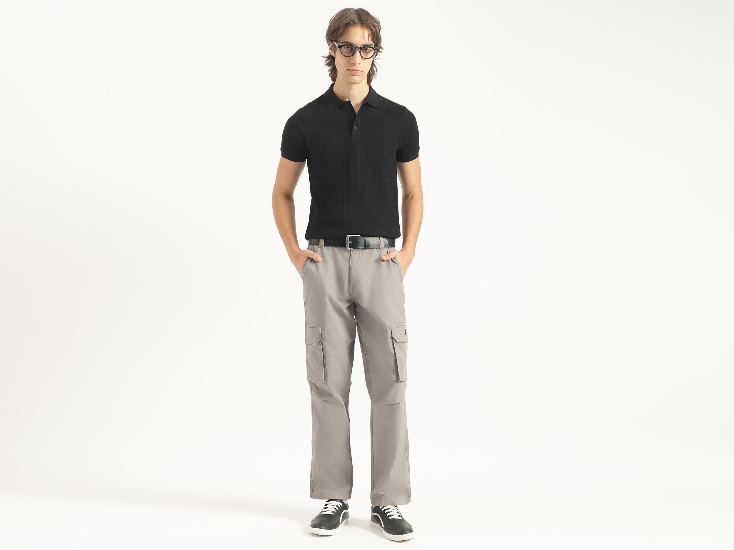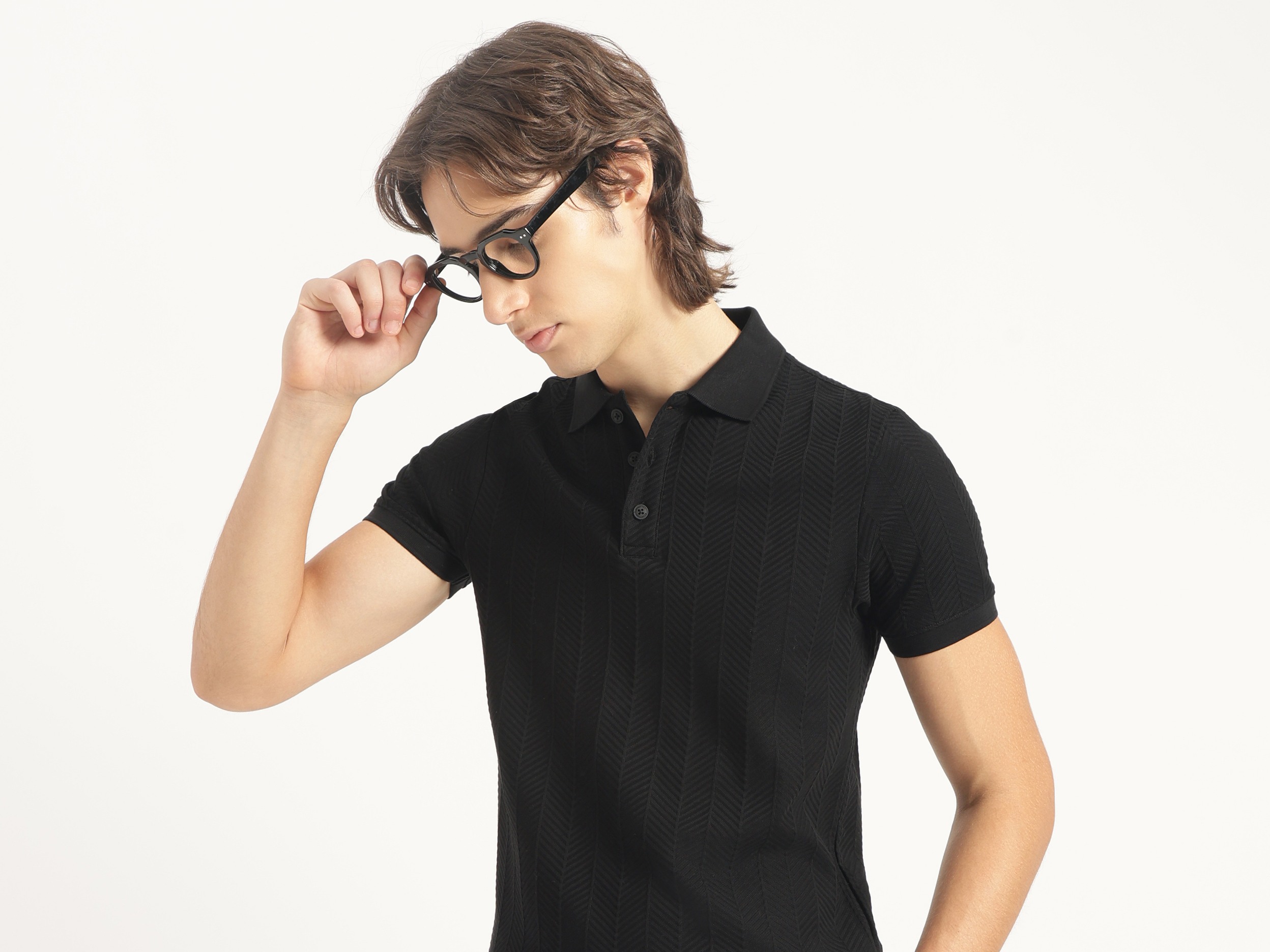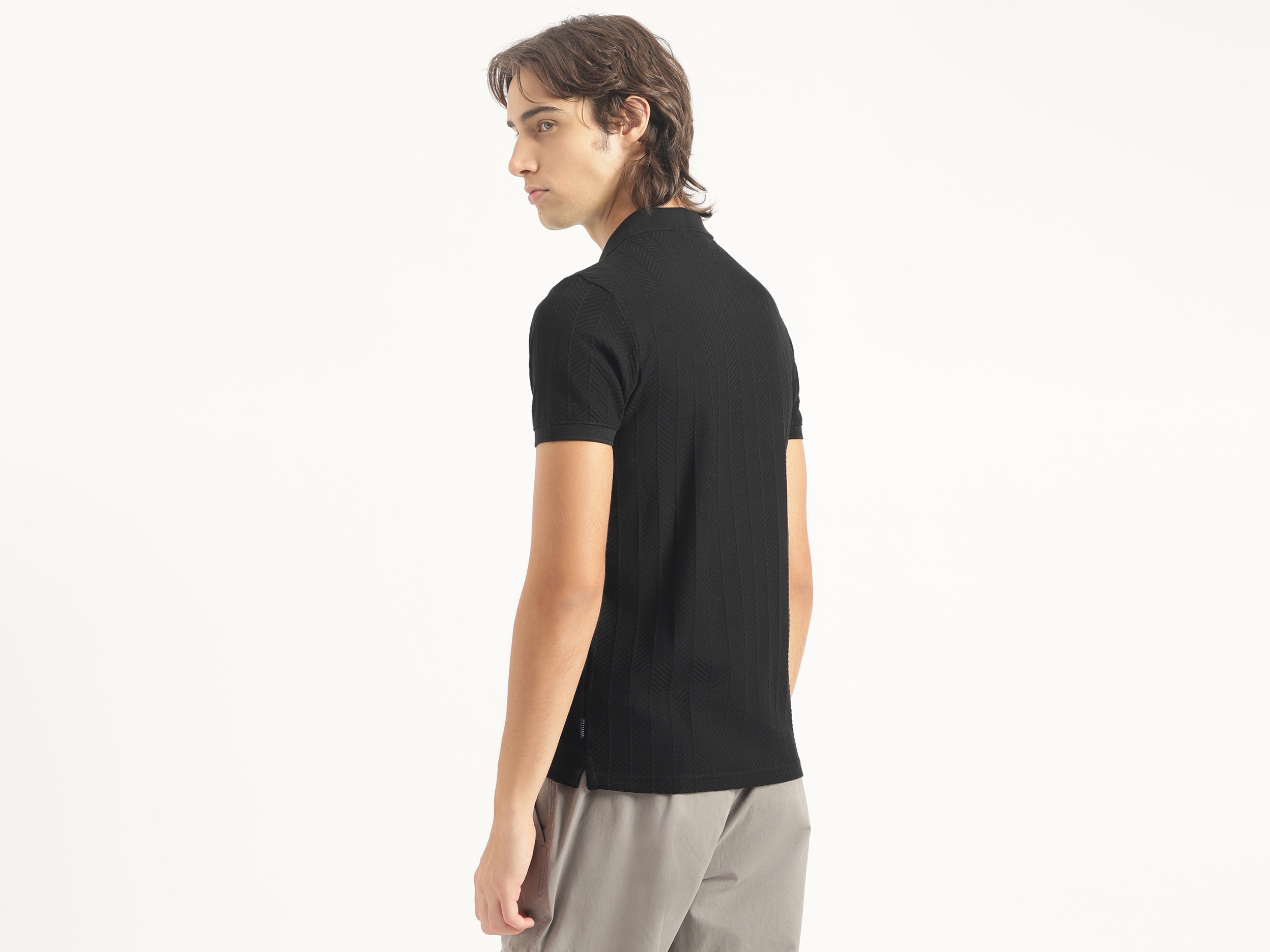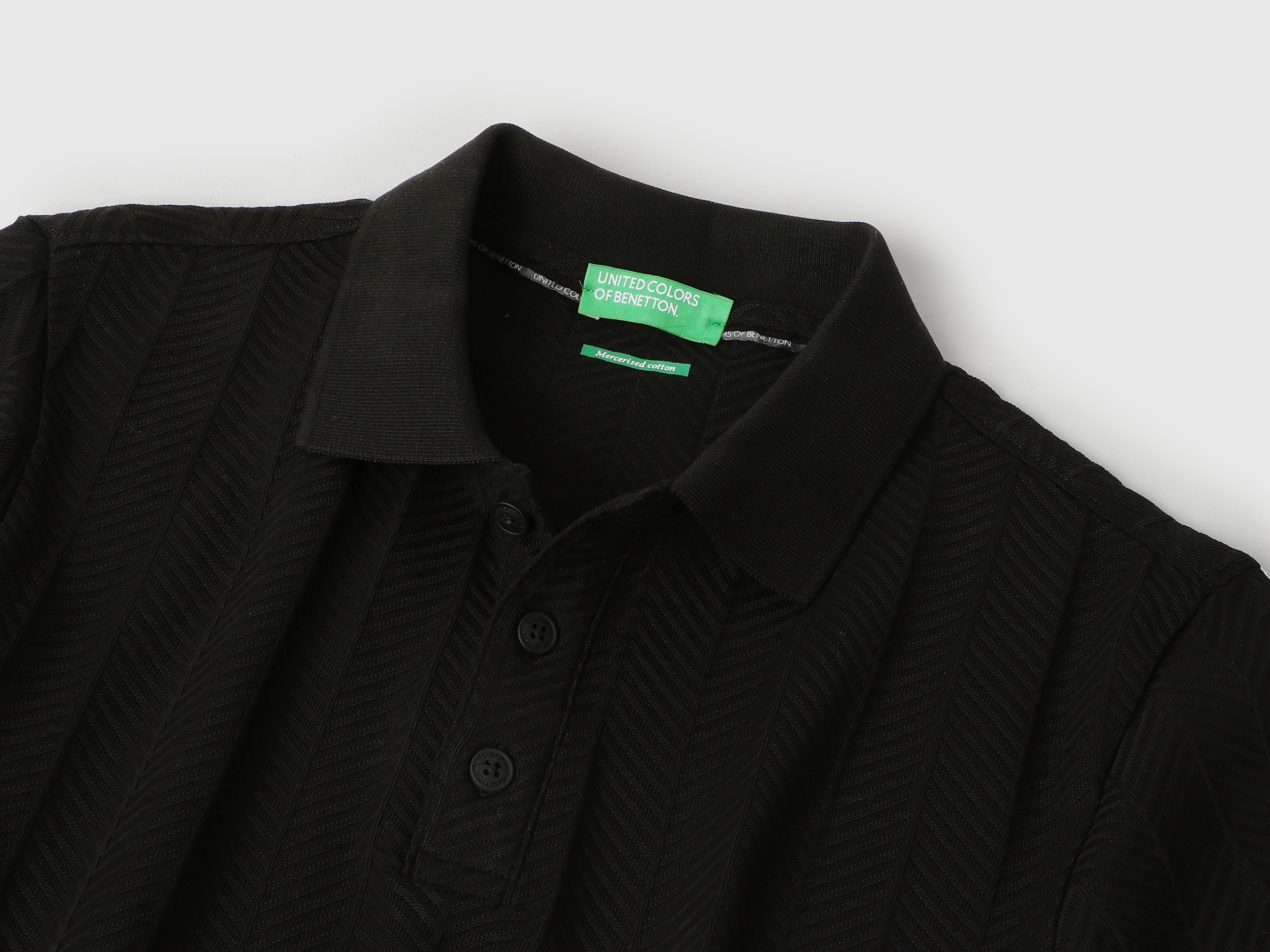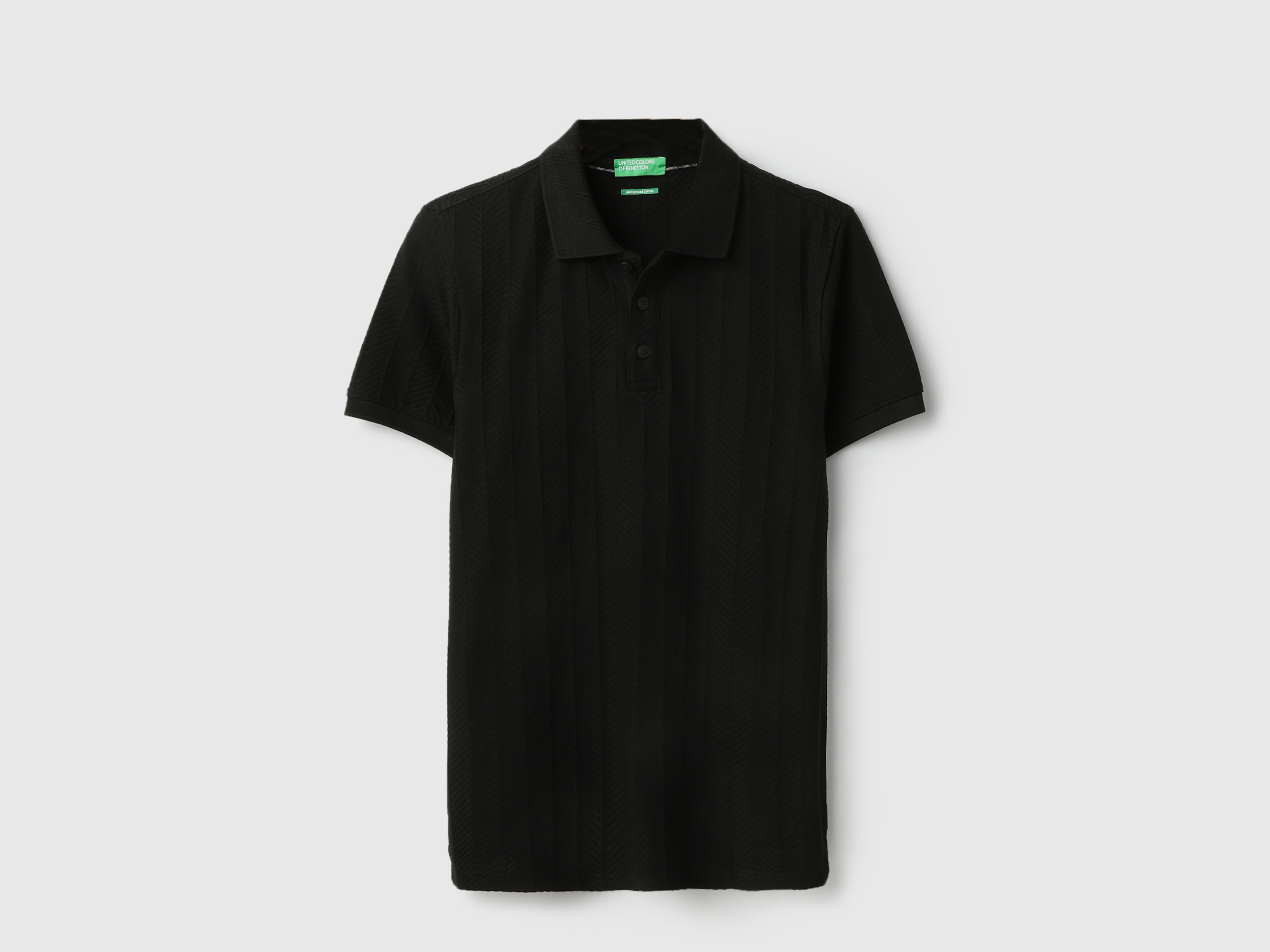 Discover timeless style with our black jacquard t-shirt for men. Featuring a regular fit and herringbone pattern, this short-sleeve polo neck shirt is crafted from pure cotton for ultimate comfort. The button closure adds a classic touch, making it perfect for both casual outings and smart occasions. Elevate your wardrobe today.