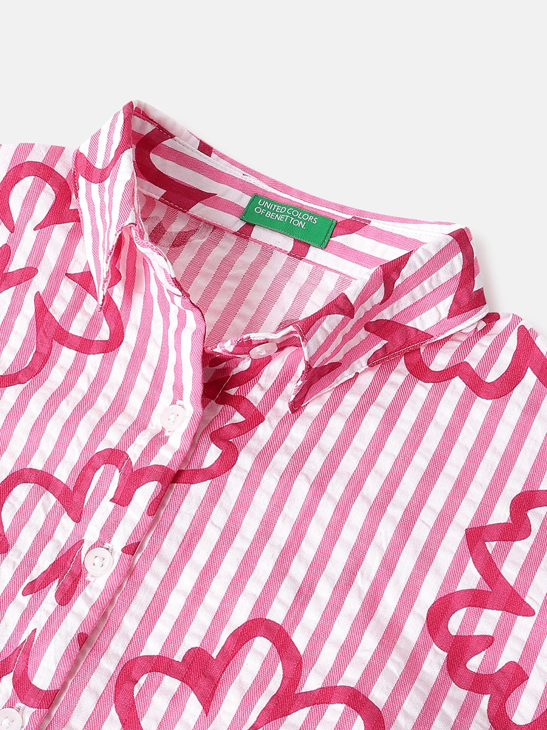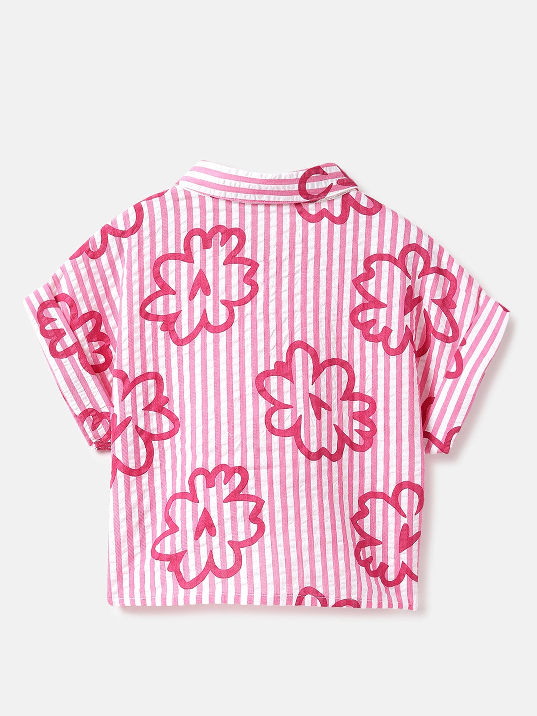 Discover the charm of our pink seersucker shirt style top, featuring a delightful floral print. Designed with a regular fit, this short sleeve top offers a comfortable round neck and convenient button closure. Made from pure cotton, it's perfect for girls seeking style and comfort in one versatile piece.