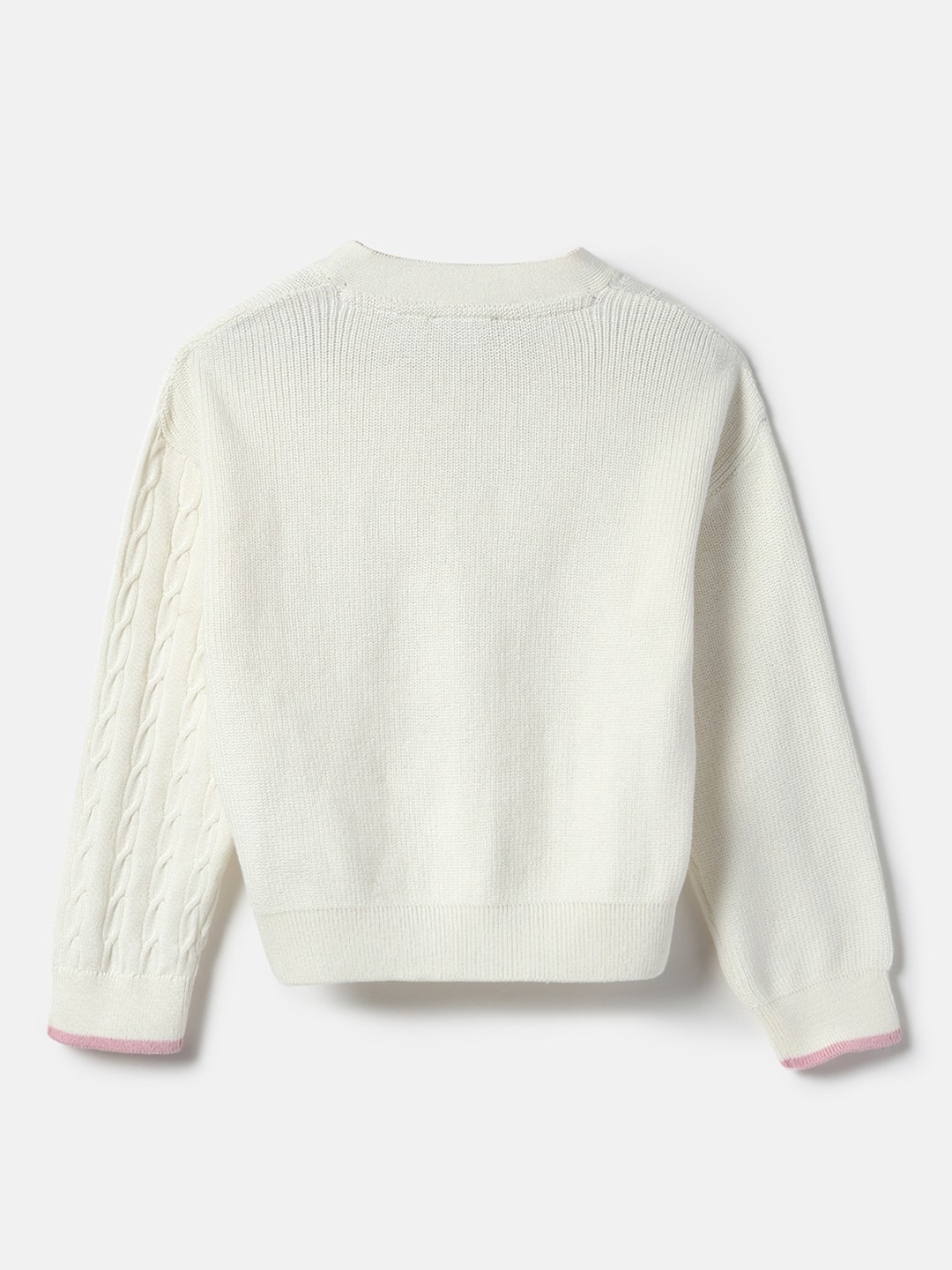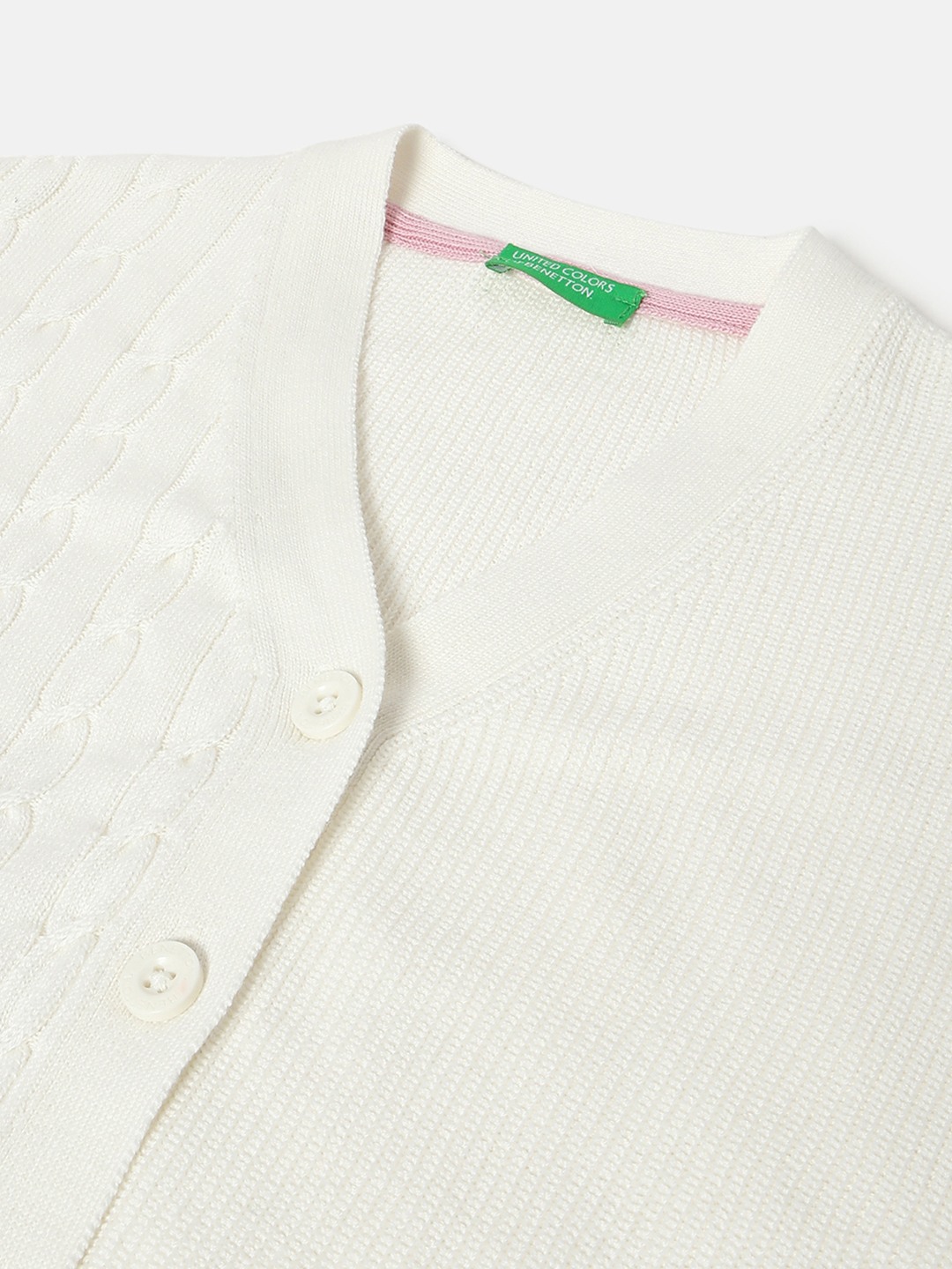 Discover the perfect blend of comfort and style with our white cardigan for girls. Crafted from pure cotton, this regular fit piece features a classic knitted pattern, full sleeves, and a chic V-neck. The button closure adds a touch of elegance, making it ideal for any occasion.