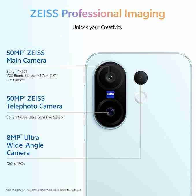 [MAIN CAMERA]: 50MP ZEISS Main Camera with upto 100x Zoom | 3x Optical Zoom | Sony IMX882 Ultra-Sensitive Sensor | f/2.65 Ultra-Large Aperture, 50MP Ultra Sensing Camera | Sony IMX921 VCS Bionic Sensor | f/1.88 | Optical Image Stabilization (OIS), 8MP Ultra Wide-Angle Camera | Ultra field of view | Rear studio-quality aura light: Smart 3D fill light | Intelligent color temperature adjustment (1800–5200K) automatically adapts to ambient lighting, ensuring harmonious tones between subjects and backgrounds | Front camera: 50MP AF, f/2.0 [DISPLAY]: 6.31 inches (16.04cm) AMOLED display for immersive viewing experience | 94.4% screen to body ratio, in-display optical fingerprint sensor | Schott Xensation Core | 5000 Nits brightness | 1.5K resolution | Netfilx HDR | 2160 Hz high-frequency PWM dimming [MEMORY& SIM]: 12GB RAM | 256GB internal memory internal memory | LPDDR5X | UFS 3.1 [BATTERY]: 6500 mAh battery with 90W fast charging [SECURITY]: In-display optical fingerprint sensor [PROCESSOR]: MediaTek Dimensity 9300+ |Super-large 3800 mm² VC heat dissipation area | LPDDR5X | Immortalis-G720 with DVS technology minimize heat during graphic intensive tasks with Gemini Assistant