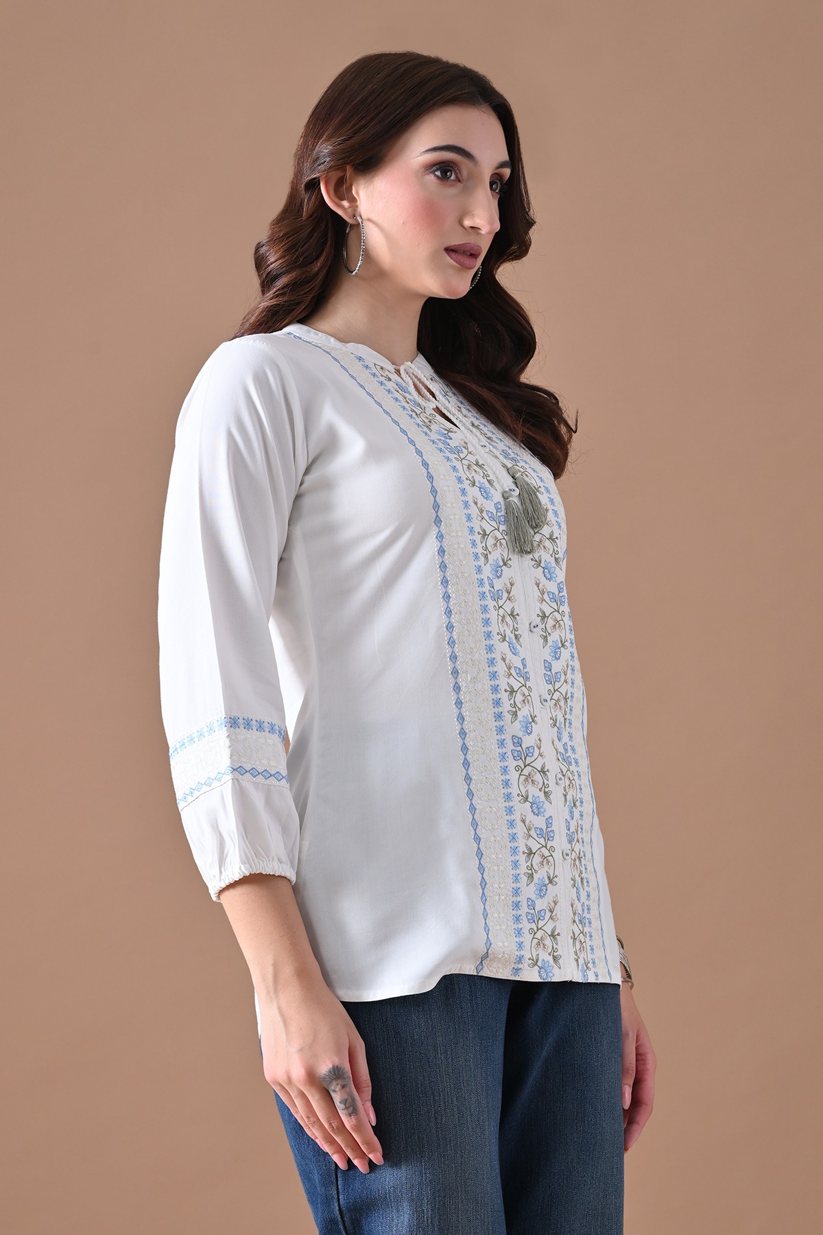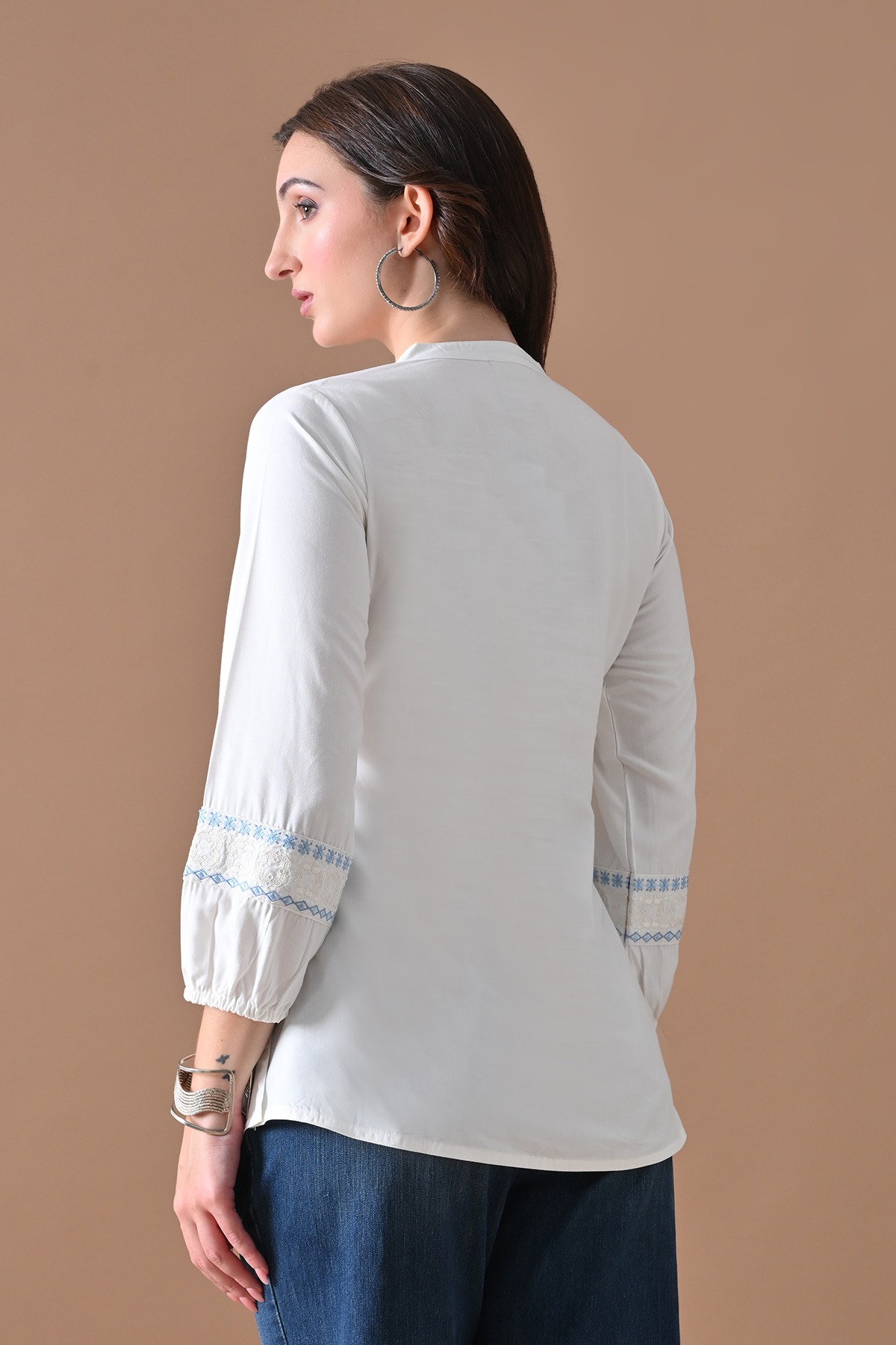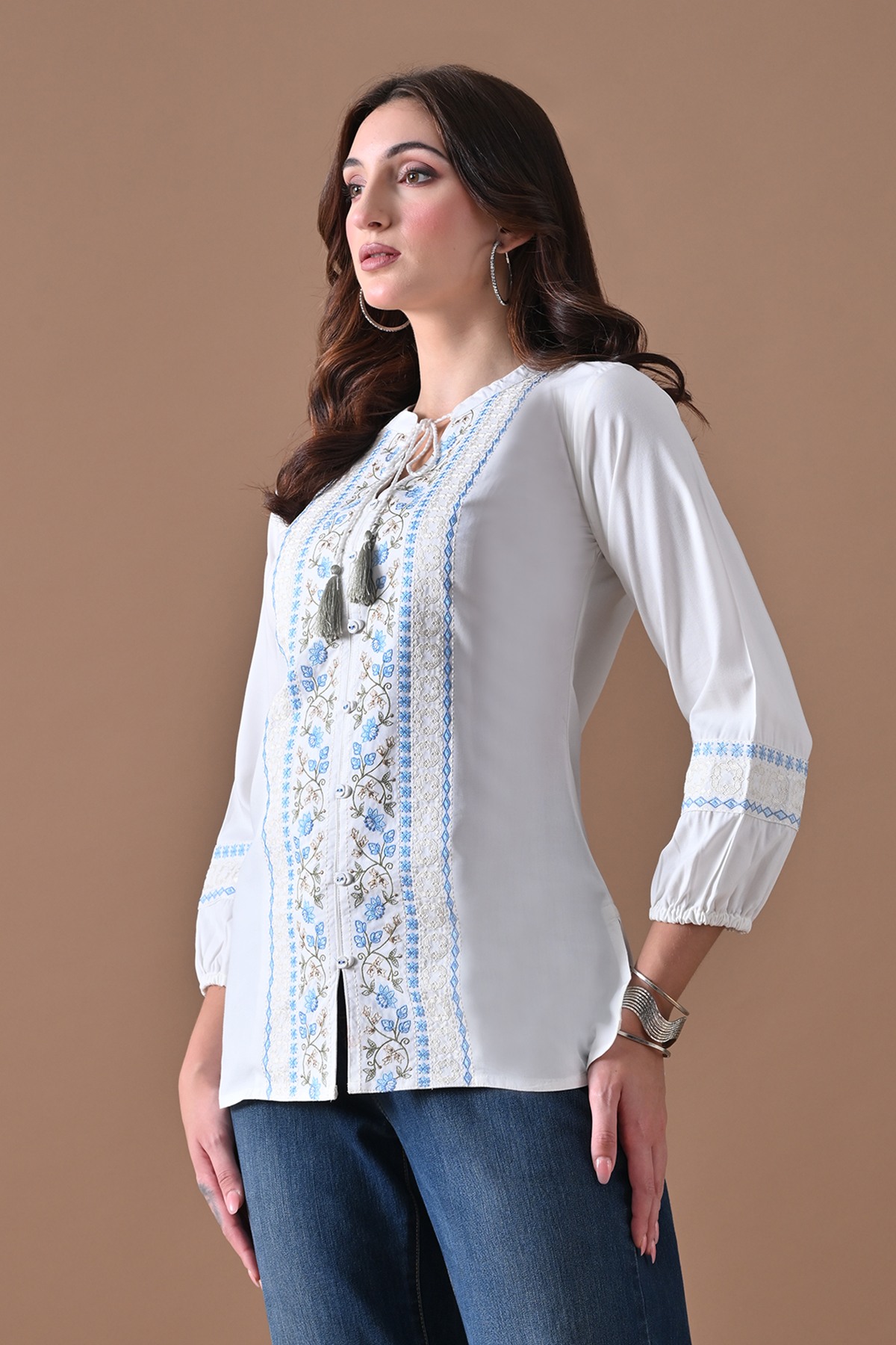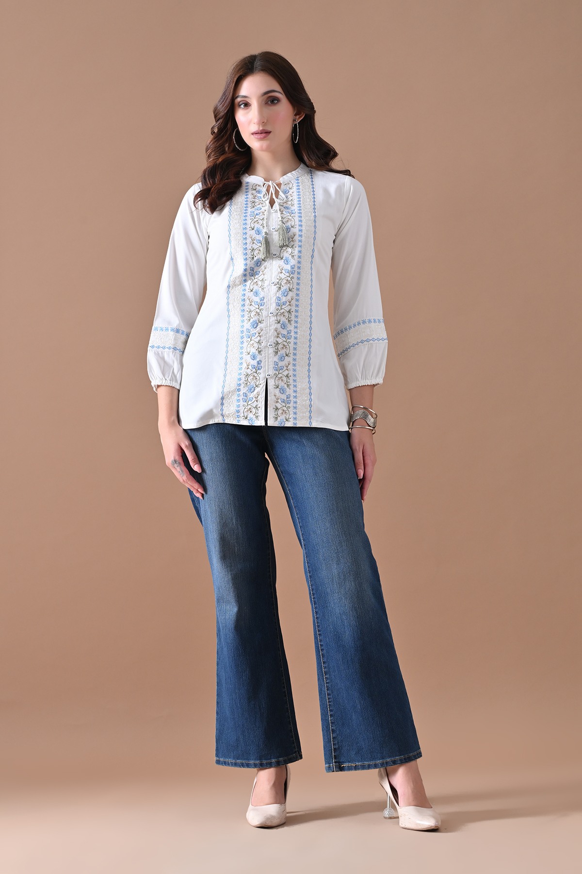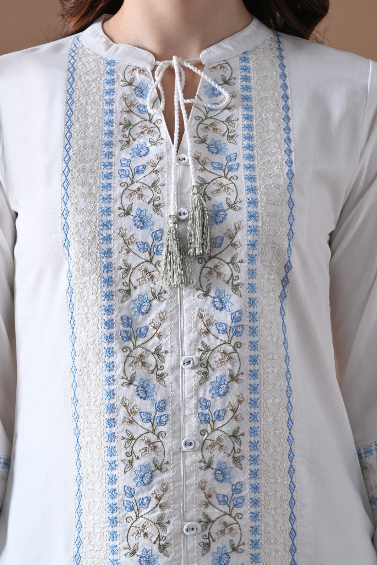 This white embroidered straight top features a classic mandarin collar adorned with a dori, three quarter sleeves, straight hemline, and multi slits. designed with chic detailing and contemporary elegance, it’s a versatile piece—perfect for elevating both casual outings and semi-formal occasions.