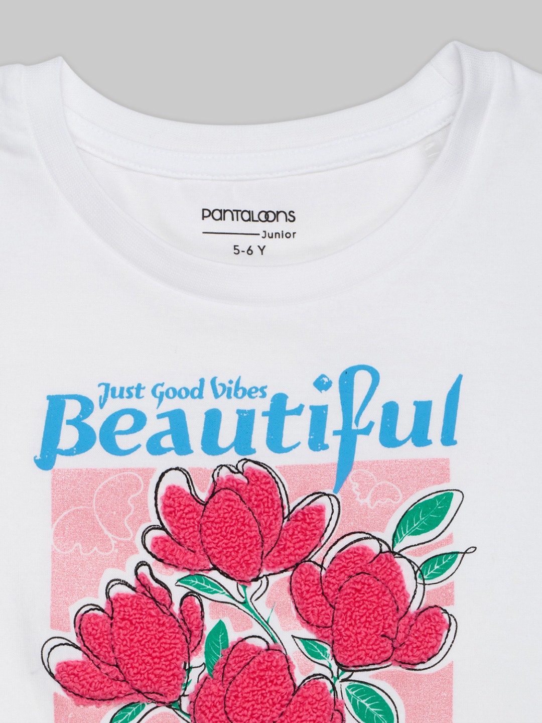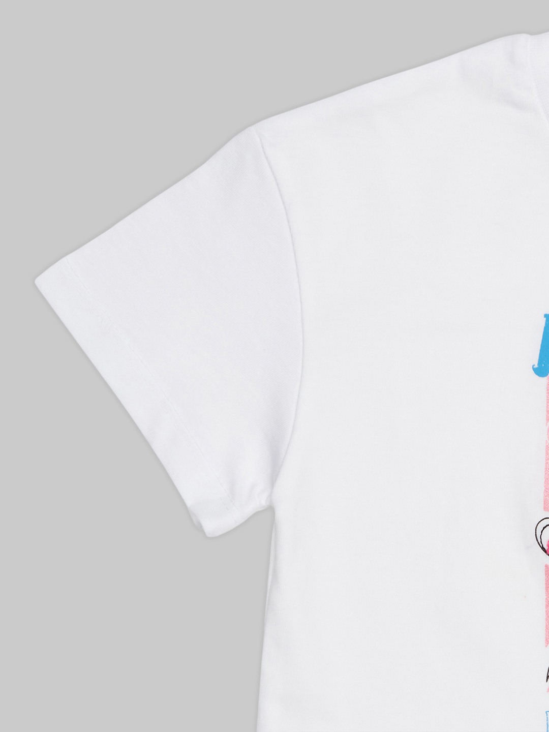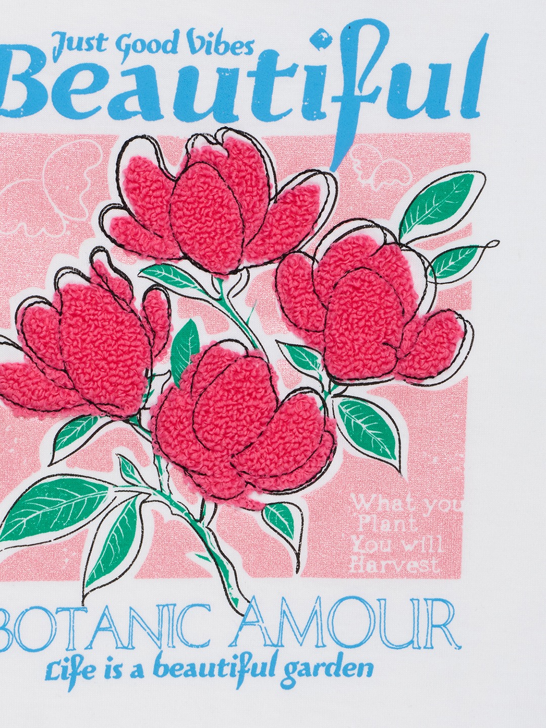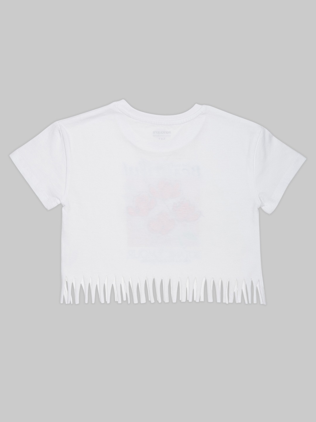 A daily classic with a fun, fashion-forward twist. The cropped silhouette features a bold floral graphic with uplifting text, while the fringe hem adds playful movement and a standout finish. Soft and lightweight, it keeps the look easy and breezy for warm days.