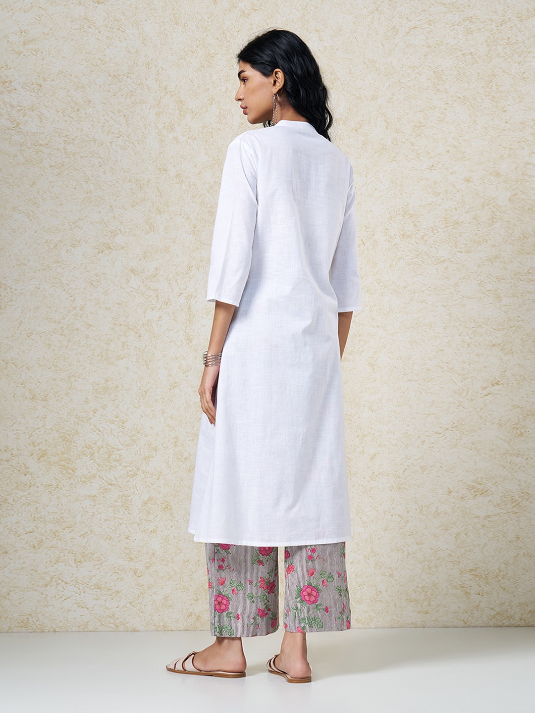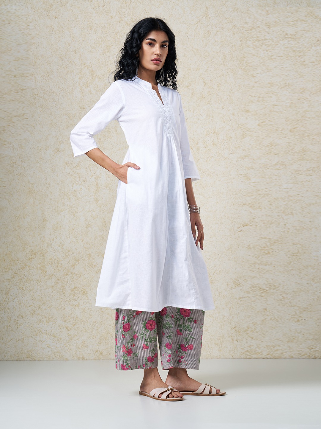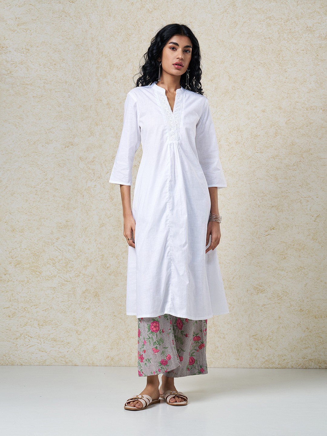 Clean minimalism meets quiet artisanal detail in a refined ethnic silhouette. Designed with a band collar and notch neckline and 3/4 sleeves elevated by tonal lace trim along the front placket with subtle gathers for soft volume. Lightweight woven construction offers a breathable hand feel with a fluid, graceful drape.