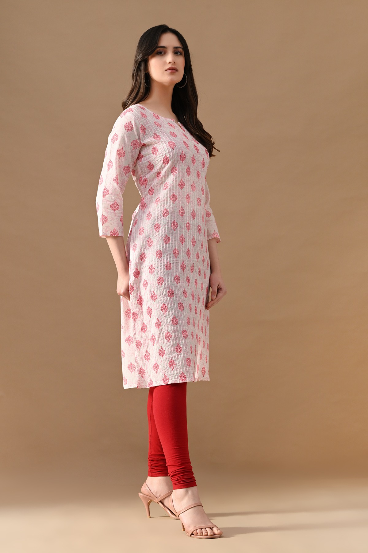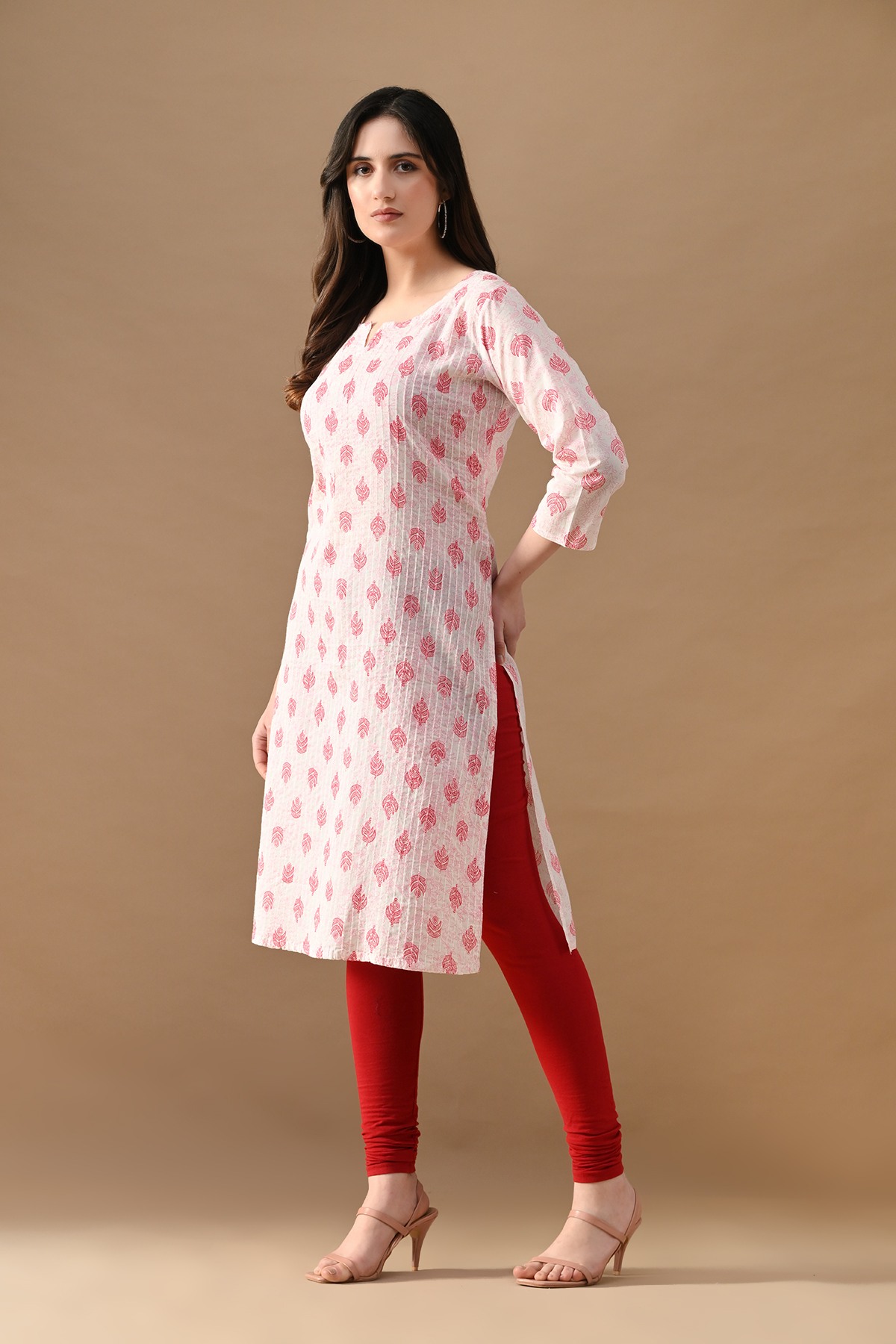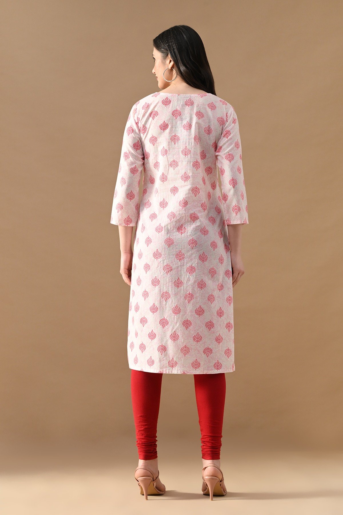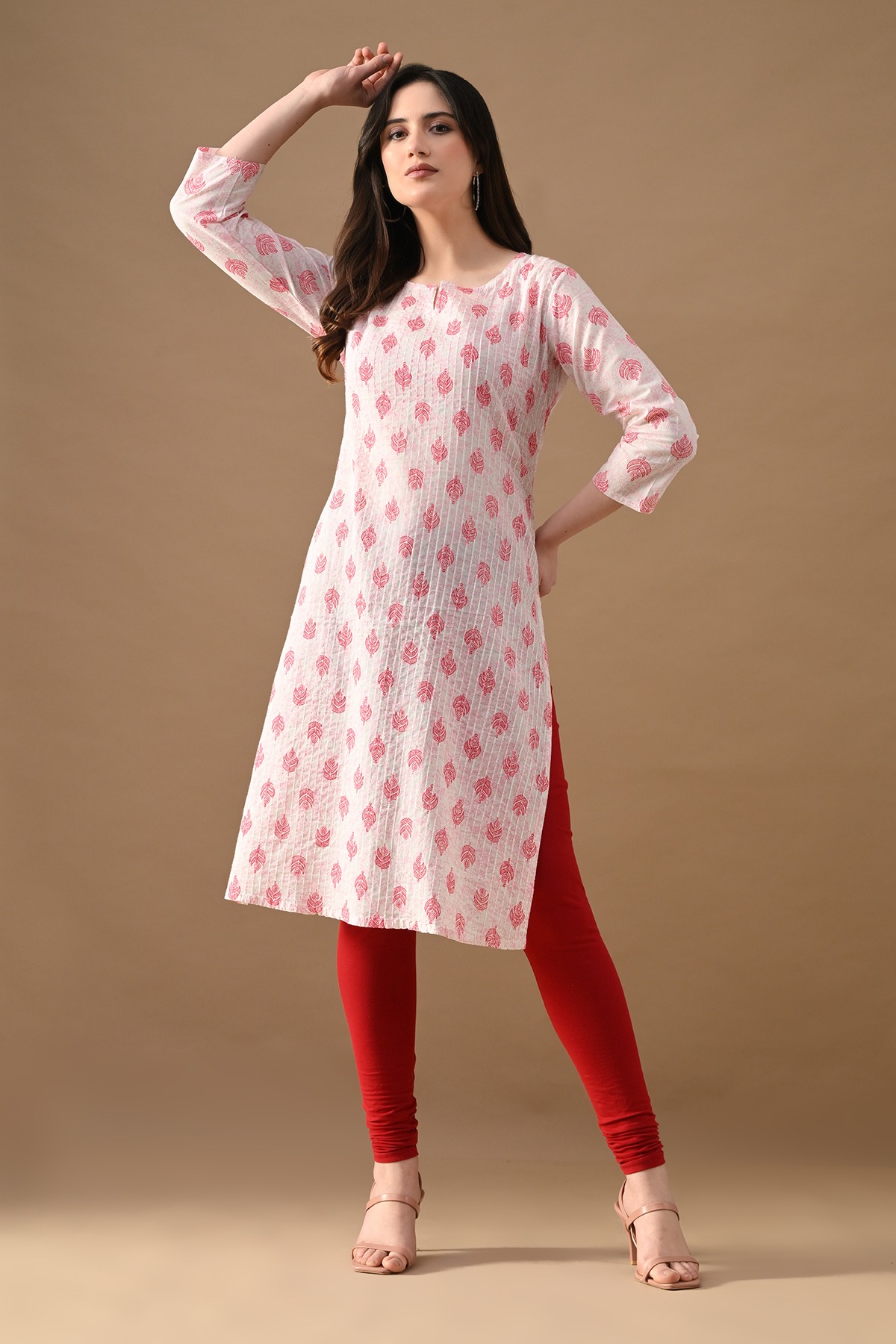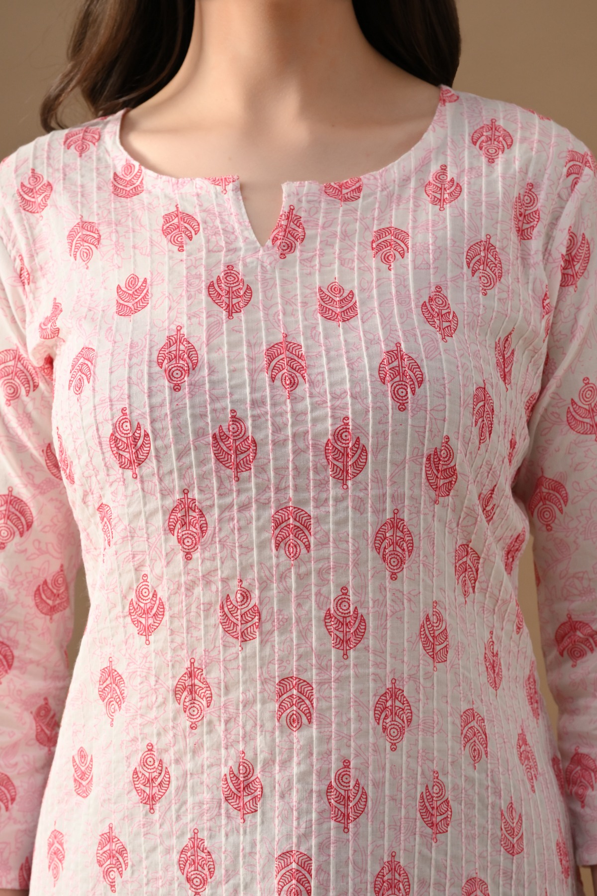 Step out in effortless charm with our white printed kurta with pintex pattern. designed with round neckline with a slit, three-quarter sleeves, side-slits, and a straight hemline. this versatile piece beautifully blends comfort with elegance—making it perfect for casual outings.