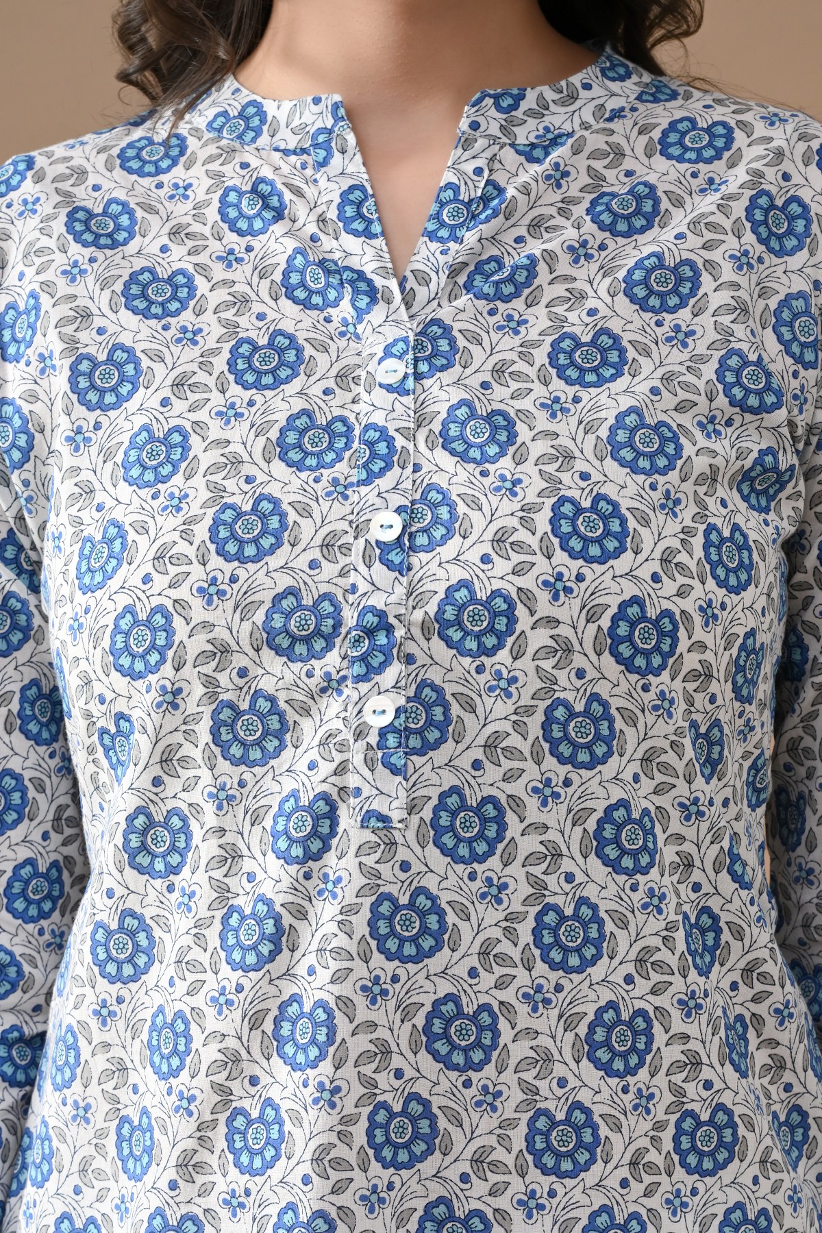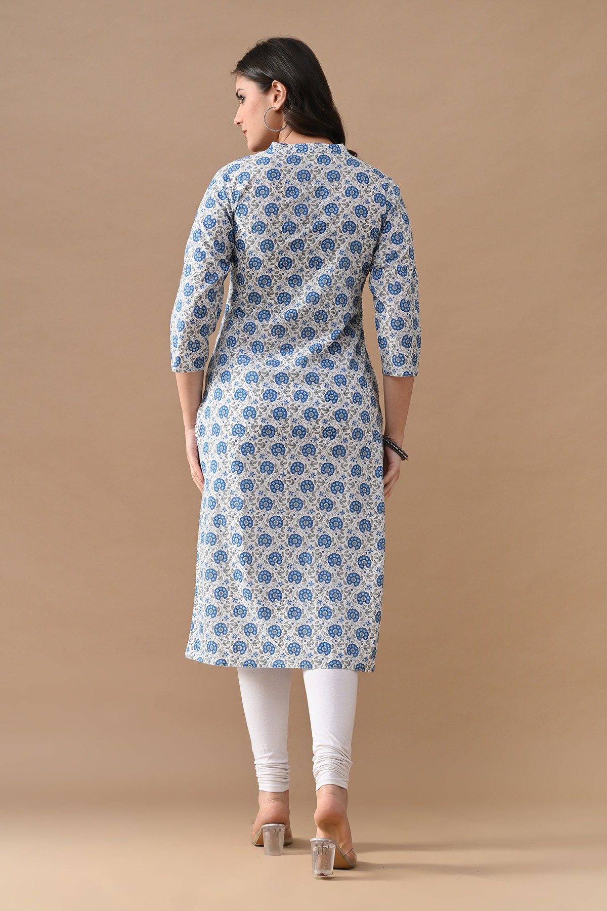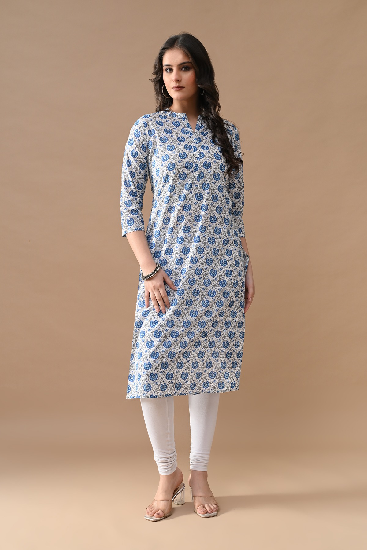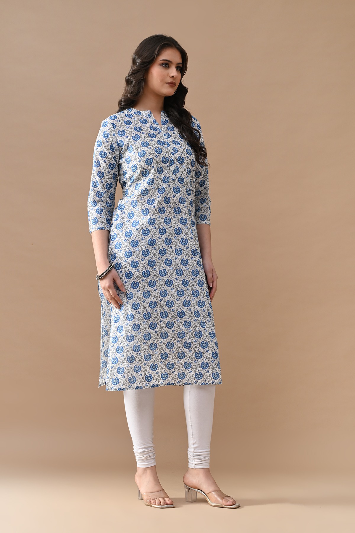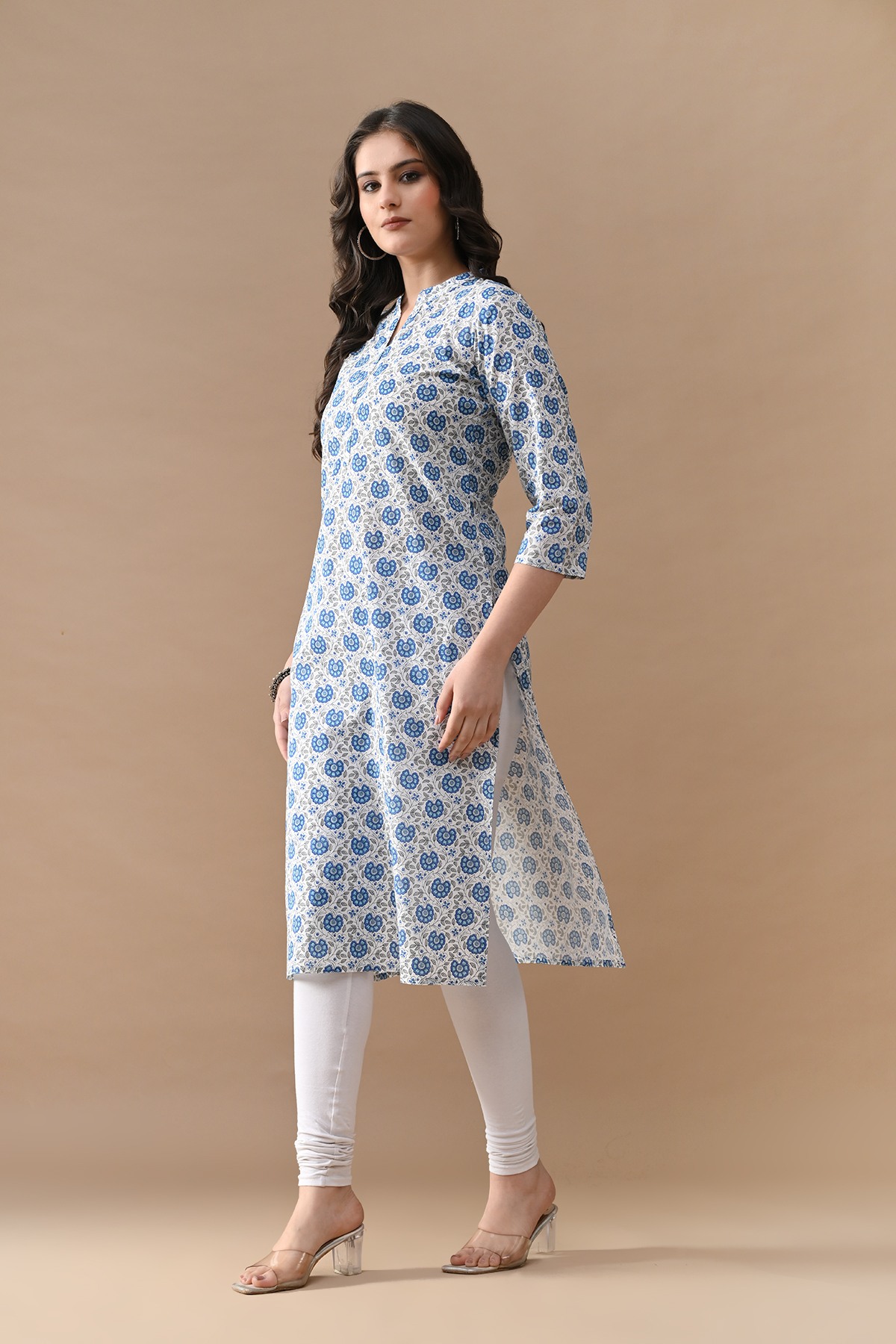White floral printed straight kurta featuring a classic mandarin collar, three-quarter sleeves, a straight hemline, button-down closure and side slits. elegant and stylish, it’s perfect for casual and semi-formal occasions, ensuring comfort with a touch of sophistication.