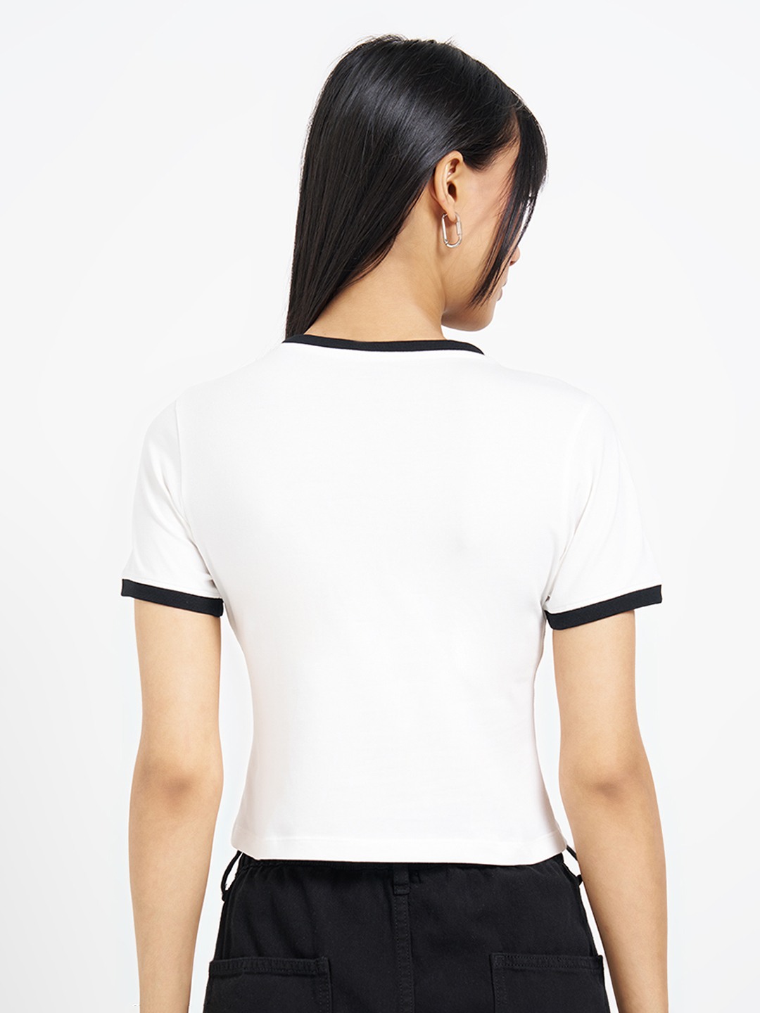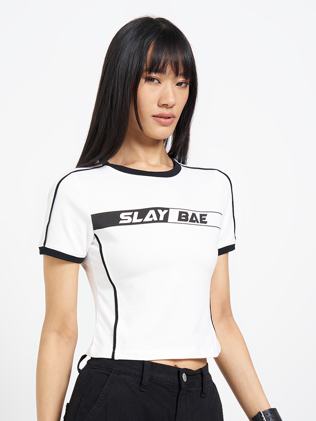 Sharp, graphic, and cut to contour. Designed with a crew neck and half sleeves, it features contrast binding at the neckline and sleeves, a slogan chest print, and panelled seams that shape the cropped silhouette. Stretch knit construction delivers a smooth, flexible feel.