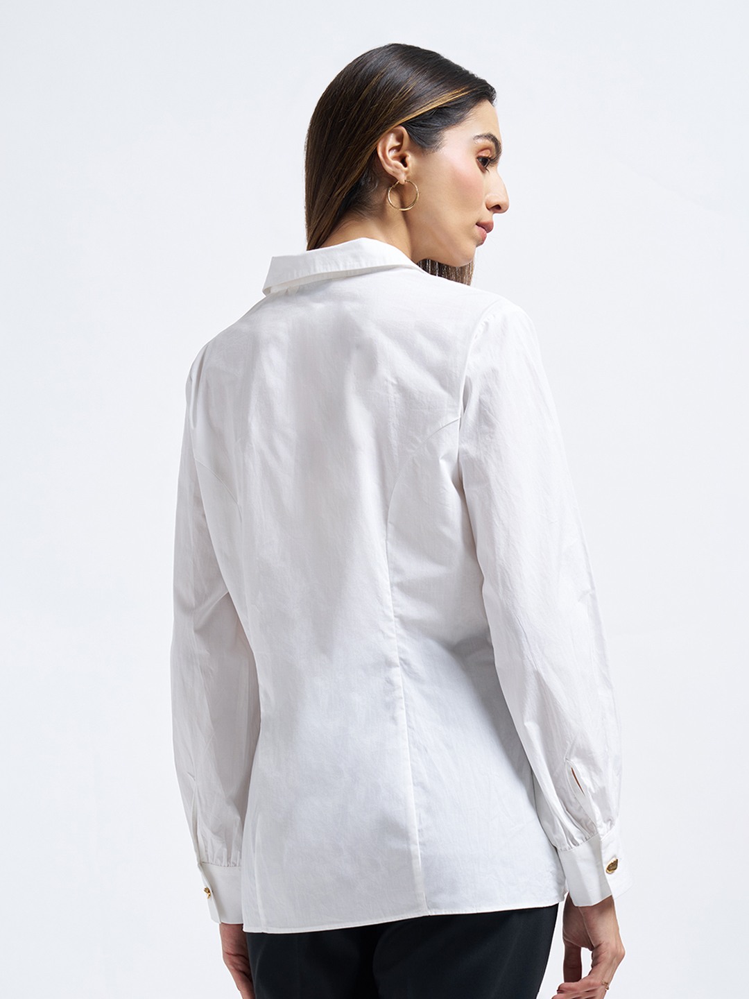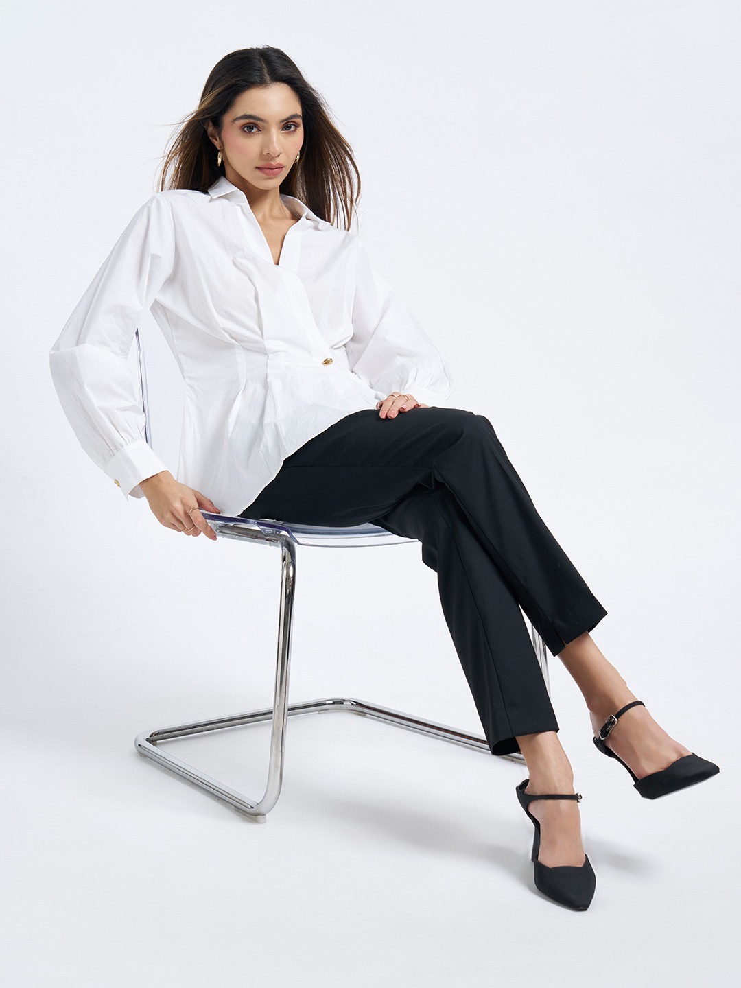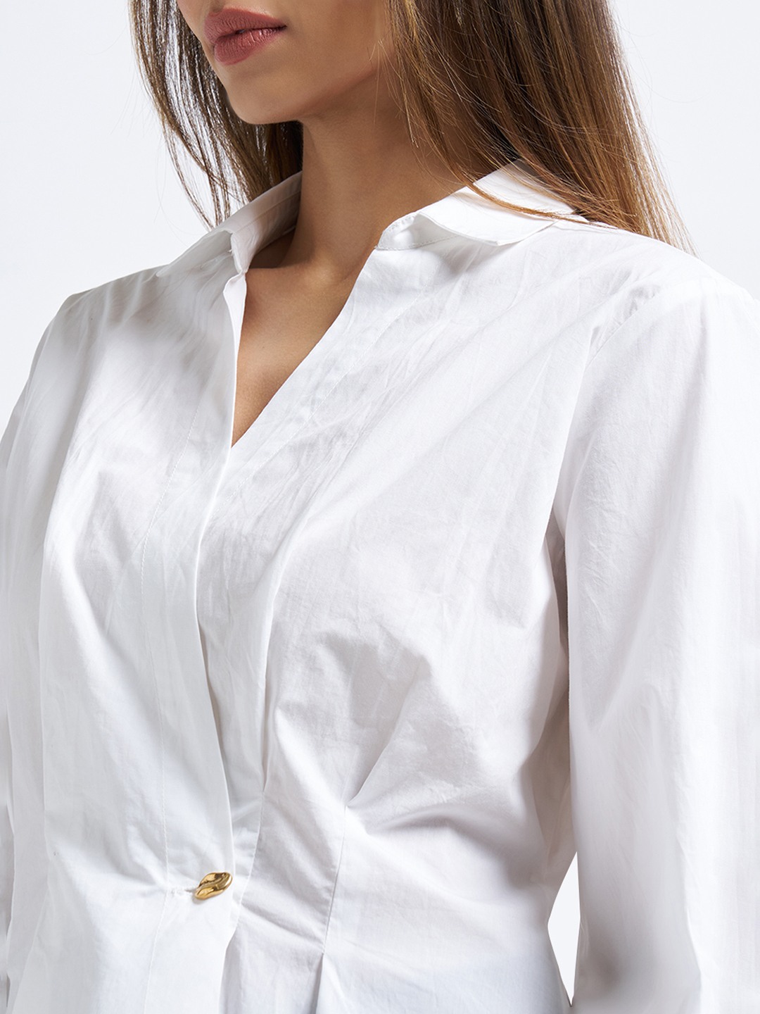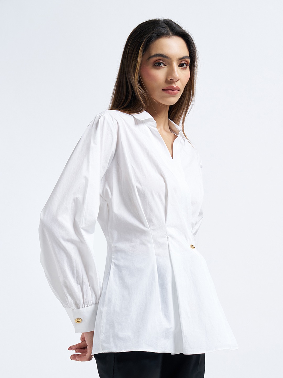 A modern take on refined dressing, this wrap-style shirt shapes the silhouette with effortless elegance. The pleated peplum waist, V-neck front and structured collar are accented by a single metallic trim, giving it a tailored yet feminine finish. Crisp, lightweight fabric ensures a polished look that moves with ease.