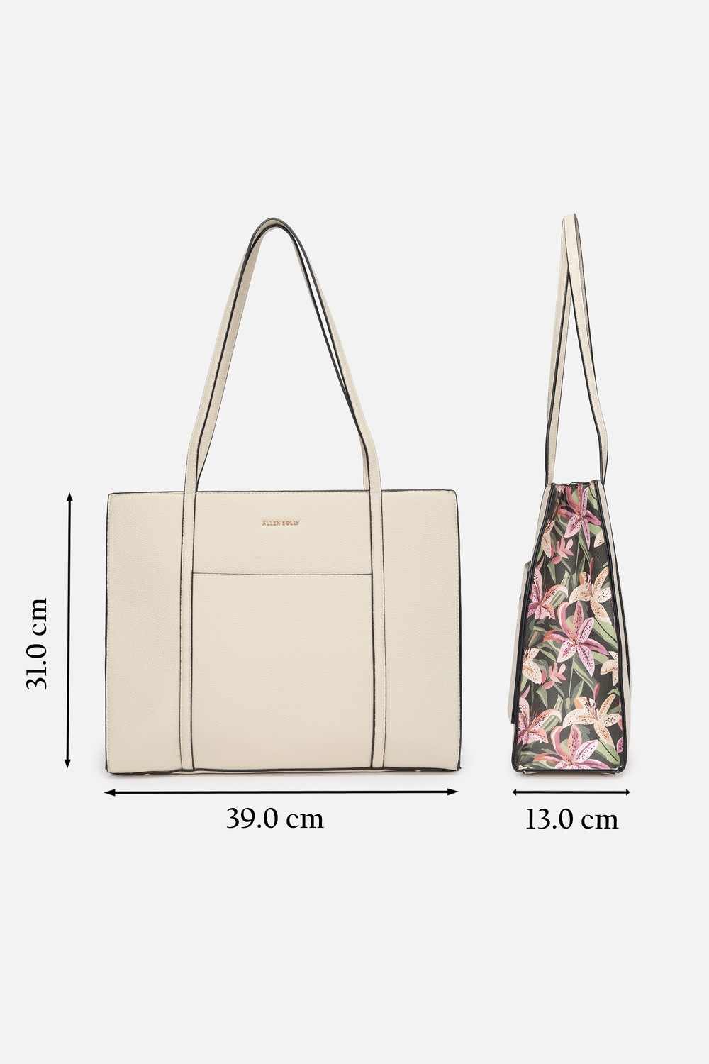 Impeccably fashioned from vegan leather, this sophisticated beige handbag from Allen Solly is a must-have for formal occasions. Its elegant print adds a touch of modernity, making it a stylish companion for your tailored ensembles. Designed for functionality without sacrificing style, this handbag offers ample space to carry your essentials while ensuring you make a chic statement wherever you go. Elevate your accessory game with this key piece that embodies both refinement and practicality.