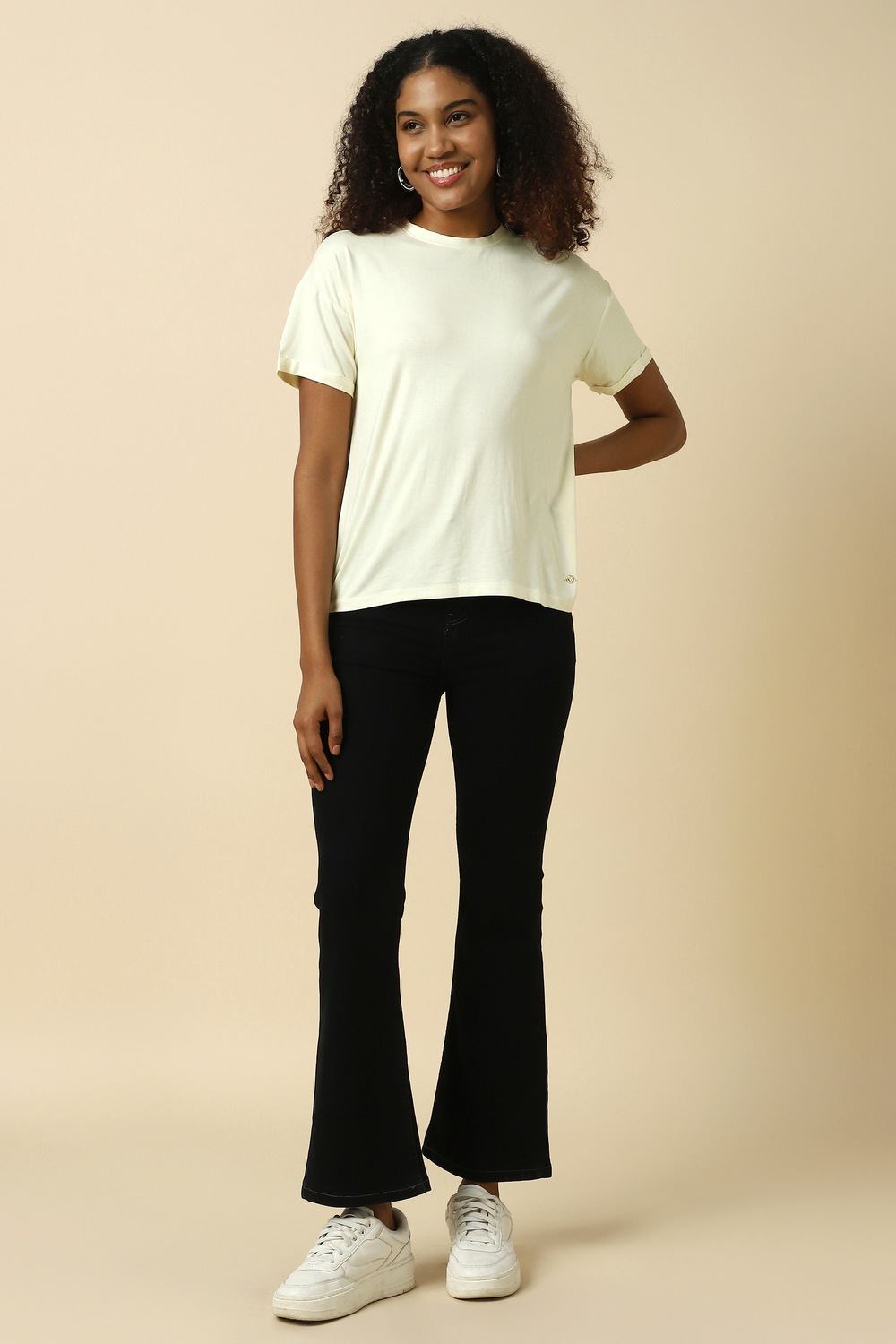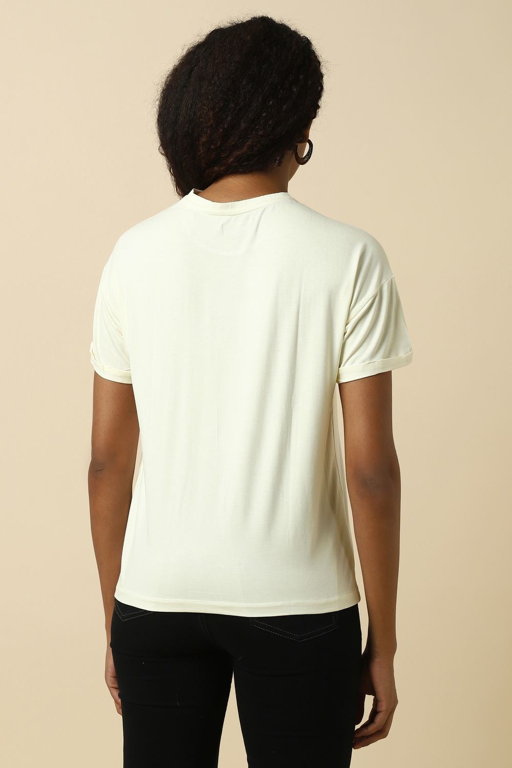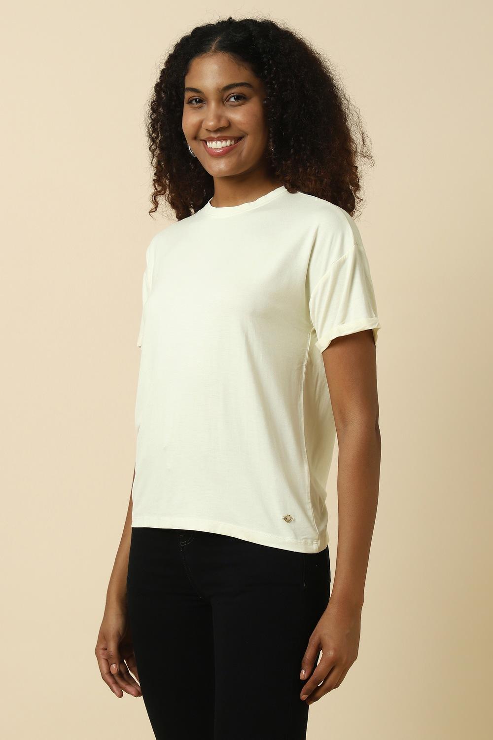 Introducing the Allen Solly women`s t-shirt in beige, a perfect blend of comfort and style. Crafted from soft viscose and spandex, it offers a regular fit that drapes elegantly on the body. The solid round neck and short sleeves make it a versatile choice for casual outings. Pair this t-shirt with your favorite jeans or shorts for an effortlessly chic look that celebrates simplicity and sophistication. Elevate your everyday style with this essential piece.