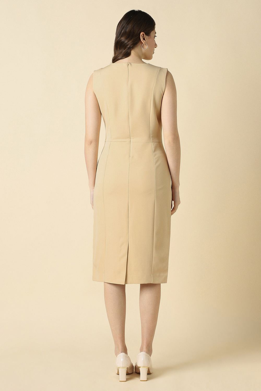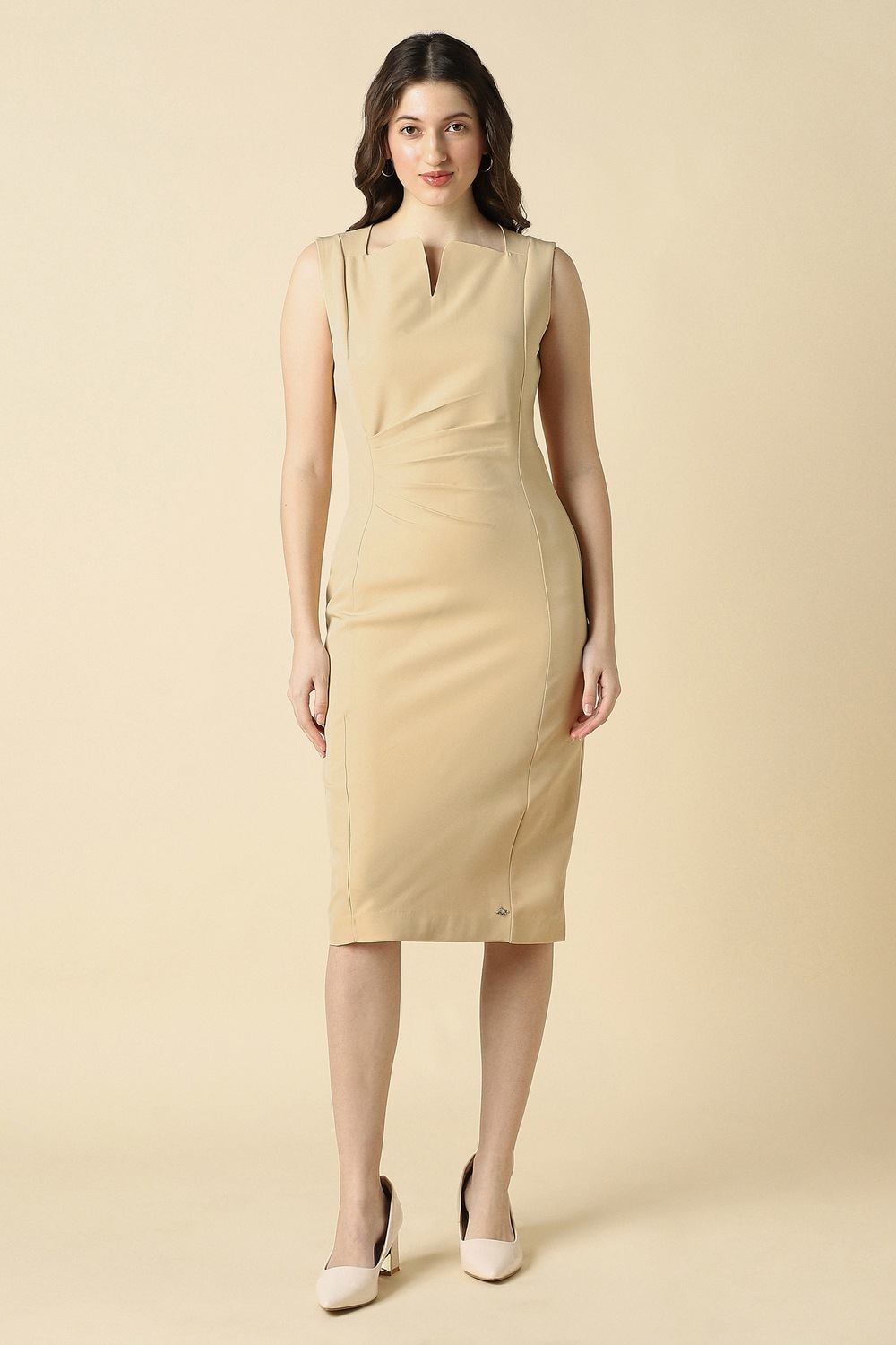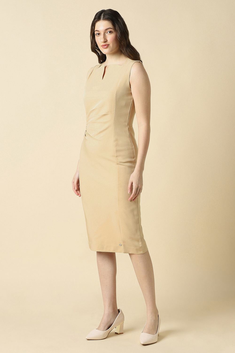 Impeccably designed for the modern woman, this beige dress from Allen Solly features a sophisticated slit neck and a solid pattern that radiates understated elegance. Crafted from a luxurious blend of polyester and spandex, it drapes beautifully to ensure comfort during formal occasions. The refined silhouette exudes confidence, making it a staple for any sophisticated wardrobe. Effortlessly transition from day to night, embracing the allure of timeless fashion.