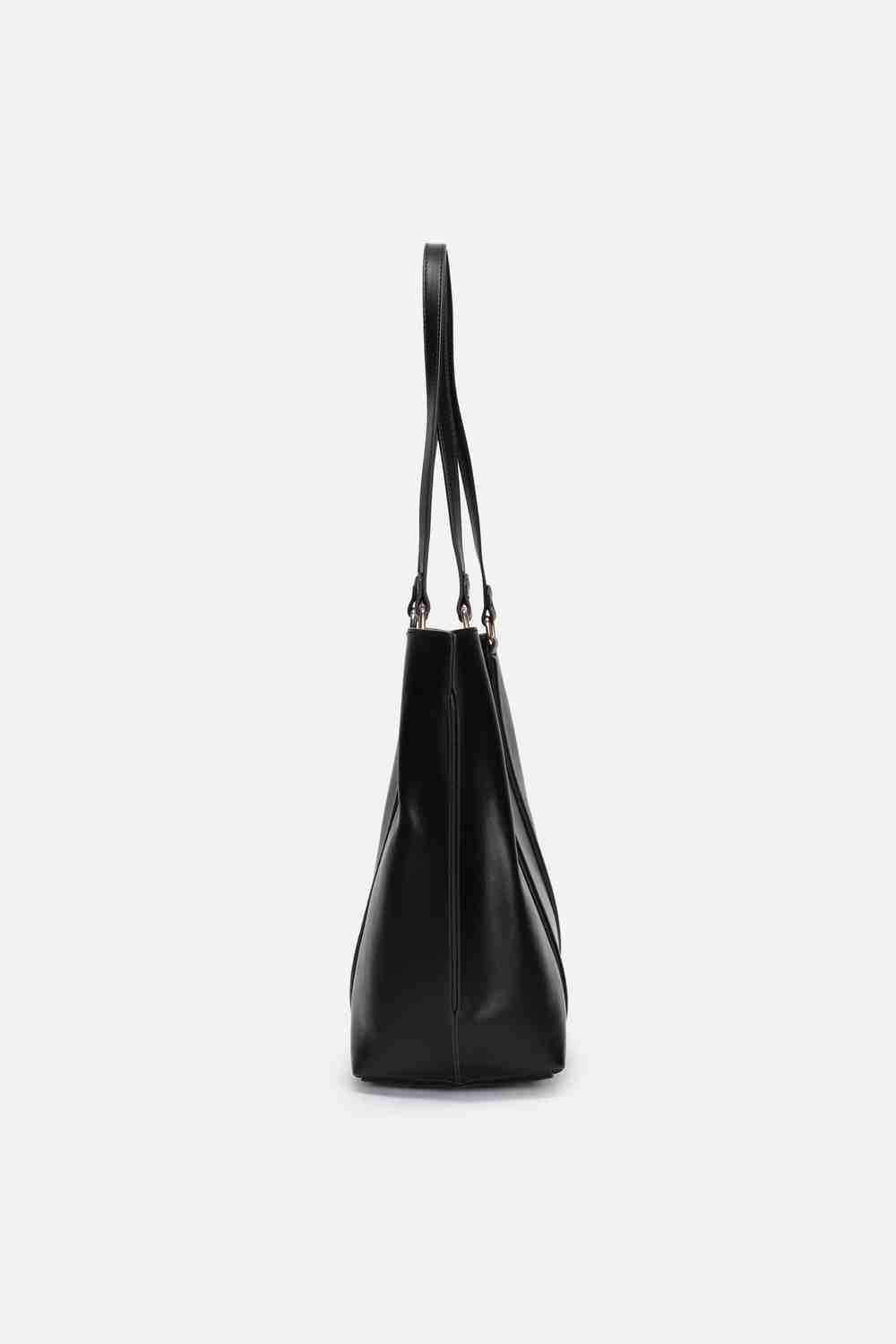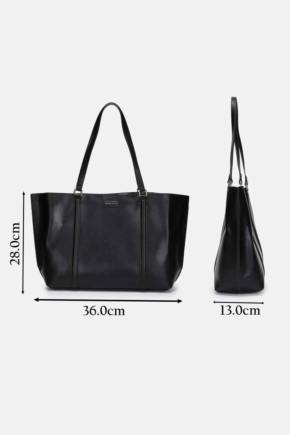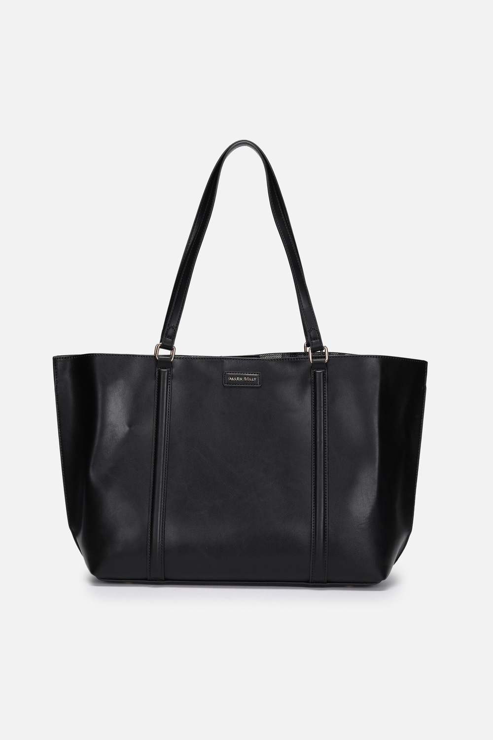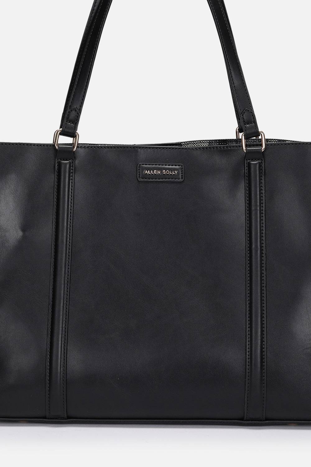 Introducing an exquisite handbag from Allen Solly, designed in sophisticated black vegan leather. This solid-patterned accessory is a quintessential companion for casual outings, reflecting an effortless style that enhances any ensemble. Meticulously made, it harmoniously blends functionality and chic appeal, offering practical space for your essentials without compromising on aesthetics. Complete your look with this elegant embodiment of modern luxury, perfect for the discerning woman who appreciates refined craftsmanship.