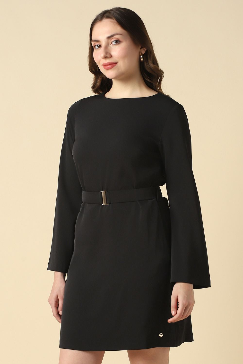 Embody sophistication with this chic black dress from Allen Solly. Crafted from an exquisite blend of cotton and elastane, it guarantees unmatched comfort for casual outings. The elegant boat neckline adds a touch of refinement, ensuring you make a style statement effortlessly. Perfect for day-to-night transitions, this solid-patterned piece effortlessly pairs with your favorite accessories. Elevate your everyday ensembles with a timeless silhouette that complements your modern lifestyle.