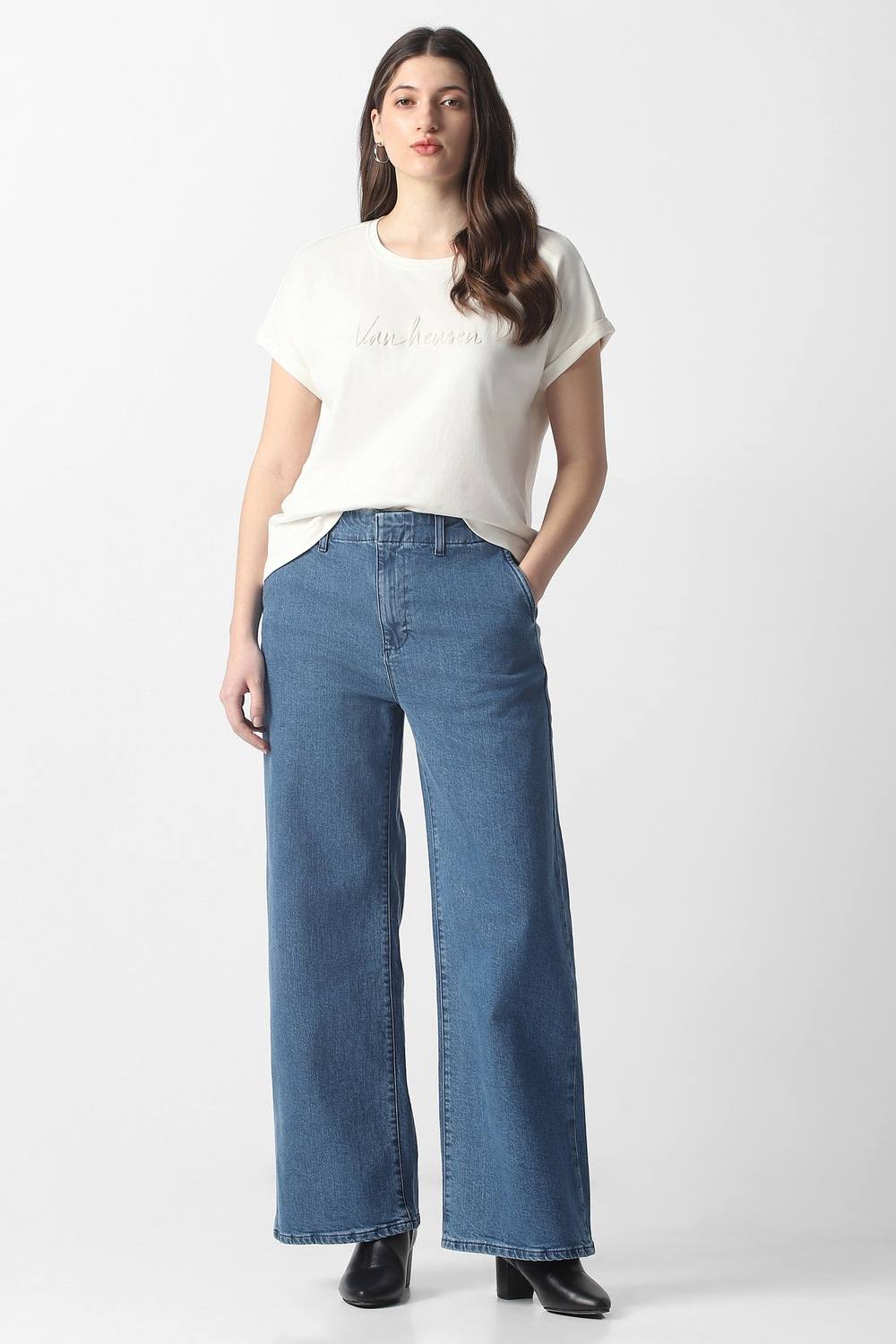 Indulge in sophisticated casual style with these blue jeans from Van Heusen, designed for the modern woman. The skilled combination of cotton and elastane promotes a flattering fit and all-day wearability, making them essential for effortless everyday elegance. Their versatile hue seamlessly pairs with a myriad of outfits, ensuring you radiate confidence in any setting. Perfect for casual outings, these jeans embody chic comfort and style for any occasion.