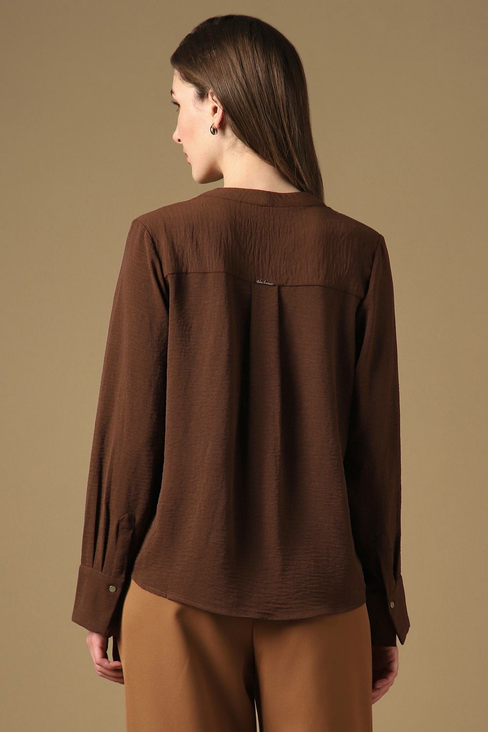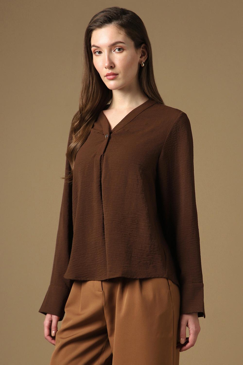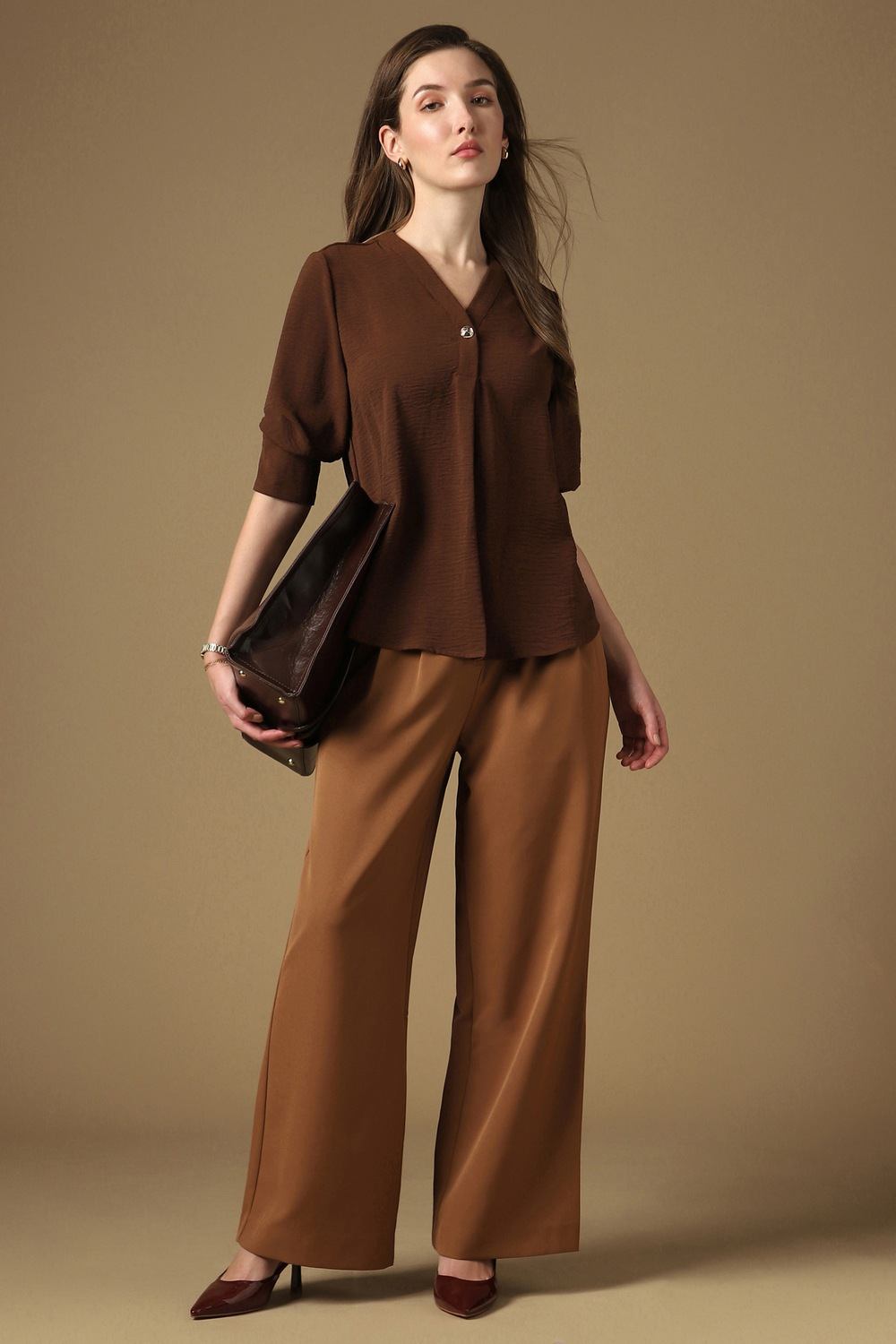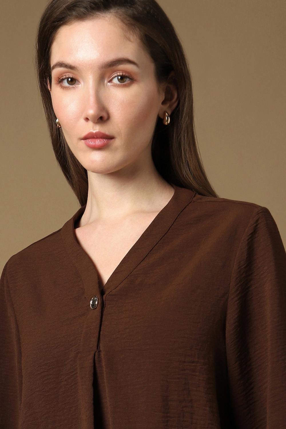 Exuding an effortless charm, this brown solid top from Van Heusen is a dynamic addition to your casual collection. Crafted from high-quality polyester, its soft, breathable fabric offers all-day wearability, allowing you to transition from day to evening with ease. The flattering V-neckline enhances your silhouette, while the sophisticated color makes it a versatile pairing for any casual ensemble. Experience elevated comfort and refined style with this essential piece.